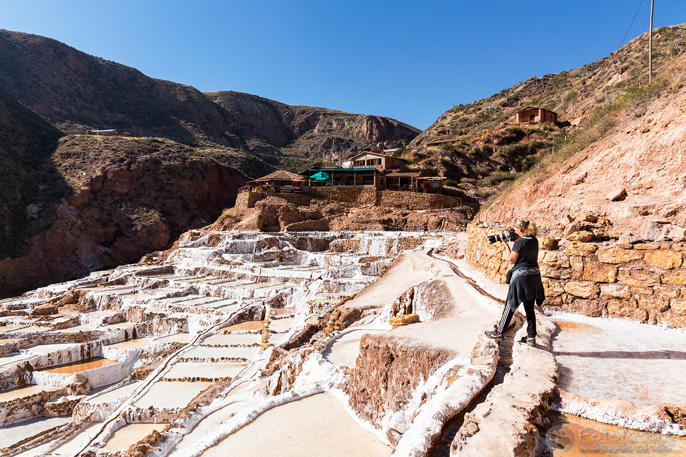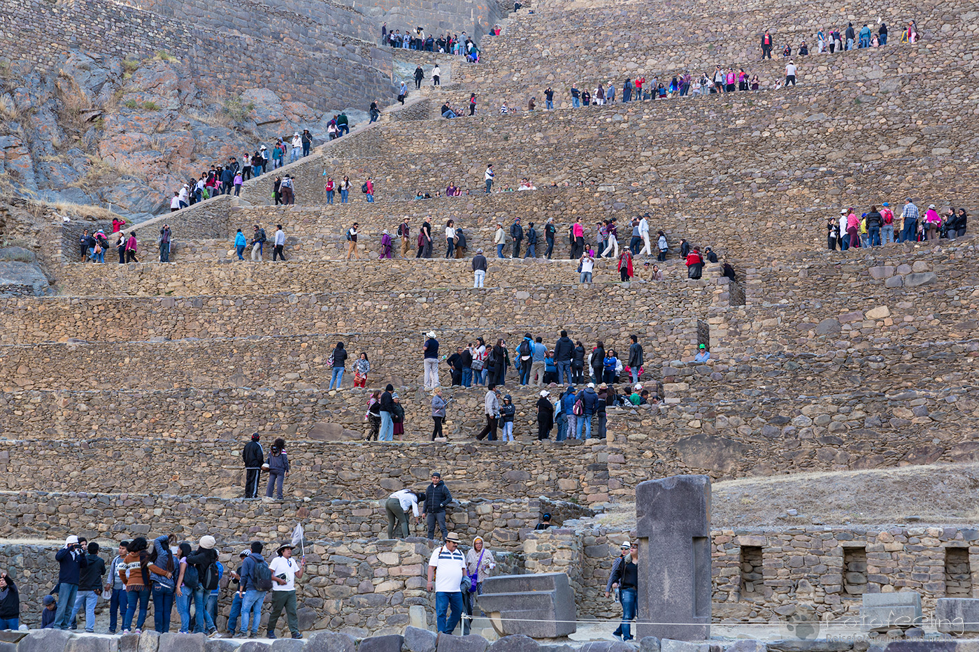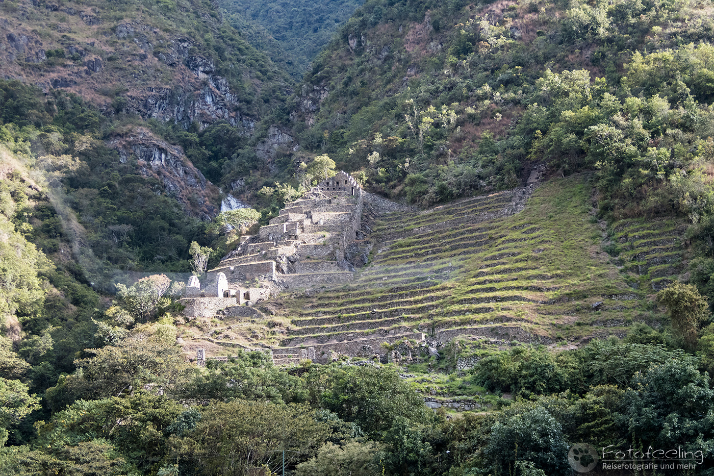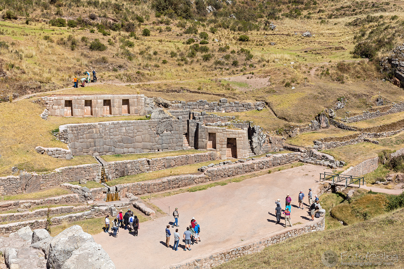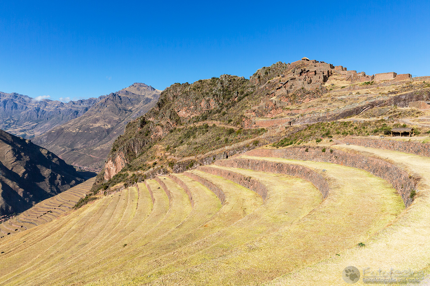 Zuerst erkundeten wir die obere Ebene, in der der Torreón über den Felsen thront mit dem Sector del Castillo. Von hier oben hatten wir eine eindrucksvolle Aussicht in die umliegenden Täler. Danach eroberten wir die untere Ebene mit ihren verwunschenen Rundhütten, in deren Mitte Lamas grasten. Begeistert wanderten wir bis zum Templo Mayor und unsere Kameras glühten. Noch immer waren wir alleine und erst nach und nach kamen einige Touristengruppen. Hatten wir noch Narrenfreiheit, wurden jetzt die Wächter aktiver und wiesen die Menschen immer wieder zurück auf die Wege.