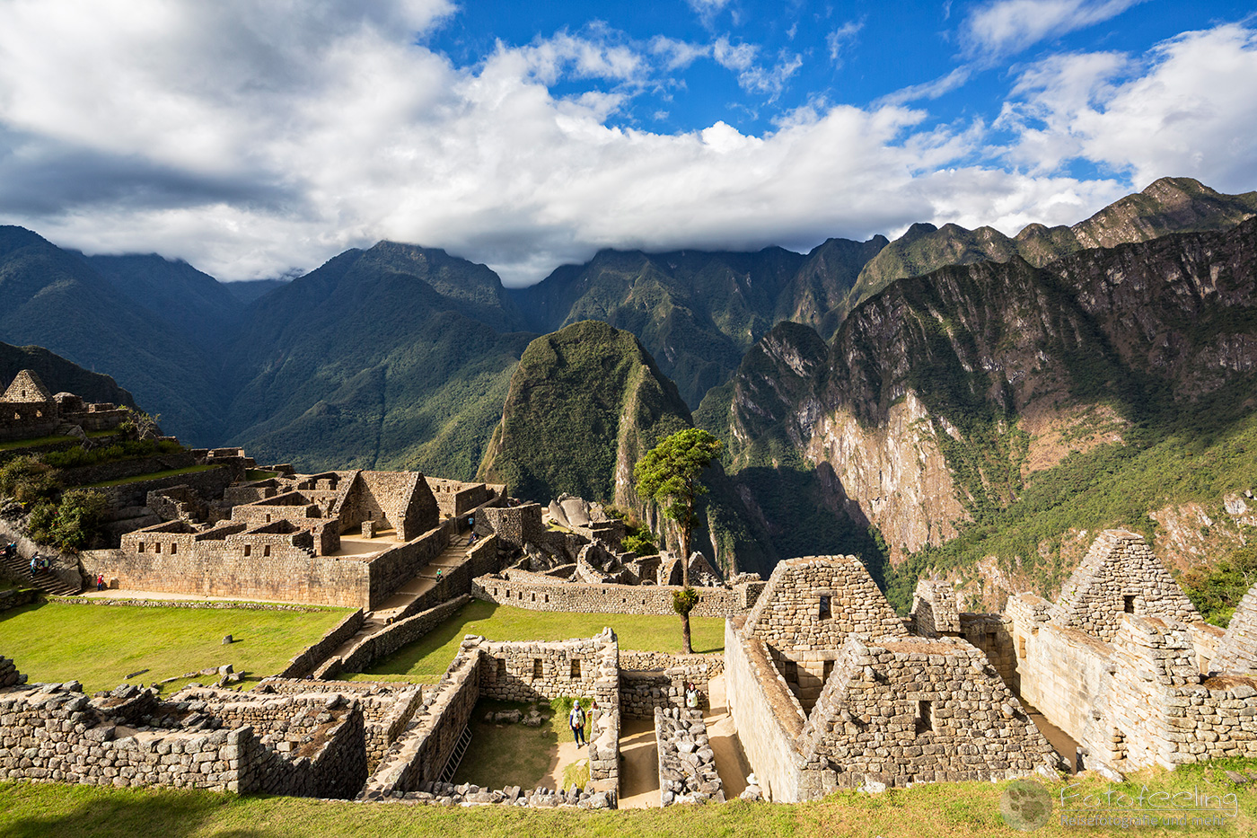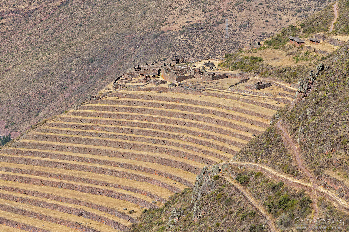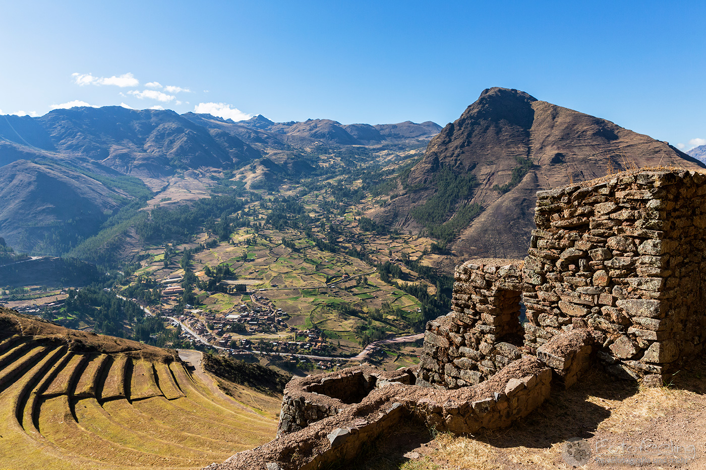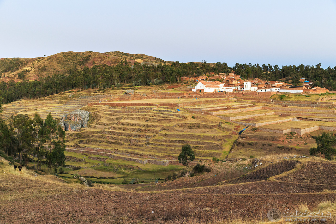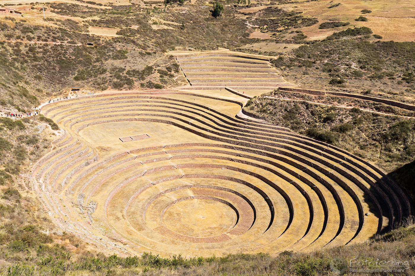 Zuerst erkundeten wir die obere Ebene, in der der Torreón über den Felsen thront mit dem Sector del Castillo. Von hier oben hatten wir eine eindrucksvolle Aussicht in die umliegenden Täler. Danach eroberten wir die untere Ebene mit ihren verwunschenen Rundhütten, in deren Mitte Lamas grasten. Begeistert wanderten wir bis zum Templo Mayor und unsere Kameras glühten. Noch immer waren wir alleine und erst nach und nach kamen einige Touristengruppen. Hatten wir noch Narrenfreiheit, wurden jetzt die Wächter aktiver und wiesen die Menschen immer wieder zurück auf die Wege.