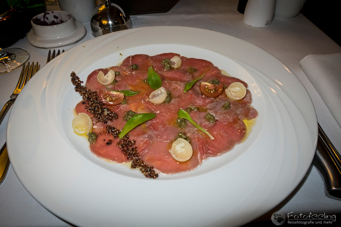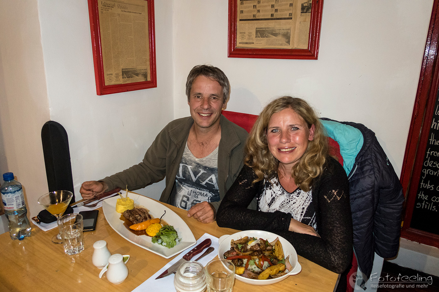 Das Restaurant war sehr voll und so saßen wir anfangs an einem etwas zugigen Tisch, dann wechselten wir in die Bar, wo es gleich viel gemütlicher war. Das Essen schmeckte sehr gut und so hatte der lange Tag noch ein angenehmes Ende gefunden.