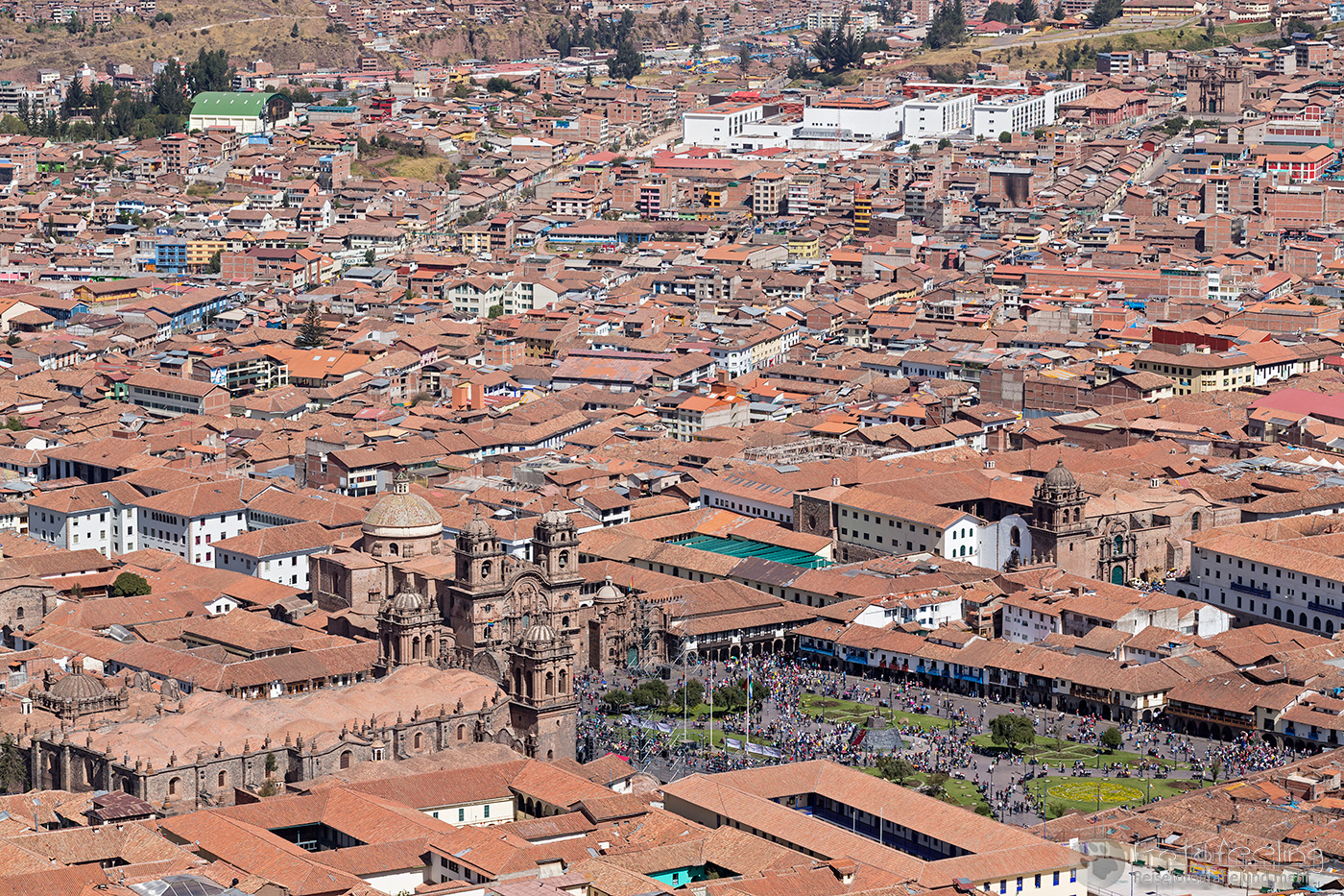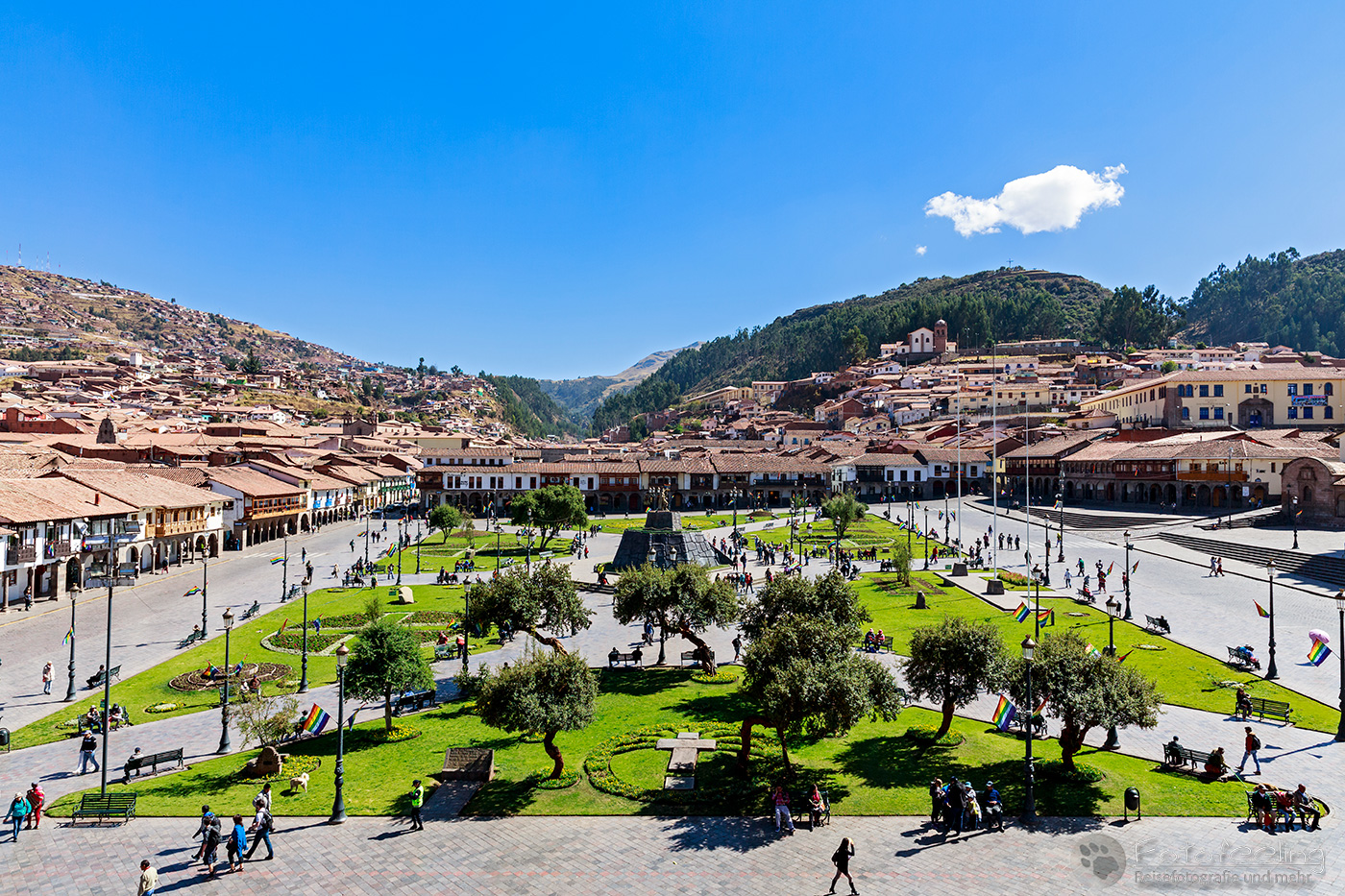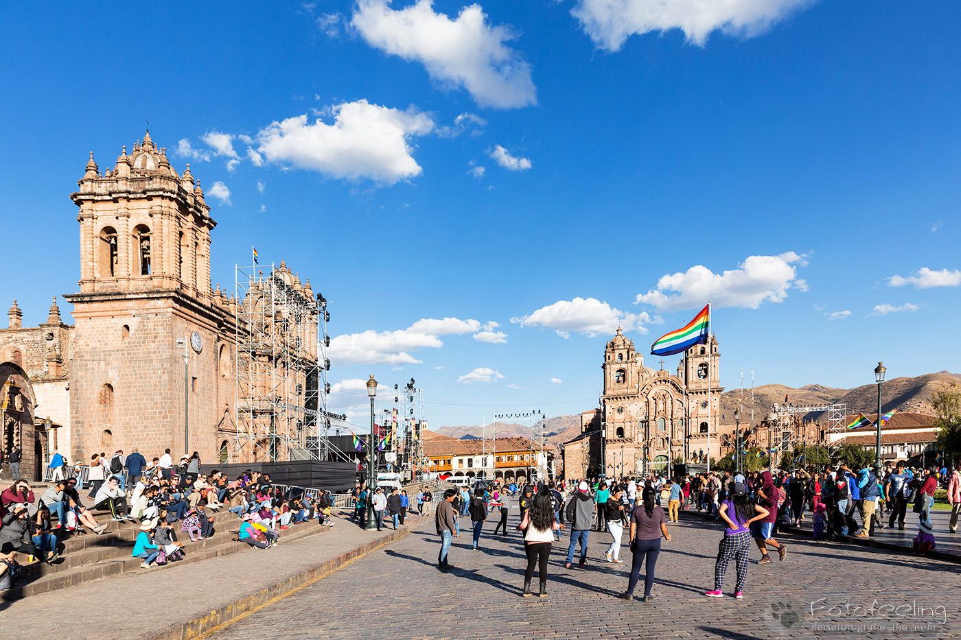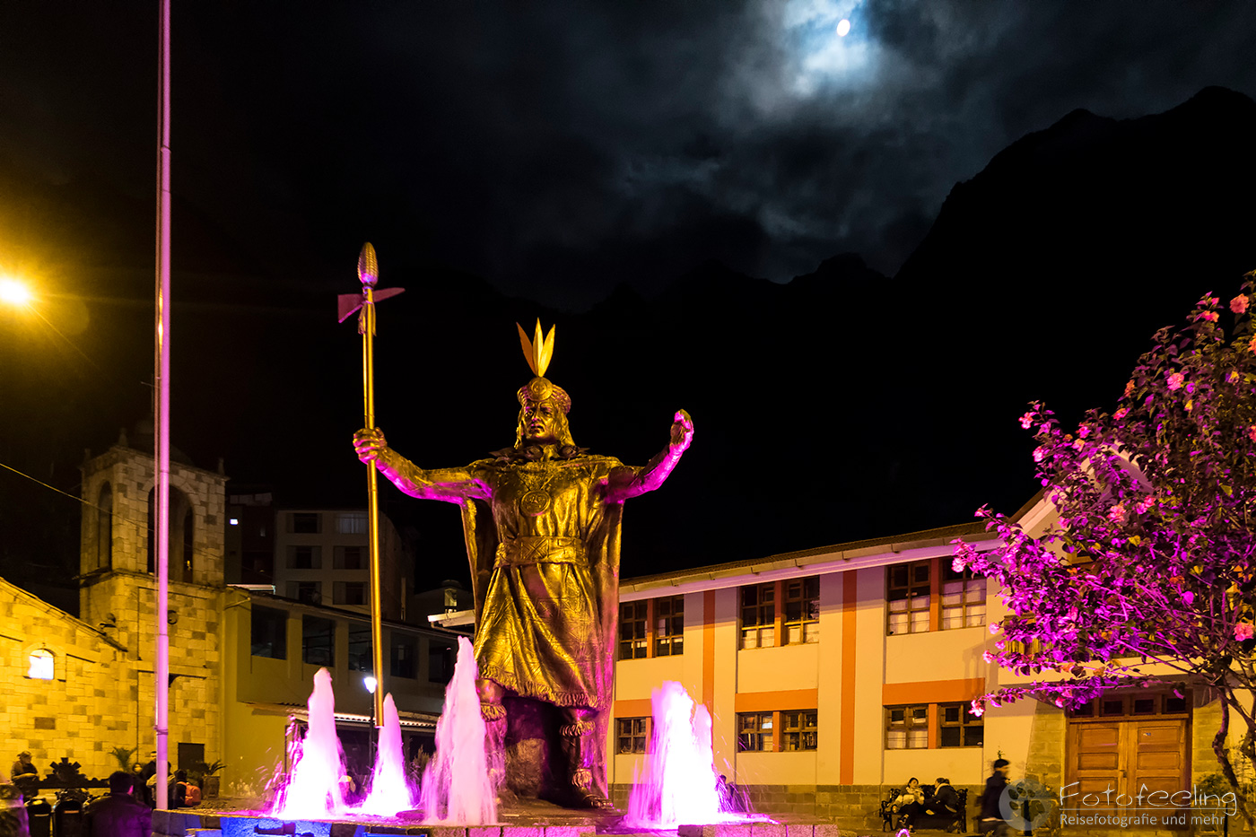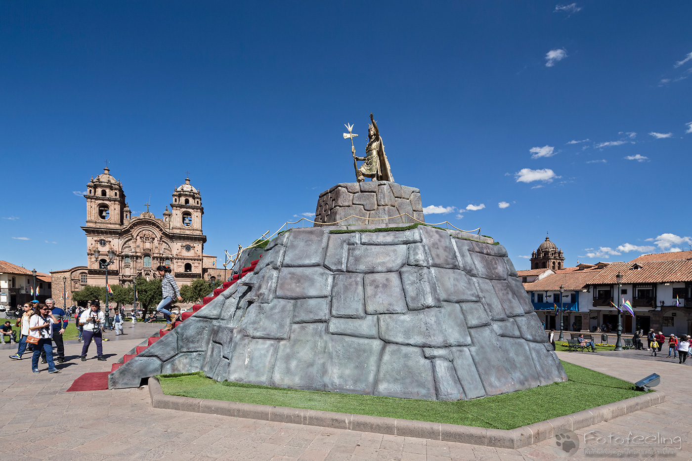 Mitten auf dem Platz steht ein schöner Brunnen, der leider im Zuge der Cusco Feierlichkeiten „eingemauert“ war. Auf ihm thront die Inka-Statue „Pachacutec“. Er war der 9. und einer der einflussreichsten Inka-Herrscher aller Zeiten. Cusco wurde nach seinen Plänen entworfen und das Zentrum der Stadt in Form eines Pumas angelegt.
