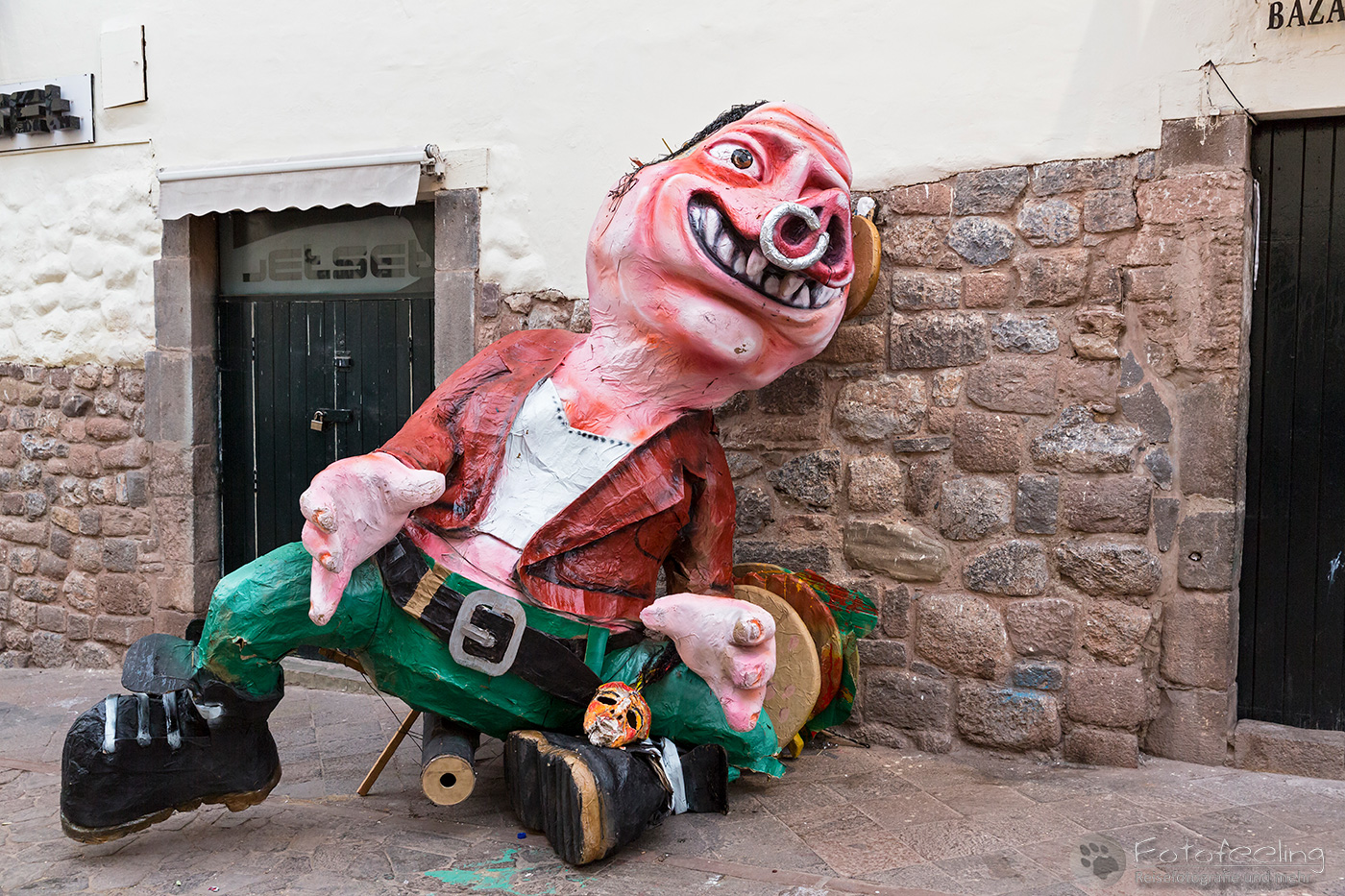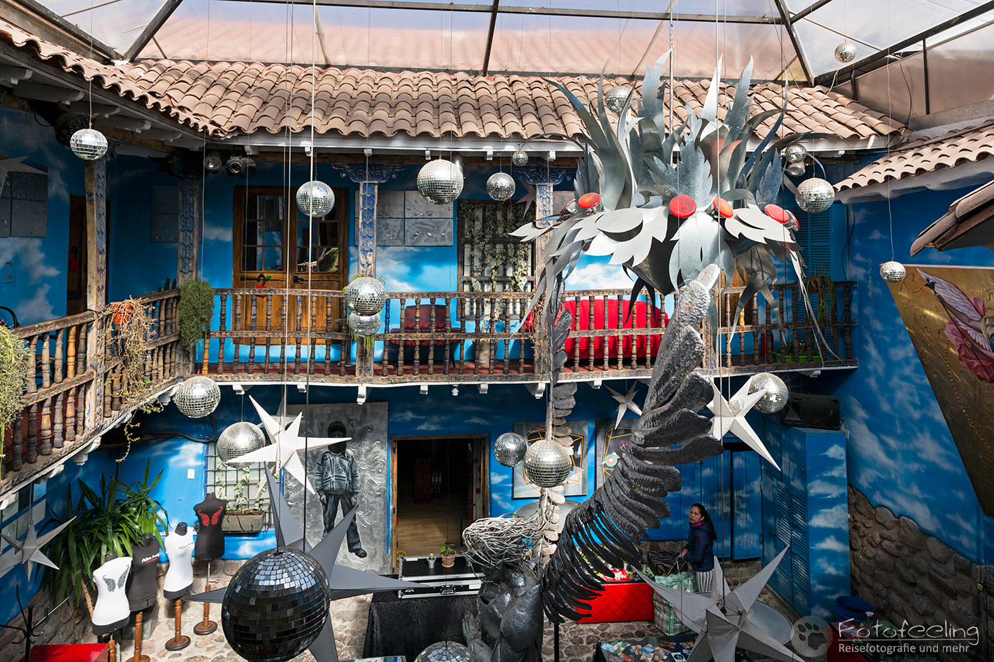 Danach spazierten wir noch etwas durch unser tolles Hotel und inspizierten die vielen Details und Bilder bei Tageslicht. Der riesige gefallene Engel im Innenhof, aber auch die Bilder und Ausstattung waren wirklich etwas Besonderes und absolut nach unserem Geschmack. Bisher waren fast alle Hotels auf dieser Reise auf irgendeine Art und Weise klasse, aber dieses hier schoss wirklich den Vogel ab. Uraltes Gemäuer mitten in der Stadt und perfekt gestaltet. Da würde kaum ein anderes Hotel in Cusco mithalten können.