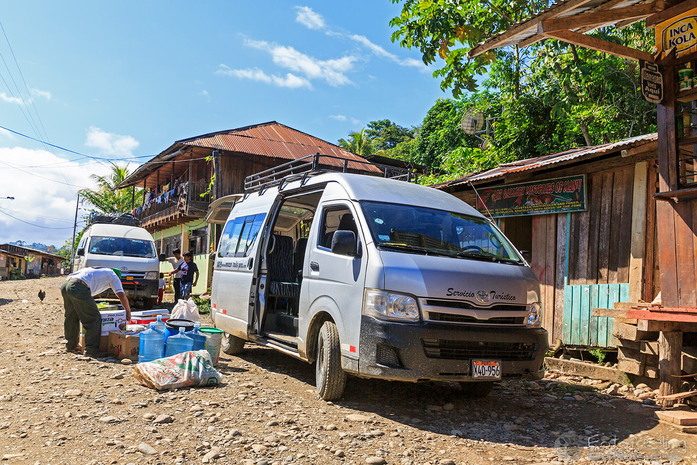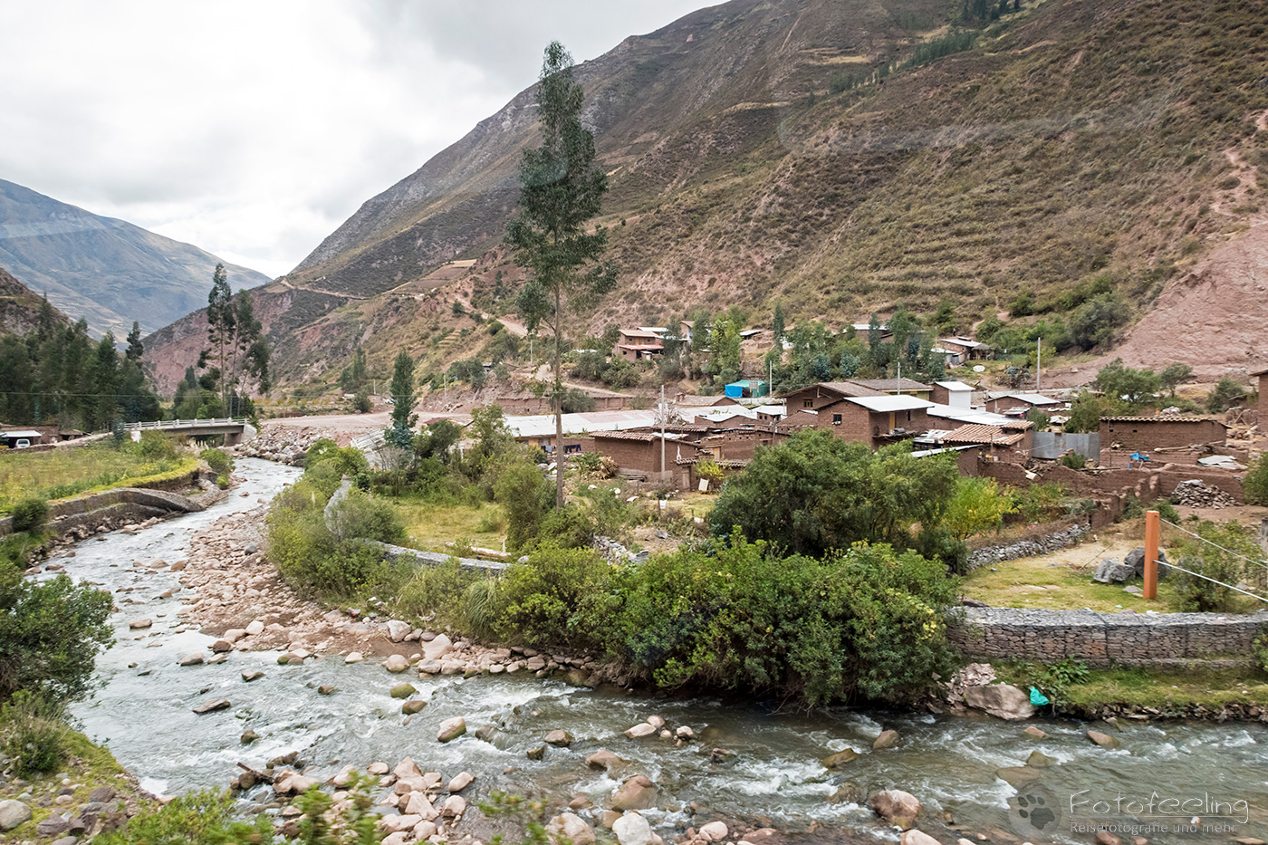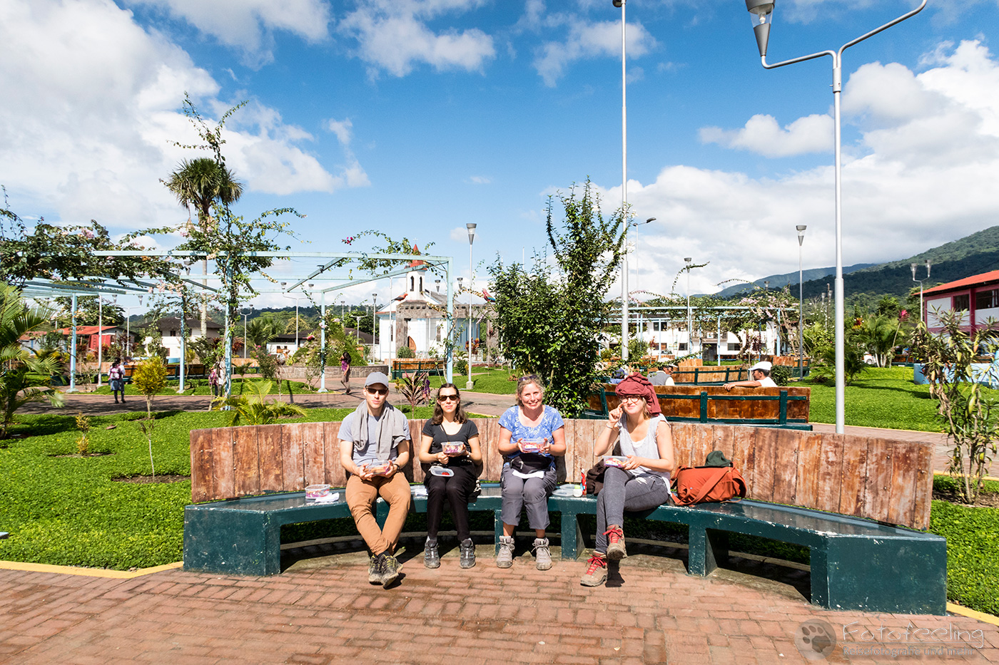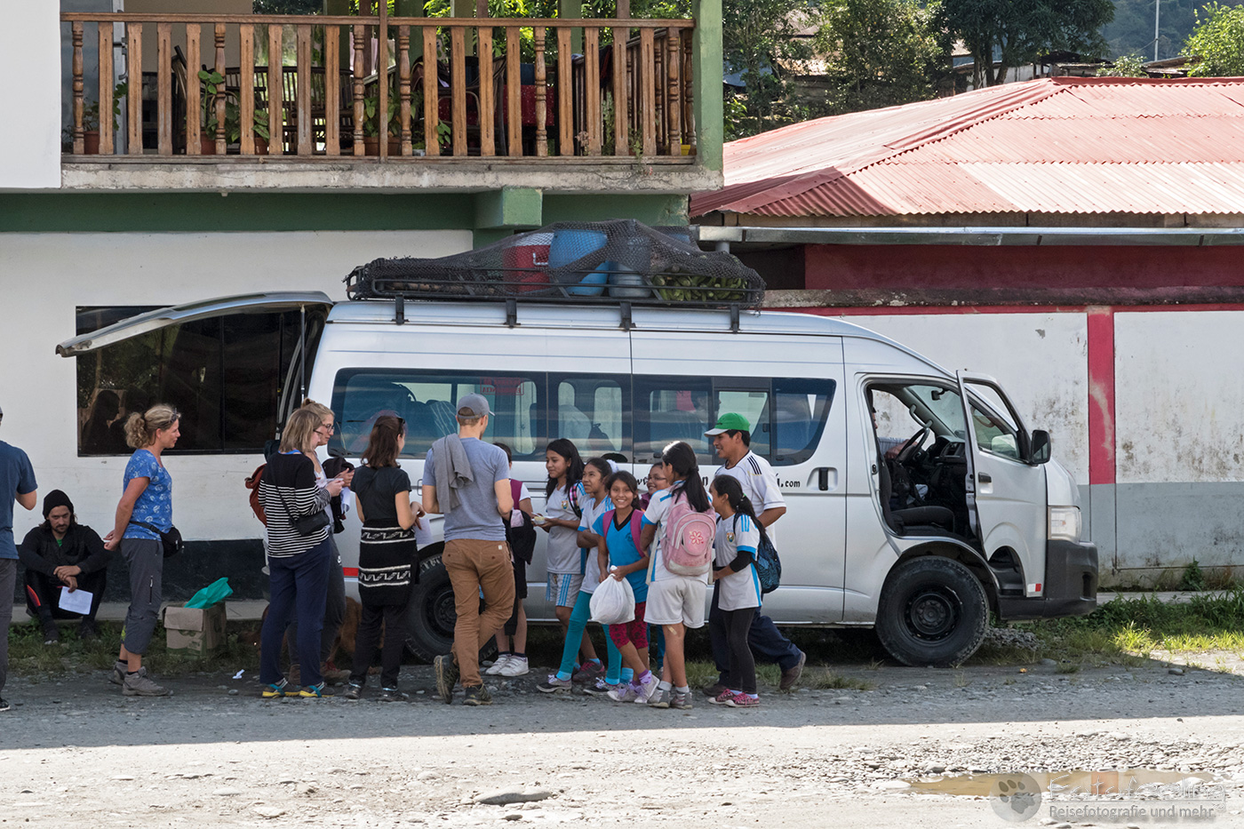 In Colorado legten wir an und verabschiedeten uns von den Bootsfahrern. Es warteten schon ein paar Autos auf uns, die uns über Land zum Fluss Rio Inambari brachten, den wir wieder mit einem Boot passierten. In Santa Rosa auf der anderen Fluss-Seite wartete schon wieder ein Kleinbus für die Fahrt nach Cusco auf uns. Leider gab es kein freudiges Wiedersehen mit Americo, zwei neue Fahrer erwarteten uns und der Spaß begann. Während der eine sehr langsam fuhr, so dass wir das Gefühl hatten nie in Cusco anzukommen, fuhr der andere wie ein Henker, so dass wir oftmals in den Kurven mit zwei Reifen in der Luft hingen und das Auto verdächtig ächzte und quietschte. Aber wenigstens war die Straße geteert, denn vor lauter in den Sitz krallen, hätten wir keine Hand mehr frei gehabt, um uns vor dem Staub zu schützen. So tuckerten oder bretterten wir auf der asphaltierten Transoceanica durch Nebelwald hinauf in die Anden, wo wir mittags zum Glück im Schatten eines schönen Dorfes Rast machten und zu Mittag aßen. Auch das gestaltete sich als etwas schwierig, denn entweder musste man im Stehen essen oder sich in die pralle Sonne auf Parkbänke setzen. So schön es war, wieder die Sonne zu sehen, ihre Kraft in der Höhe der Anden war schon gewaltig und so zogen wir dann doch den Schatten vor und mühten uns im Stehen mit dem Essen ab.