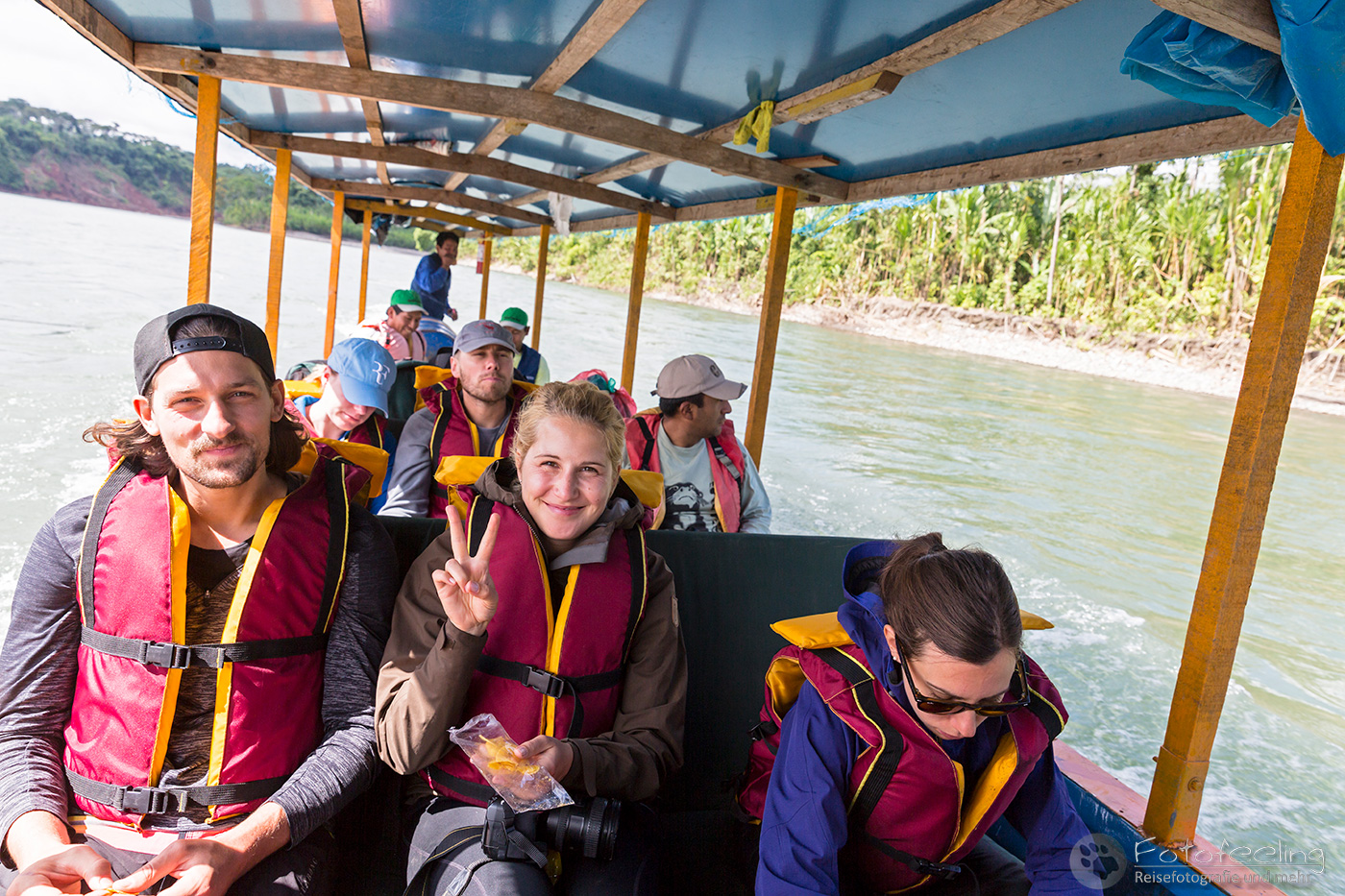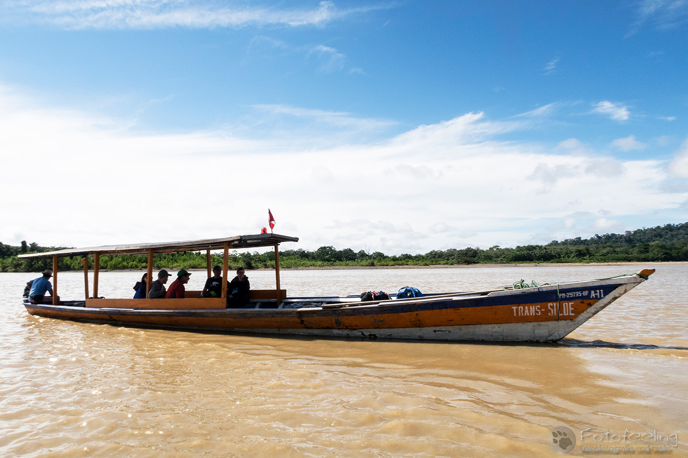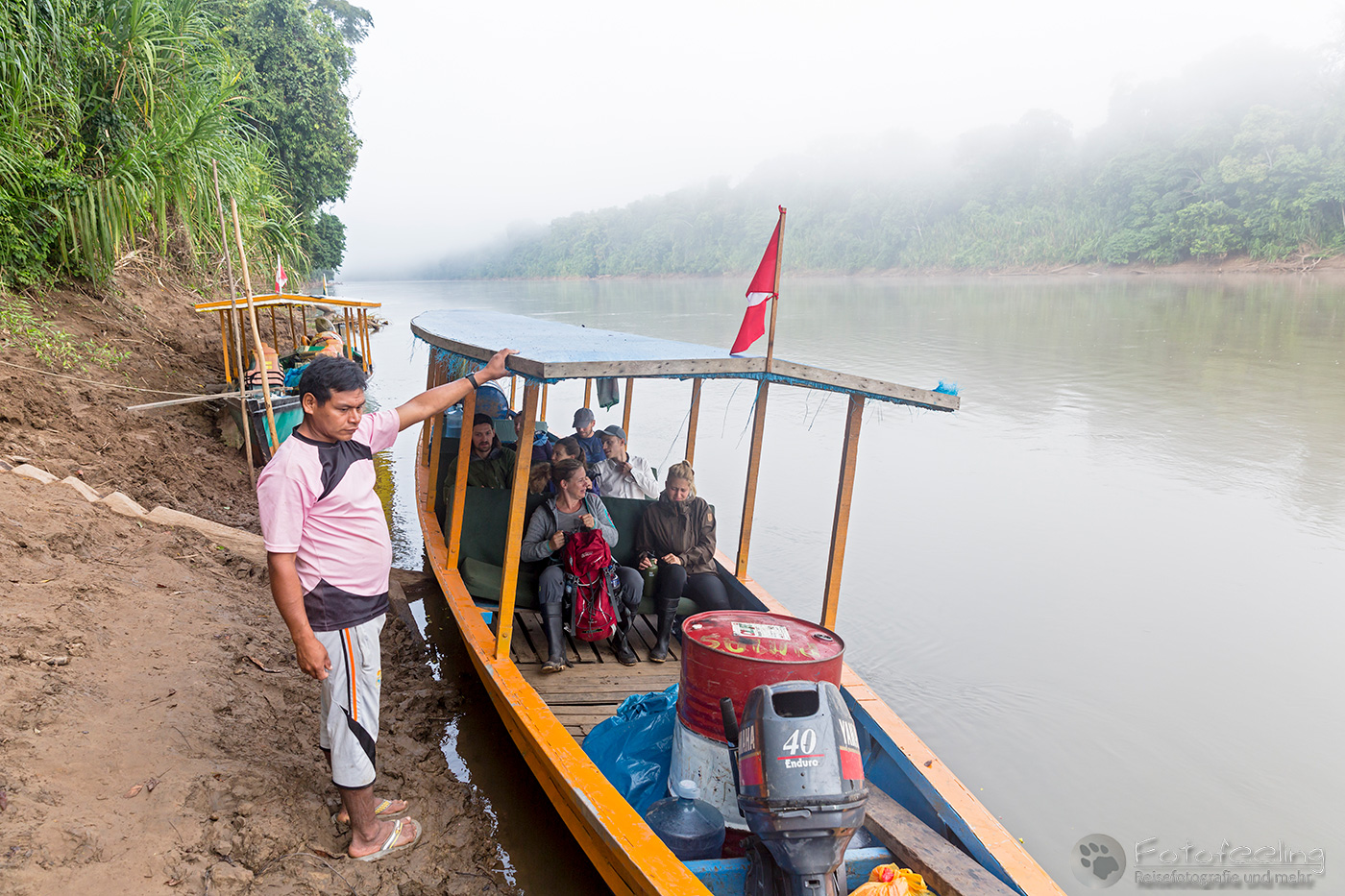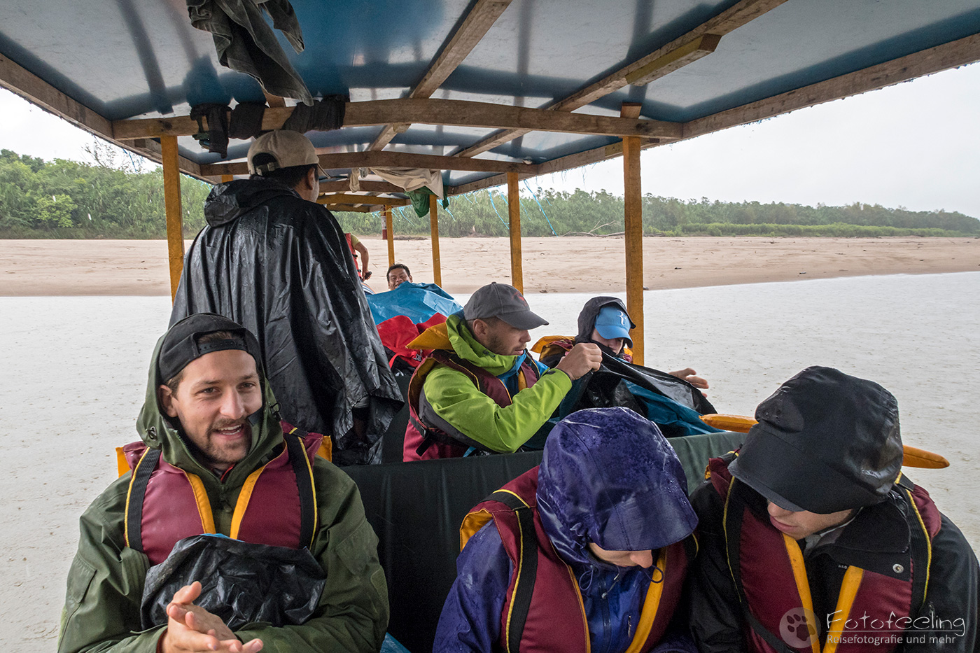 Um 6.00 Uhr morgens war alles gepackt und die Taschen standen abfahrbereit. Schnell noch gefrühstückt und dann ging es los auf Pirschfahrt – dachten wir jedenfalls. Doch diesmal machte uns das Wetter einen Strich durch die Rechnung. Es regnete leicht. So saßen wir fröstelnd mit unseren Ponchos in der ersten Reihe und wurden immer nasser. Der Regen peitschte uns ins Gesicht und es war richtig kalt. Wir bekamen zwar noch eine Plastikplane, aber auch die nützte nur bedingt. So schipperten wir die zwei Stunden, die uns und unseren geplagten Bandscheiben wie 4 Stunden vorkamen bis zu der Rangerstation. Hier wurden wir kurz kontrolliert, ob wir nicht einige exotische Tiere aus dem Nationalpark schmuggeln würden… Wir schauten alle etwas verdattert, denn wir wären froh gewesen, wenn wir die Tiere ohne Spektiv hätten sehen können… wie sollten wir die denn fangen und schmuggeln??? Aber Regel ist Regel, da es bei uns nichts zu holen gab, außer klammen nasskalten Fingern und pitschnasse Köpfe, zog der Ranger sich schnell zurück und weiter ging die Folterfahrt auf dem Rio Manu. An dessen Mündung machten wir einen Stopp im Dorf Boca Manu, wo wir kurz den Dorfladen besuchten und Manu zum Arzt ging. Zum Glück war ein junger Mediziner aus Lima vor Ort und schaute sich ihr Ohr an. Hier hatten sich einige Larven eingenistet und der Arzt entfernte sie und spülte das Ohr. Derweil kauften wir Bier und Nüsschen ein. Dabei wurden wir von den Dorfbewohnern genauso neugierig betrachtet, wie wir sie musterten. Das Leben hier ist schon sehr einfach, aber mit einem Arzt und einem Geschäft vor Ort ist das Dorf sicher ein größerer Ort. Hunde spielten und Kinder fetzten über das Fußballfeld. Durch den Regen war alles matschig und aufgeweicht, doch zum Glück hatte er nachgelassen und es trocknete langsam ab.