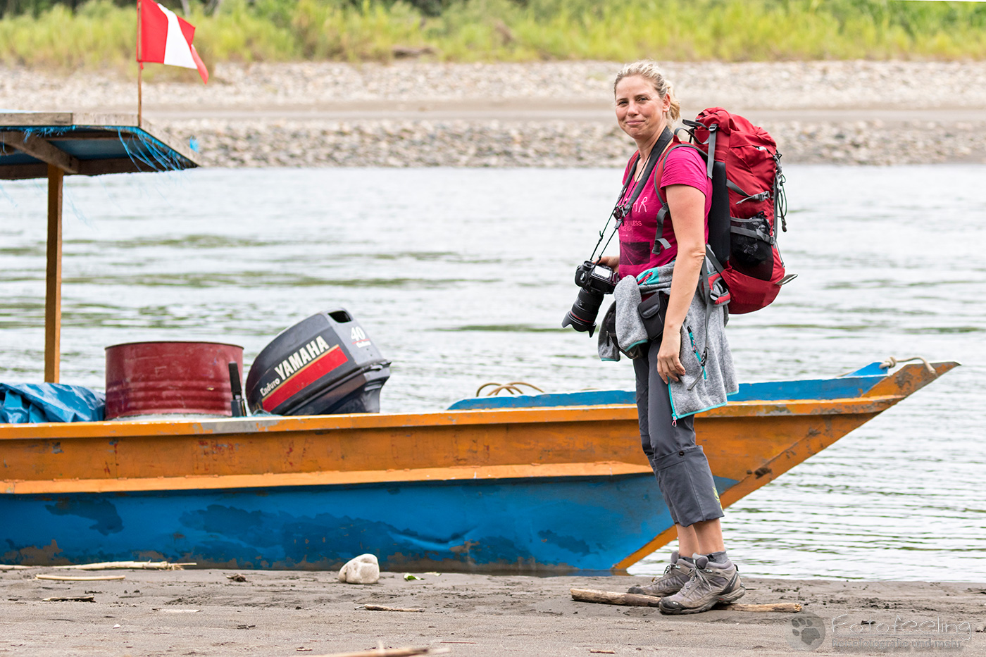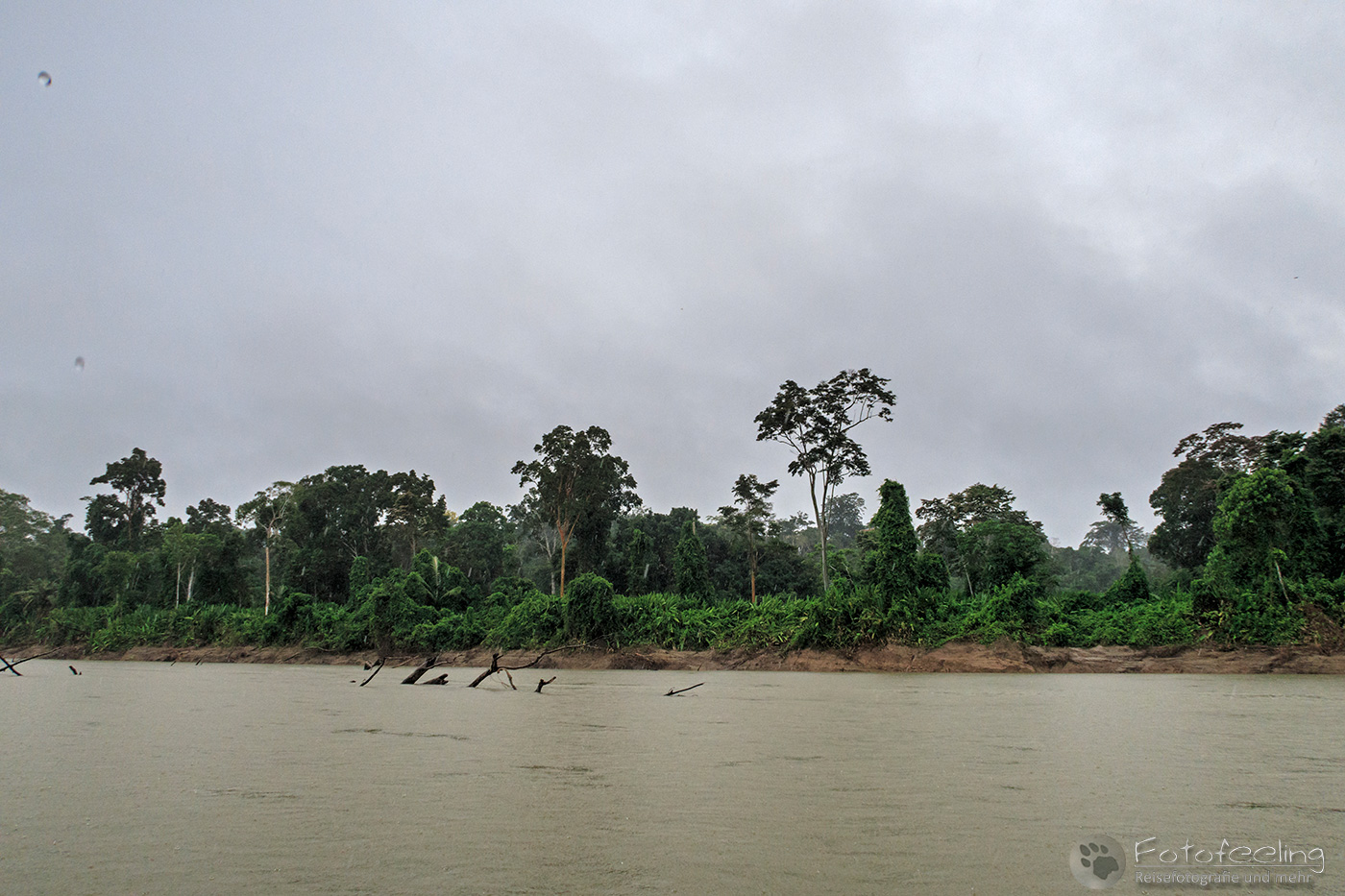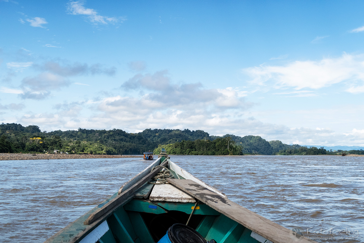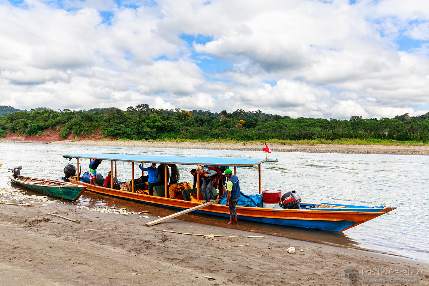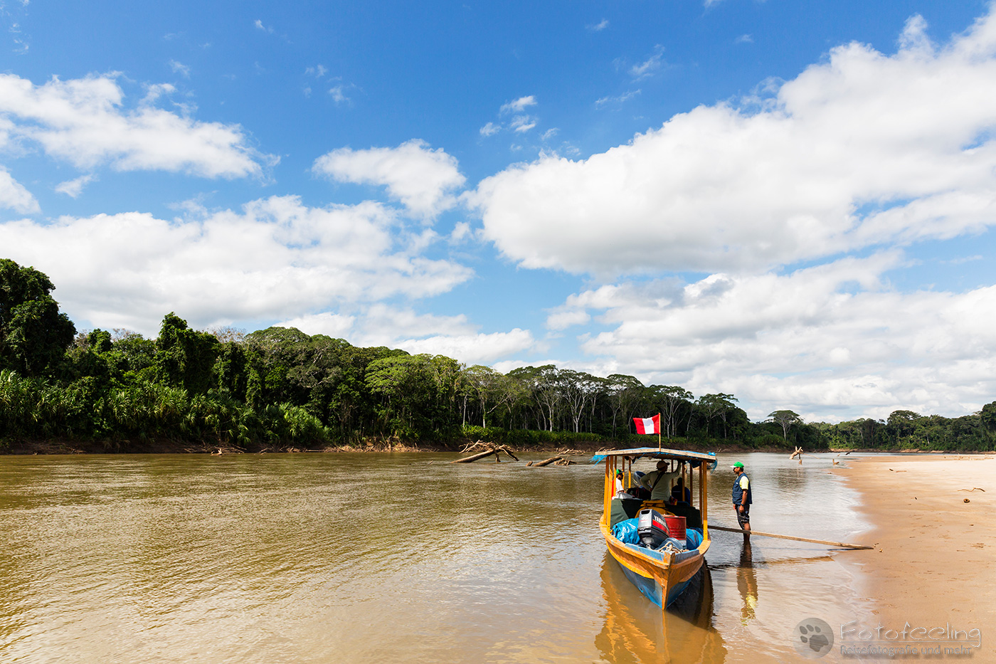 Um 6.00 Uhr morgens war alles gepackt und die Taschen standen abfahrbereit. Schnell noch gefrühstückt und dann ging es los auf Pirschfahrt – dachten wir jedenfalls. Doch diesmal machte uns das Wetter einen Strich durch die Rechnung. Es regnete leicht. So saßen wir fröstelnd mit unseren Ponchos in der ersten Reihe und wurden immer nasser. Der Regen peitschte uns ins Gesicht und es war richtig kalt. Wir bekamen zwar noch eine Plastikplane, aber auch die nützte nur bedingt. So schipperten wir die zwei Stunden, die uns und unseren geplagten Bandscheiben wie 4 Stunden vorkamen bis zu der Rangerstation. Hier wurden wir kurz kontrolliert, ob wir nicht einige exotische Tiere aus dem Nationalpark schmuggeln würden… Wir schauten alle etwas verdattert, denn wir wären froh gewesen, wenn wir die Tiere ohne Spektiv hätten sehen können… wie sollten wir die denn fangen und schmuggeln??? Aber Regel ist Regel, da es bei uns nichts zu holen gab, außer klammen nasskalten Fingern und pitschnasse Köpfe, zog der Ranger sich schnell zurück und weiter ging die Folterfahrt auf dem Rio Manu. An dessen Mündung machten wir einen Stopp im Dorf Boca Manu, wo wir kurz den Dorfladen besuchten und Manu zum Arzt ging. Zum Glück war ein junger Mediziner aus Lima vor Ort und schaute sich ihr Ohr an. Hier hatten sich einige Larven eingenistet und der Arzt entfernte sie und spülte das Ohr. Derweil kauften wir Bier und Nüsschen ein. Dabei wurden wir von den Dorfbewohnern genauso neugierig betrachtet, wie wir sie musterten. Das Leben hier ist schon sehr einfach, aber mit einem Arzt und einem Geschäft vor Ort ist das Dorf sicher ein größerer Ort. Hunde spielten und Kinder fetzten über das Fußballfeld. Durch den Regen war alles matschig und aufgeweicht, doch zum Glück hatte er nachgelassen und es trocknete langsam ab.
