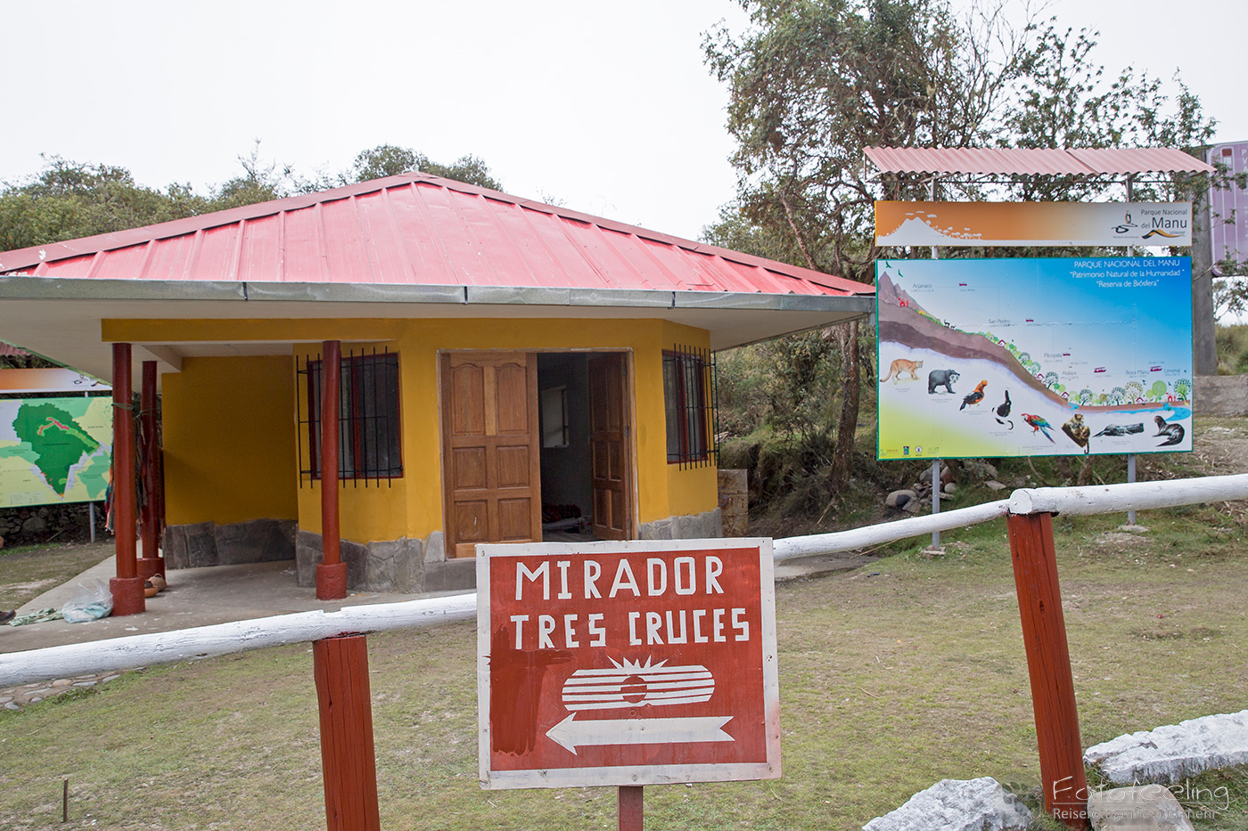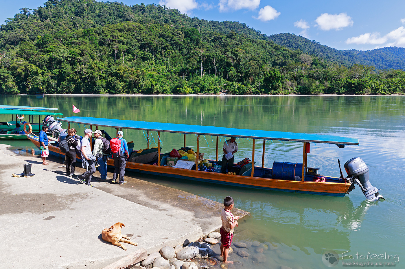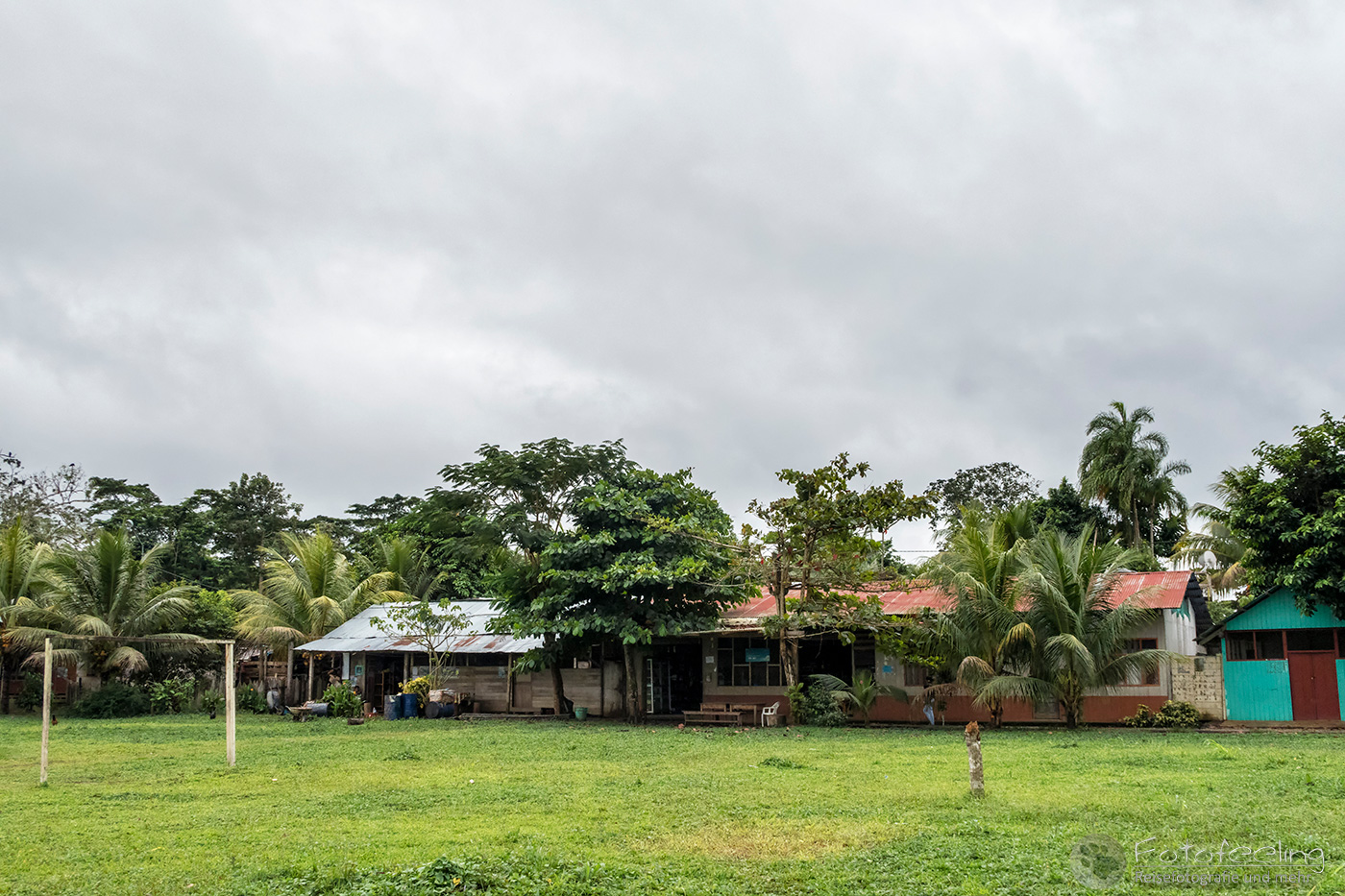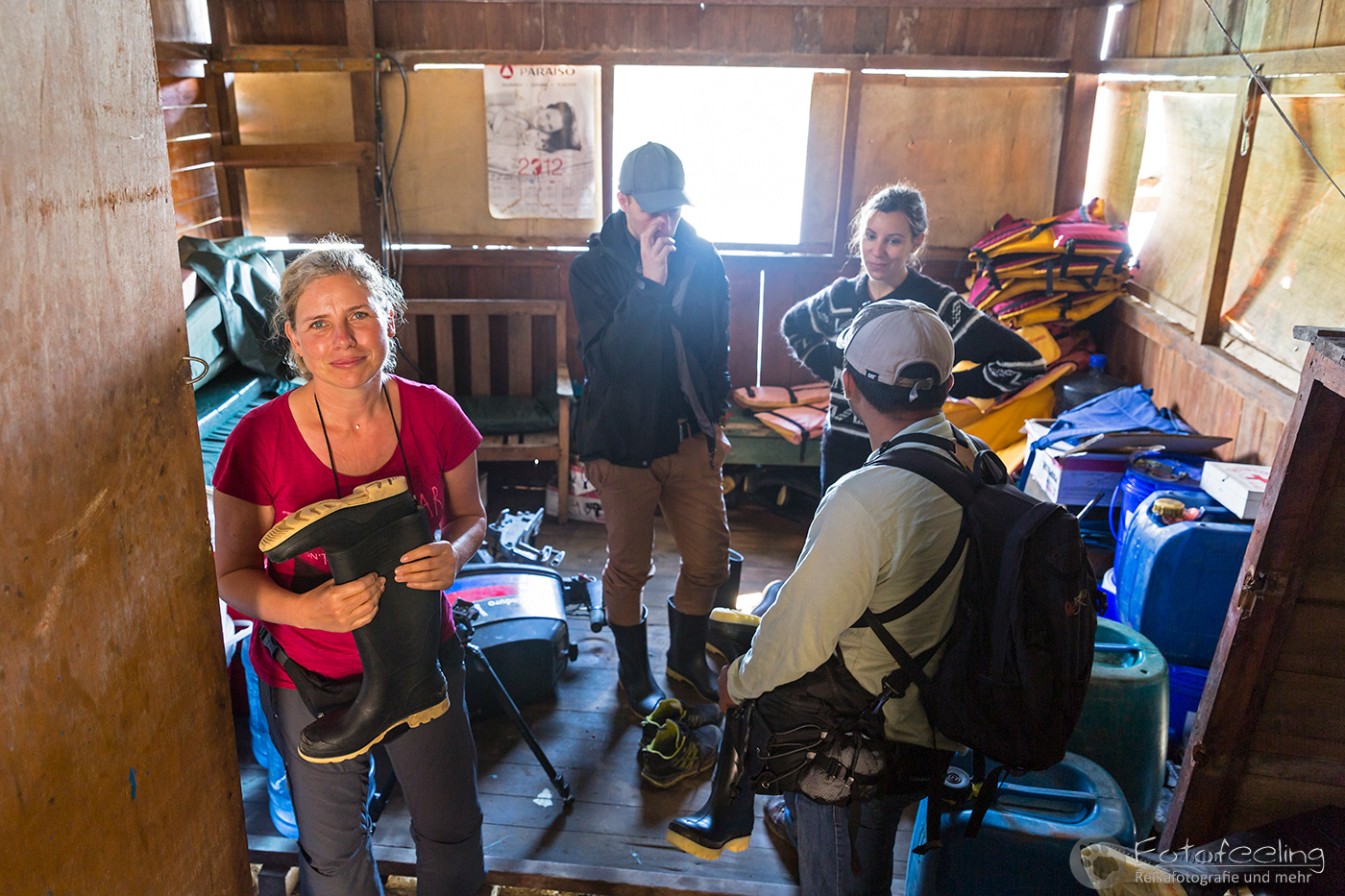 Um 6.00 Uhr morgens war alles gepackt und die Taschen standen abfahrbereit. Schnell noch gefrühstückt und dann ging es los auf Pirschfahrt – dachten wir jedenfalls. Doch diesmal machte uns das Wetter einen Strich durch die Rechnung. Es regnete leicht. So saßen wir fröstelnd mit unseren Ponchos in der ersten Reihe und wurden immer nasser. Der Regen peitschte uns ins Gesicht und es war richtig kalt. Wir bekamen zwar noch eine Plastikplane, aber auch die nützte nur bedingt. So schipperten wir die zwei Stunden, die uns und unseren geplagten Bandscheiben wie 4 Stunden vorkamen bis zu der Rangerstation. Hier wurden wir kurz kontrolliert, ob wir nicht einige exotische Tiere aus dem Nationalpark schmuggeln würden… Wir schauten alle etwas verdattert, denn wir wären froh gewesen, wenn wir die Tiere ohne Spektiv hätten sehen können… wie sollten wir die denn fangen und schmuggeln??? Aber Regel ist Regel, da es bei uns nichts zu holen gab, außer klammen nasskalten Fingern und pitschnasse Köpfe, zog der Ranger sich schnell zurück und weiter ging die Folterfahrt auf dem Rio Manu. An dessen Mündung machten wir einen Stopp im Dorf Boca Manu, wo wir kurz den Dorfladen besuchten und Manu zum Arzt ging. Zum Glück war ein junger Mediziner aus Lima vor Ort und schaute sich ihr Ohr an. Hier hatten sich einige Larven eingenistet und der Arzt entfernte sie und spülte das Ohr. Derweil kauften wir Bier und Nüsschen ein. Dabei wurden wir von den Dorfbewohnern genauso neugierig betrachtet, wie wir sie musterten. Das Leben hier ist schon sehr einfach, aber mit einem Arzt und einem Geschäft vor Ort ist das Dorf sicher ein größerer Ort. Hunde spielten und Kinder fetzten über das Fußballfeld. Durch den Regen war alles matschig und aufgeweicht, doch zum Glück hatte er nachgelassen und es trocknete langsam ab.