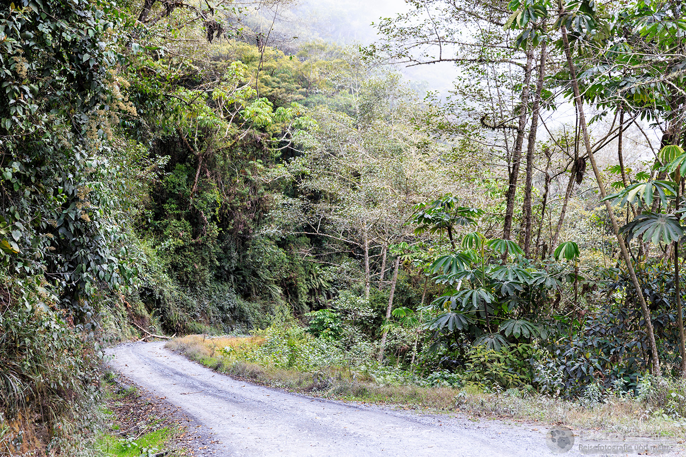 Die letzten knapp 5 km Kilometer bis zur Gocta Lodge, unserem heutigen Ziel auf 1800 Höhenmetern, fuhren wir auf einer Schotterpiste, die anfangs zwar eng aber noch sehr gut war. Kurz vor unserem Ziel war jedoch die Straße aufgerissen und Bauarbeiten in Gange. Solange es halbwegs trocken war, war die Straße passierbar, aber was wäre bei starkem Regen, fragten wir uns. Jedenfalls waren wir froh, dass unser Auto Allrad hatte und uns gut durch die tiefen Fahrspuren der Baustellenfahrzeuge brachte.