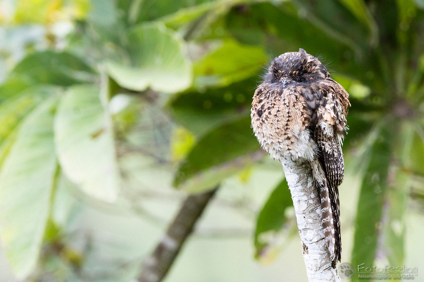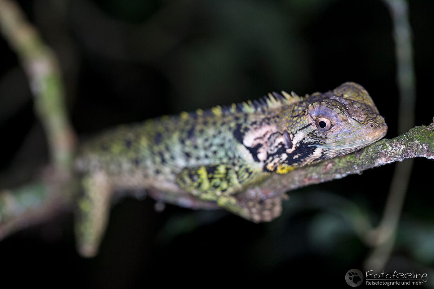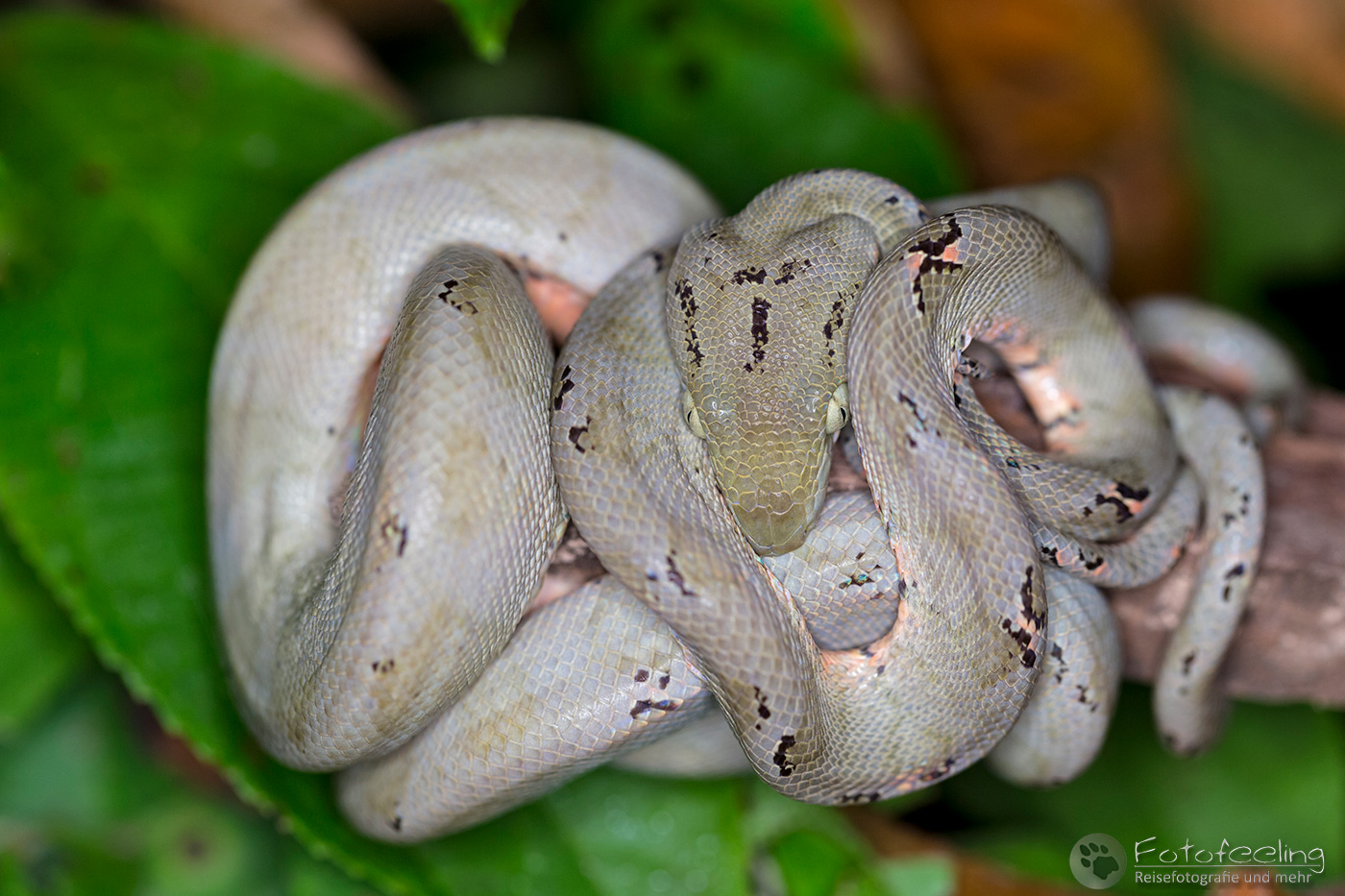 Nach dem Abendessen ging es wieder einmal auf eine Nachtwanderung. Tschäggi, Denis und Manu, die heftige Ohrenschmerzen hatte, blieben zurück. Wir anderen hatten uns gut eingeschmiert gegen die lästigen Moskitos und folgten leise Carlos. Irgendwie lag etwas Besonderes in der Luft und wir waren sehr still. Neben den üblichen Kriechtieren und Insekten entdeckte Chris einen Vogel auf dem Boden, der uns ängstlich mit großen Augen ansah. Als Marco ein Bild machen wollte, flog er auf einmal auf, und wir erschreckten alle ordentlich. Carlos entdeckte noch ein paar Salamander und einen Iguana. Doch das Highlight der Wanderung kam zum Schluss. Wunderschön in perfekter Jagdhaltung hatte sich eine Amazonas Baumboa (Hundskopfboa oder Gartenboa lat: Corallus hortulanus) um einen Ast gewickelt und harrte der Dinge die da kommen. Wow, sowas hatte ich noch nie gesehen. Eine bildhübsche Schlange in freier Natur. Wir beobachteten sie eine ganze Zeit. Danach machten wir uns hochzufrieden auf den Rückweg. Diese Nachtwanderung war die Beste von allen und hatte sich wirklich gelohnt.