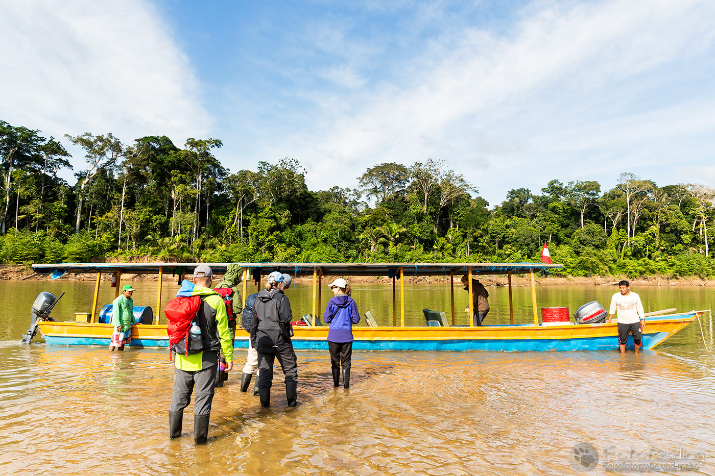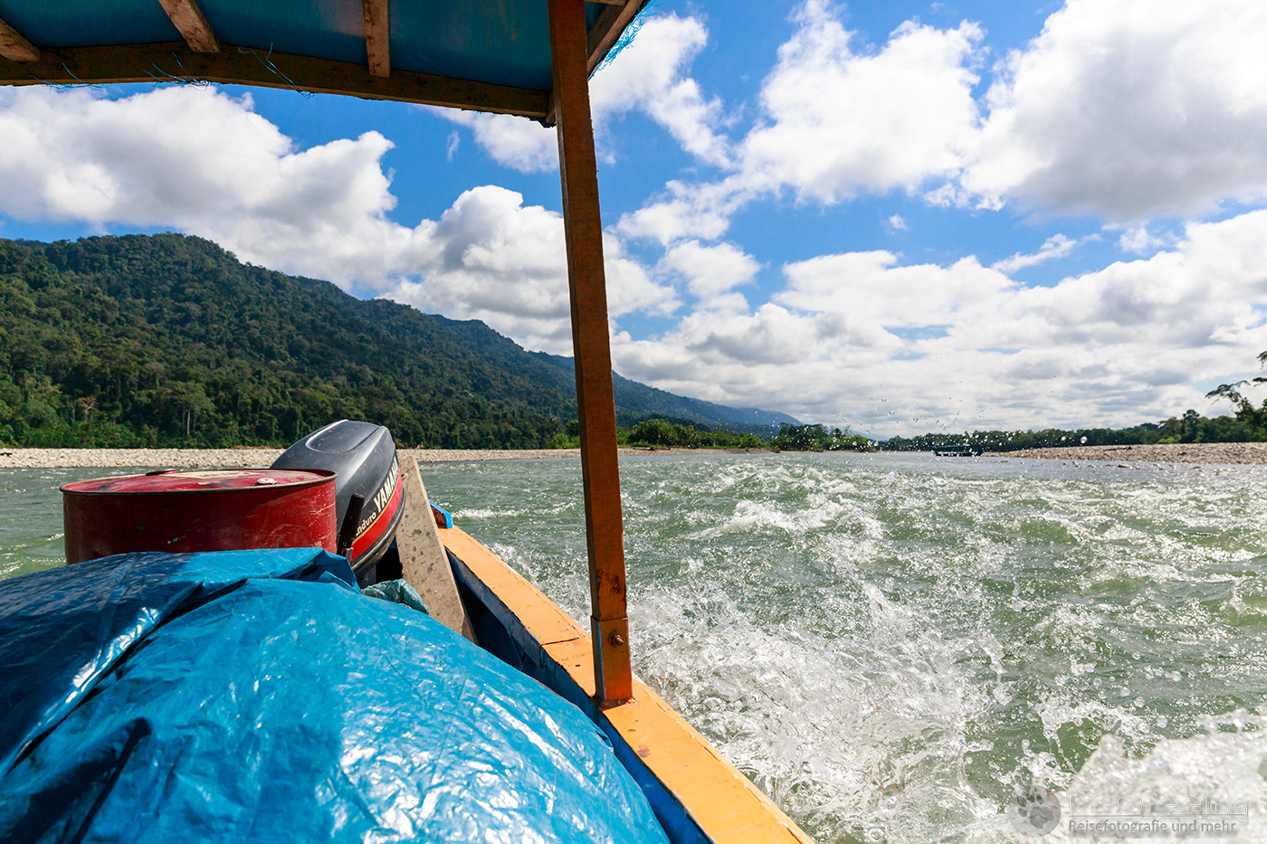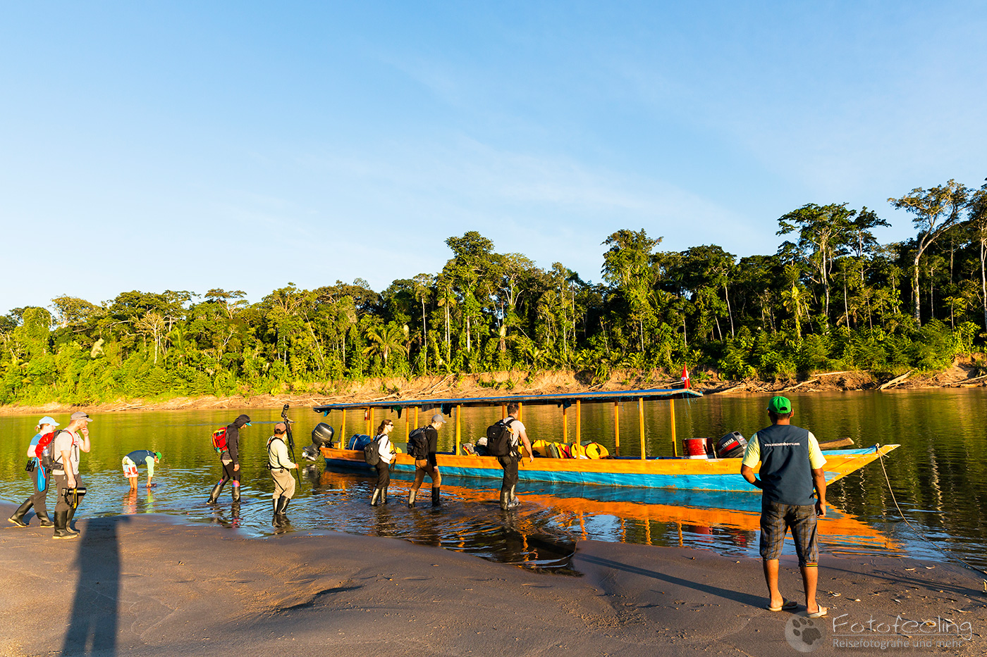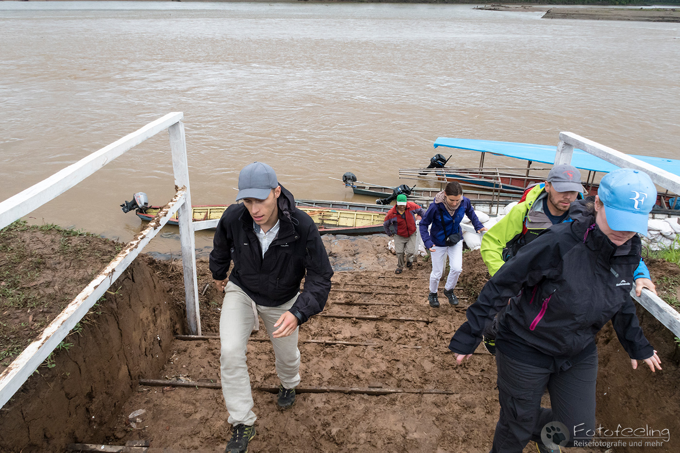 Wir starteten früh am Morgen, denn ein langer Tag lag vor uns. Wieder nahmen wir unsere Plätze in dem mittlerweile verhassten Boot ein. Mir tat schon beim Hinsetzen alles weh. Los ging die Fahrt flussabwärts in Richtung Colorado einem kleinen Goldwäscherdorf, das wir nach ca. 2,5 Stunden erreichten. Unterwegs hielten wir noch kurz an dem Zugang zur Ara-Lecke, denn hier hatten die anderen am Vortag zwei Faultiere gesehen, aber leider waren sie mittlerweile weg.
