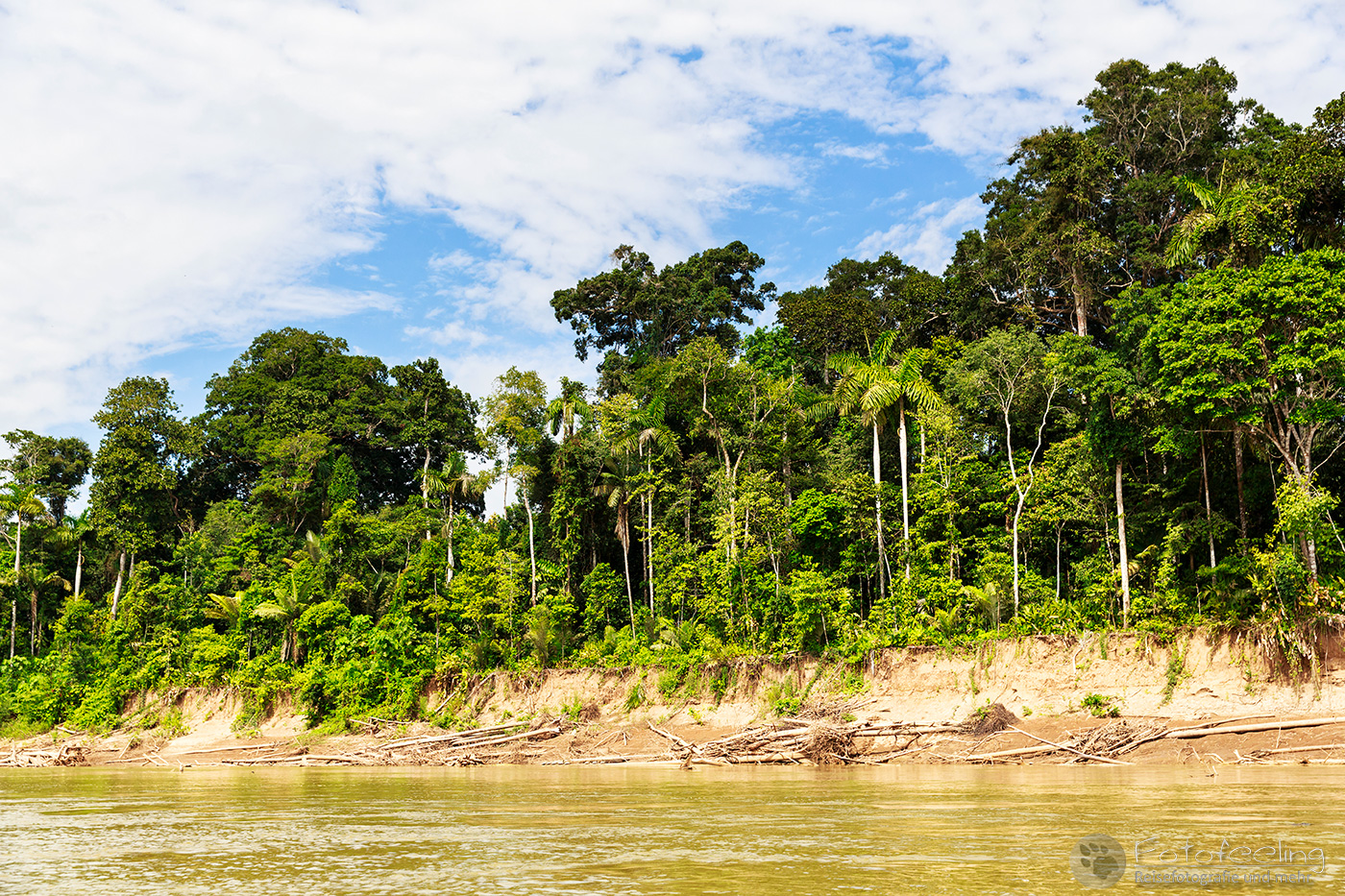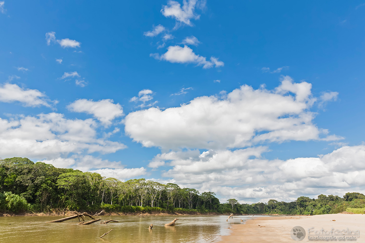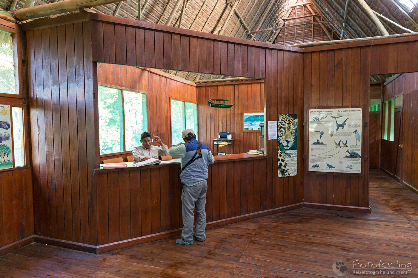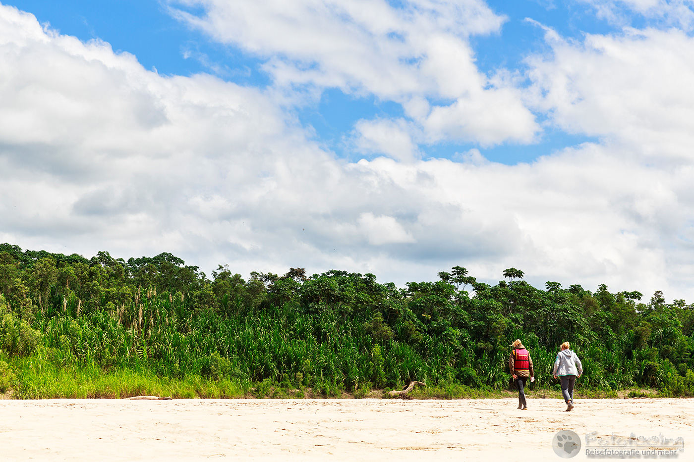 Wir fuhren in die Reservatszone des Manu Nationalparks. Hier erreichten wir die Mündung des Rio Manu und nach kurzer Fahrt die Parkstation in Limonal, wo wir uns in ein Buch eintragen mussten und unser Permit kontrolliert wurde. Wir bekamen einen fetzigen Stempel in unsere Pässe. Ich entschied mich für einen Otter und Chris natürlich für einen Jaguar. Weiter ging die Fahrt flussaufwärts in den Manu Nationalpark hinein. Wieder war es megaanstrengend, zumal es so kalt war, wie man es sich vom Regenwald eigentlich nicht vorstellen kann. Aber wir hatten etwas Pech, denn uns begleitete eine Kaltfront. Doch zum Glück sahen wir auch ein paar Tiere wie sehr scheue Capybaras (Wasserschweine), die sogleich panisch im Busch verschwanden, ein paar Kaimane (Caiman crocodylus) am Strand, einige kleine Schildkröten und ein paar Vögel. Carlos entdeckte einen Jaguarplatz, an dem vor kurzem noch eines dieser prächtigen Tiere geschlafen hatte, aber leider sahen wir nicht einmal ein Haar von dem scheuen Jäger.