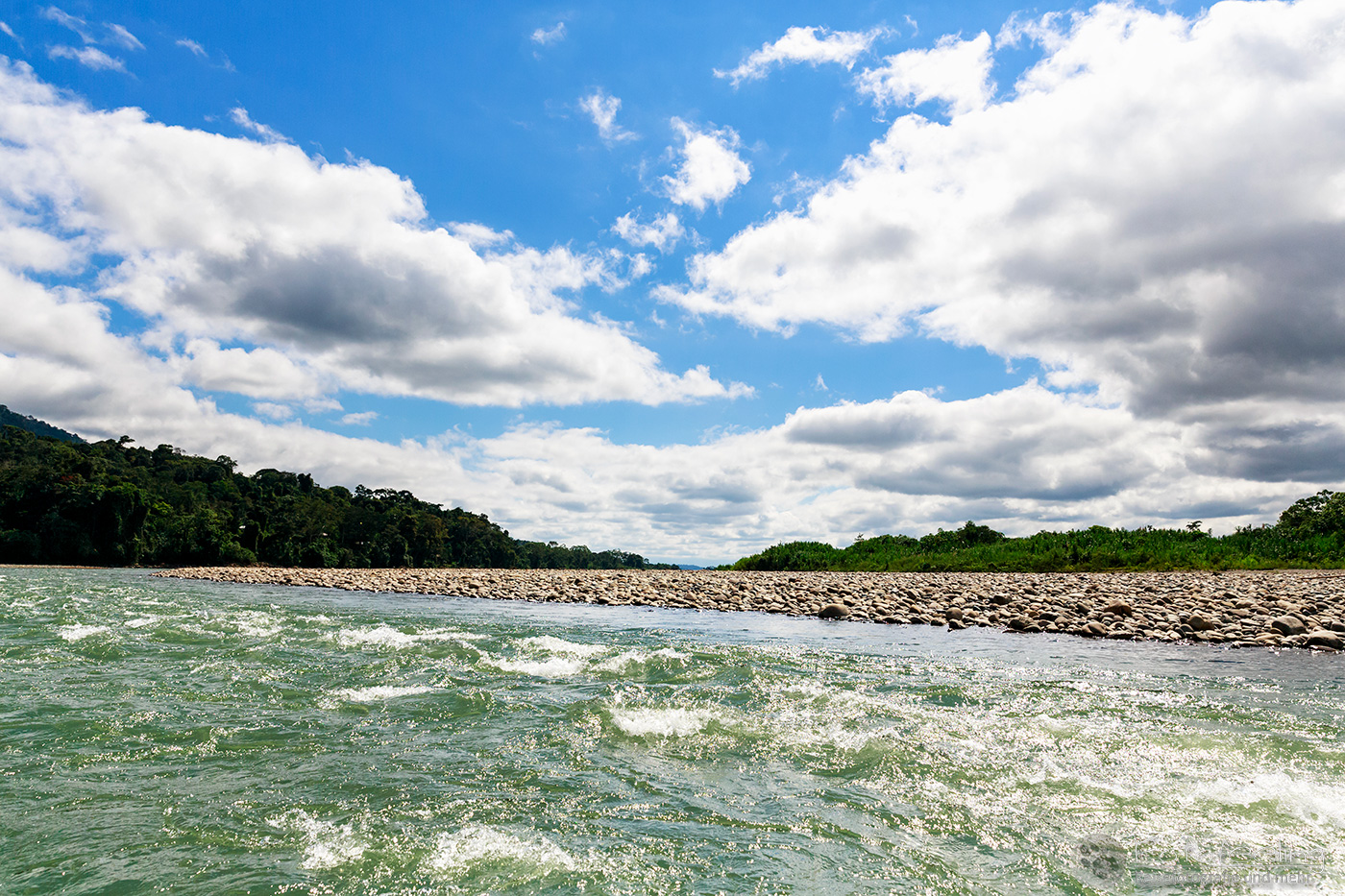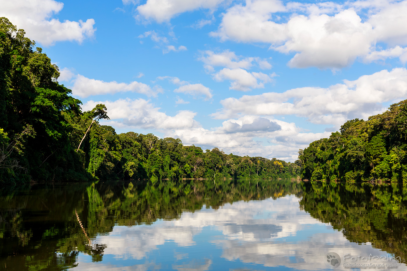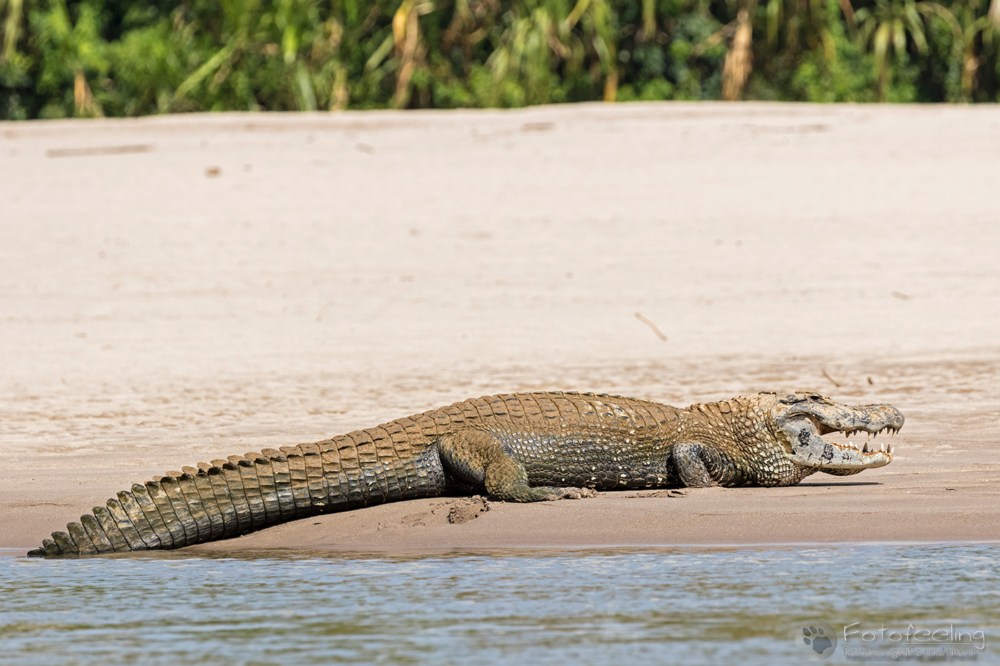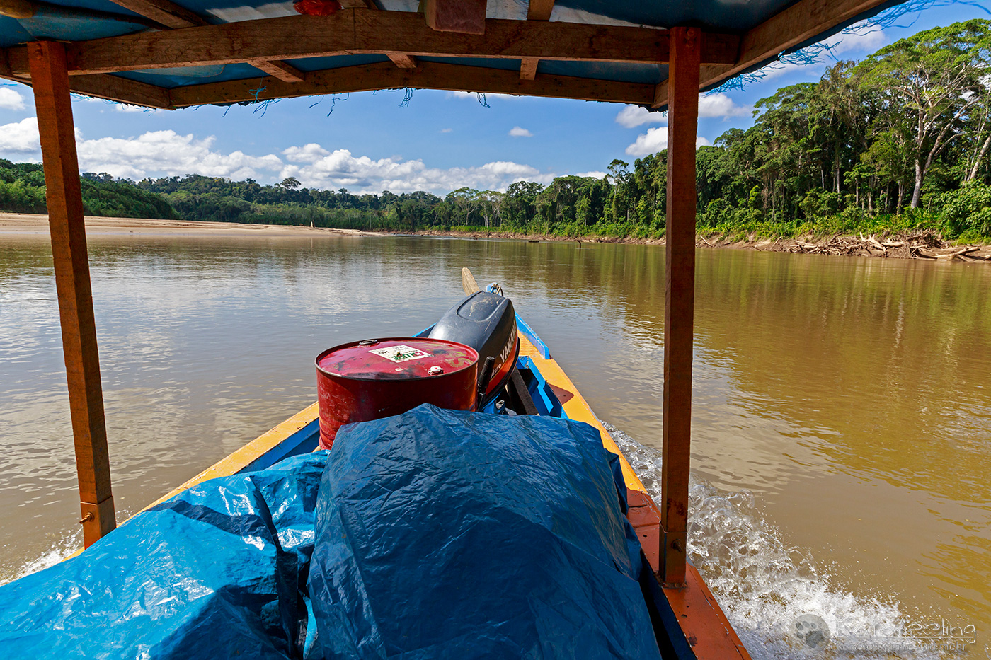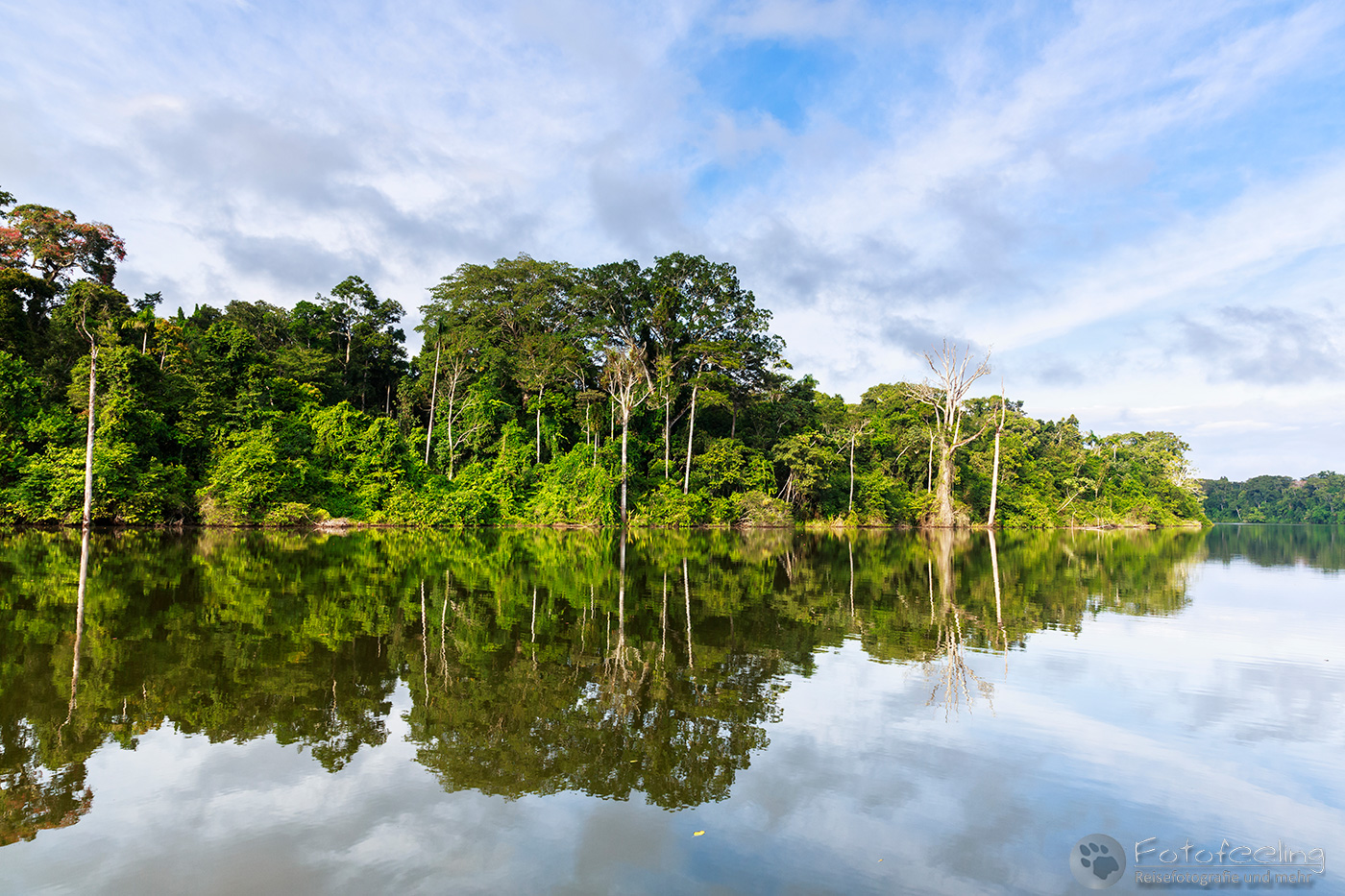 Wir fuhren in die Reservatszone des Manu Nationalparks. Hier erreichten wir die Mündung des Rio Manu und nach kurzer Fahrt die Parkstation in Limonal, wo wir uns in ein Buch eintragen mussten und unser Permit kontrolliert wurde. Wir bekamen einen fetzigen Stempel in unsere Pässe. Ich entschied mich für einen Otter und Chris natürlich für einen Jaguar. Weiter ging die Fahrt flussaufwärts in den Manu Nationalpark hinein. Wieder war es megaanstrengend, zumal es so kalt war, wie man es sich vom Regenwald eigentlich nicht vorstellen kann. Aber wir hatten etwas Pech, denn uns begleitete eine Kaltfront. Doch zum Glück sahen wir auch ein paar Tiere wie sehr scheue Capybaras (Wasserschweine), die sogleich panisch im Busch verschwanden, ein paar Kaimane (Caiman crocodylus) am Strand, einige kleine Schildkröten und ein paar Vögel. Carlos entdeckte einen Jaguarplatz, an dem vor kurzem noch eines dieser prächtigen Tiere geschlafen hatte, aber leider sahen wir nicht einmal ein Haar von dem scheuen Jäger.