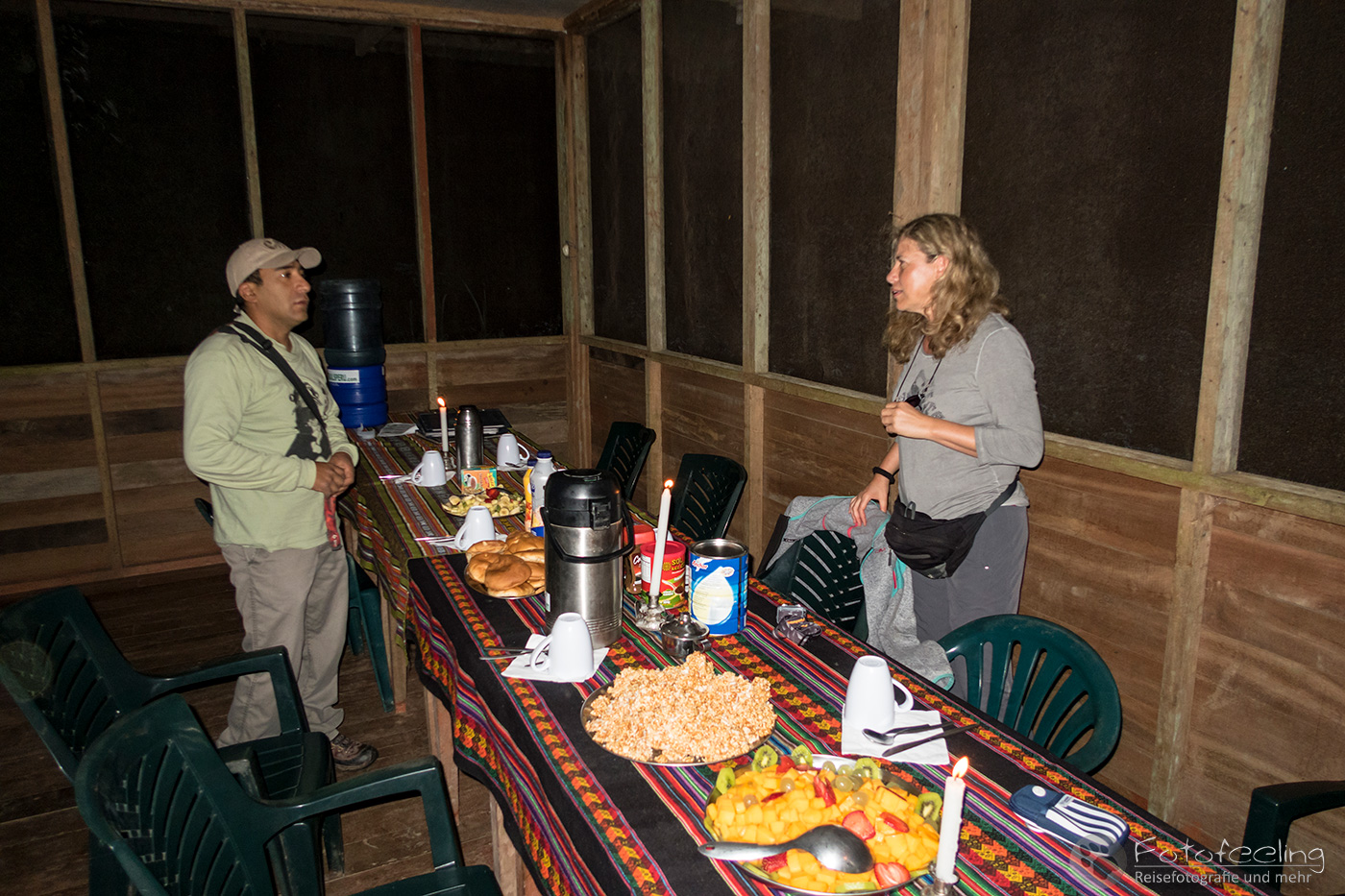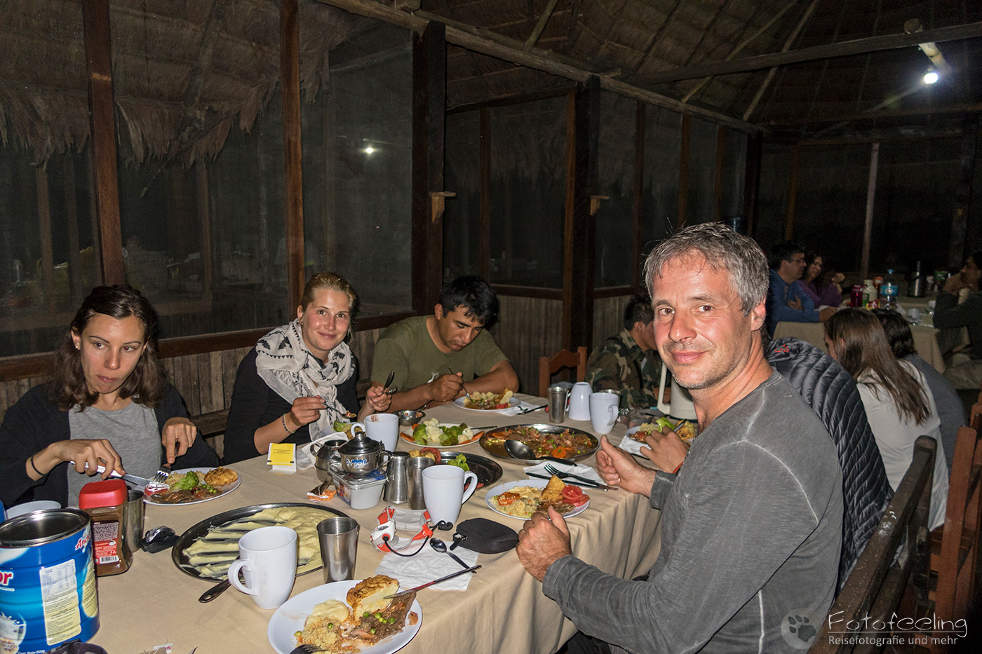 Auf der Plattform nahm jeder wieder seine Matratze ein und verspeiste noch sein Abendessen. Es gab Lomo Saltado. Sehr lecker, aber leider viel zu wenig Soße. Danach lasen wir noch etwas und mussten dann wieder das Licht ausschalten. Doch auch diese Nacht tat sich nichts. Wir schliefen bis ca. 23.00 Uhr und schleppten uns dann müde zur Lodge zurück. Carlos meinte es besonders gut und ging noch einen Umweg, den keiner von uns gebraucht hätte, denn wir waren einfach nur übermüdet.