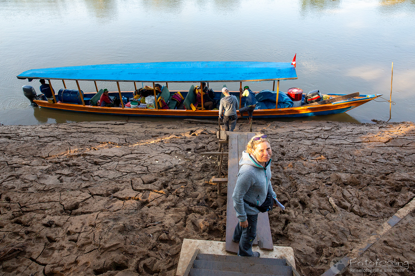 An diesem tollen Ort verbrachten wir eine ganze Weile, dann gingen wir durch den Wald zurück zum Fluss – doch zum Glück auf einem anderen Weg, denn vor dem steilen Abstieg zum Boot hätte mir schon etwas gegraut. Hier war es jedoch flach. Das Boot schaukelte sanft in den Wellen. Abendrot lag über dem Wasser und spiegelte sich wunderschön. Der Sonnenuntergang wurde immer farbenprächtiger und begleitete uns. Unterwegs schimmerte das Wasser und es sah so aus, als ob wir im flüssigen Gold schwimmen würden.