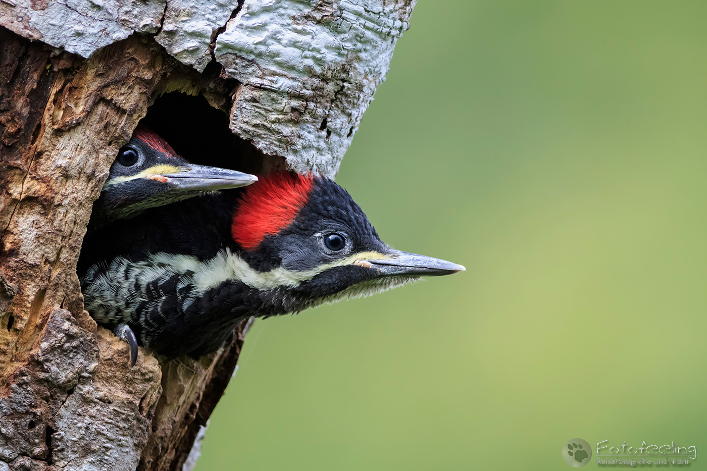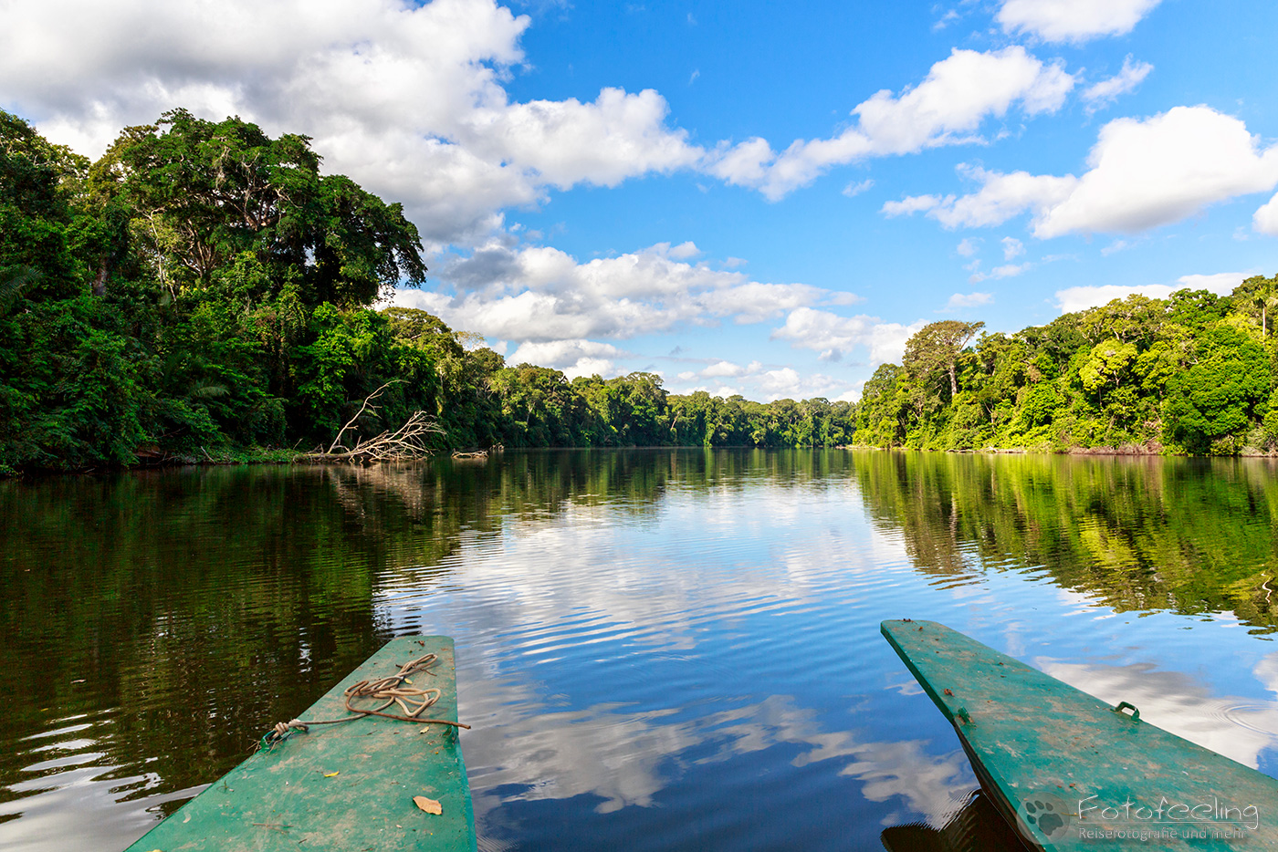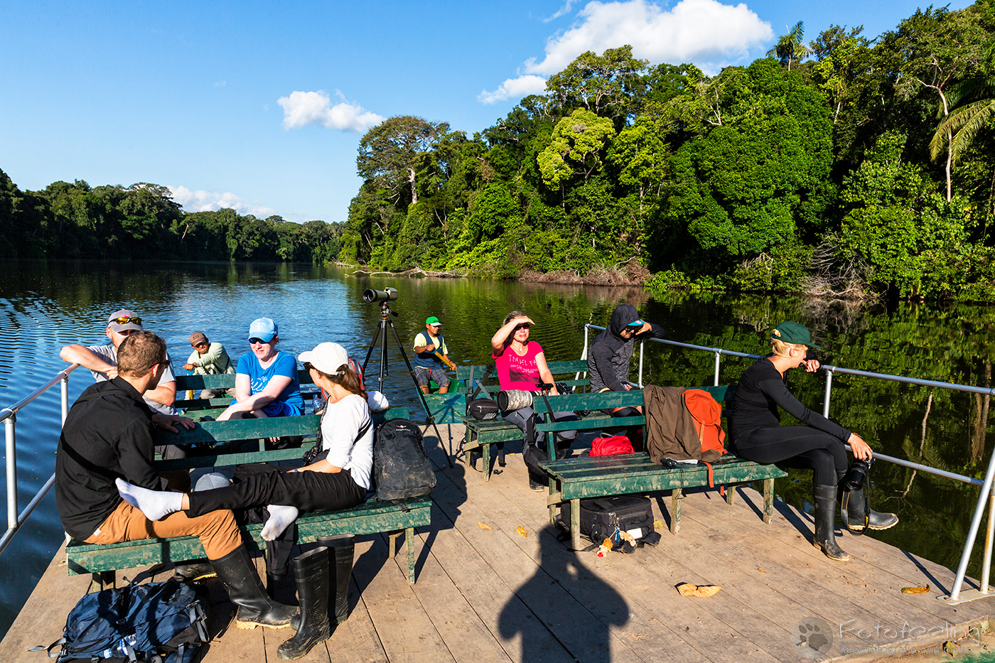 auf zur nächsten Bootsfahrt Carlos auf dem Weg zum Boot Biologische Station Pakitza, Manu Nationalpark Linienspecht (Dryocopus lineatus), Jungvögel schauen aus der Bruthöhle, Manu Nationalpark Schwarzmantel-Scherenschnabel (Rynchops niger), Manu Nationalpark Schwarzer Kaiman, Manu Nationalpark Manu Nationalpark, Peru Roter Brüllaffe (Alouatta seniculus) mit Jungtier, Manu Nationalpark