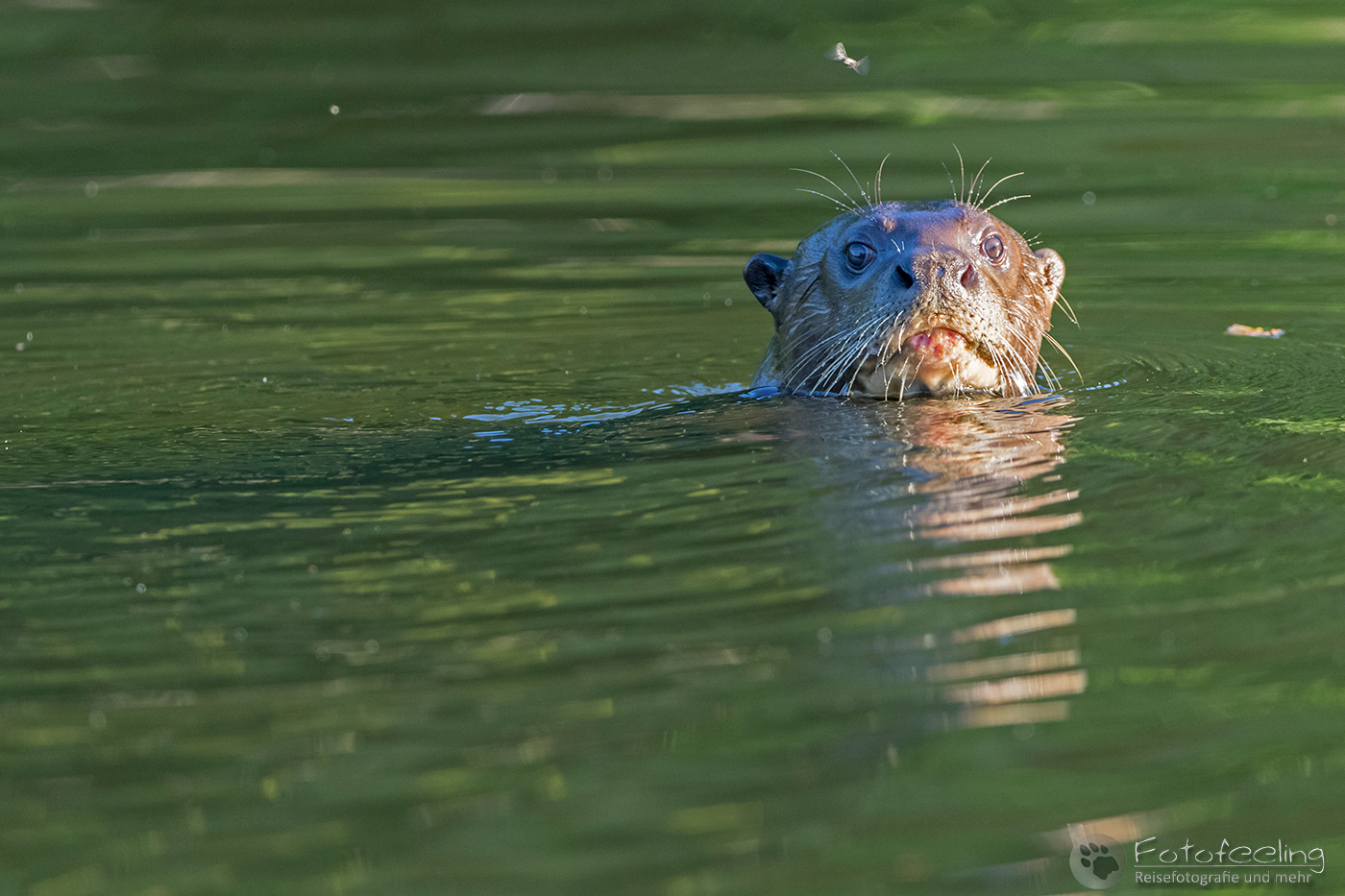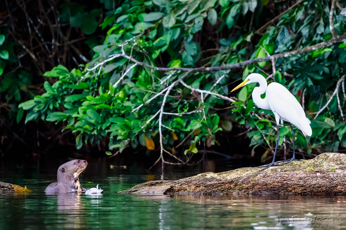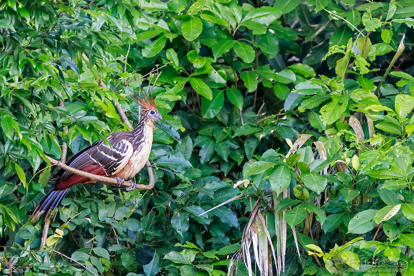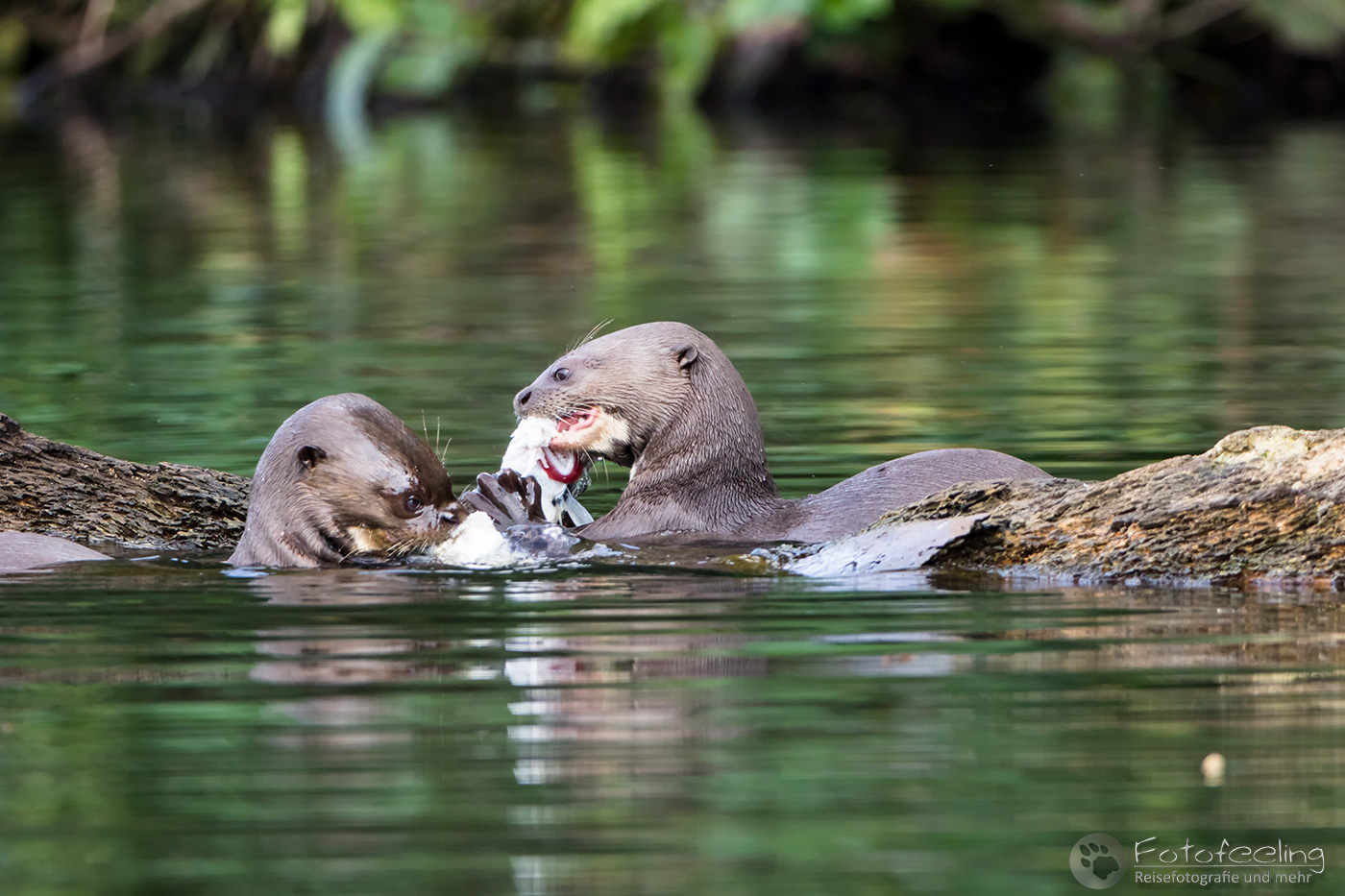 Wie auch am Vortag gingen wir ca. 15 Minuten durch den dichten Regenwald und kletterten auf das Katamaran. Ohne Motor war es einfach toll. Wir lauschten den Geräuschen des Dschungels, hörten das Plätschern des Wassers, das Rufen der Vögel, das Surren der Insekten und waren einfach froh, da zu sein. Wir sahen sogar ein paar Hoatzins (Opisthocomus hoazin), auch Schopfhuhn, Zigeunerhuhn oder Stinkvogel, die frech durch die Bäume hüpften. Nach einiger Zeit fanden wir auch die Otter, aber die waren an diesem Morgen voll mit dem Jagen beschäftigt, so dass wir sie anfangs nur aus weiter Ferne beobachten konnten. Doch mit der Zeit fingen die fleißigen Jäger ein paar Fische und fraßen sie an einigen alten Wurzeln, die aus dem Wasser ragten. Ein Reiher versuchte, ihnen etwas abzuluchsen und stellte sich dabei sehr geschickt an. Auch die Jungtiere bettelten die Eltern an, aber sie sollten selbst jagen, denn die Eltern gaben nichts ab oder nur sehr wenig. Es war einfach idyllisch und schön. Doch nach einer Stunde mussten wir zurück, denn die nächste Gruppe wollte auf das Katamaran.