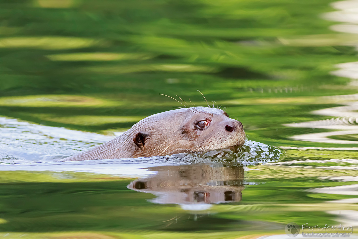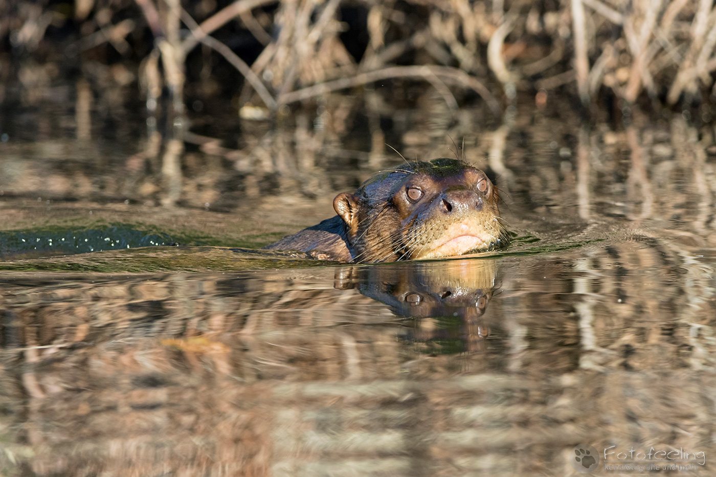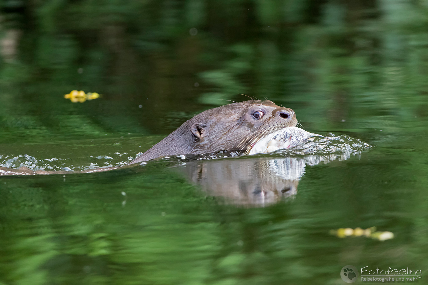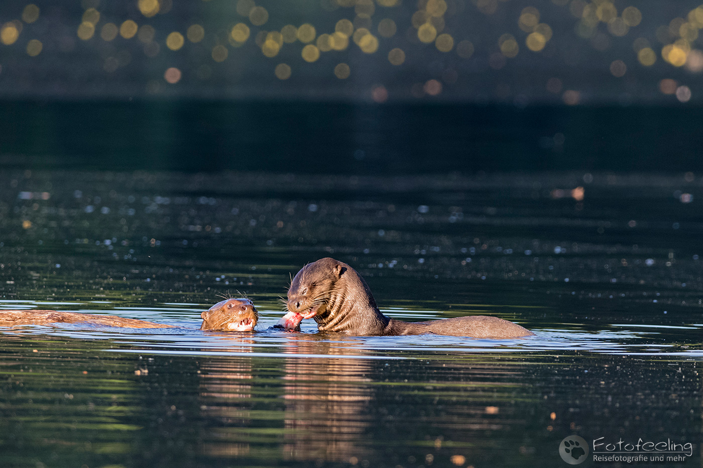 Wie auch am Vortag gingen wir ca. 15 Minuten durch den dichten Regenwald und kletterten auf das Katamaran. Ohne Motor war es einfach toll. Wir lauschten den Geräuschen des Dschungels, hörten das Plätschern des Wassers, das Rufen der Vögel, das Surren der Insekten und waren einfach froh, da zu sein. Wir sahen sogar ein paar Hoatzins (Opisthocomus hoazin), auch Schopfhuhn, Zigeunerhuhn oder Stinkvogel, die frech durch die Bäume hüpften. Nach einiger Zeit fanden wir auch die Otter, aber die waren an diesem Morgen voll mit dem Jagen beschäftigt, so dass wir sie anfangs nur aus weiter Ferne beobachten konnten. Doch mit der Zeit fingen die fleißigen Jäger ein paar Fische und fraßen sie an einigen alten Wurzeln, die aus dem Wasser ragten. Ein Reiher versuchte, ihnen etwas abzuluchsen und stellte sich dabei sehr geschickt an. Auch die Jungtiere bettelten die Eltern an, aber sie sollten selbst jagen, denn die Eltern gaben nichts ab oder nur sehr wenig. Es war einfach idyllisch und schön. Doch nach einer Stunde mussten wir zurück, denn die nächste Gruppe wollte auf das Katamaran.