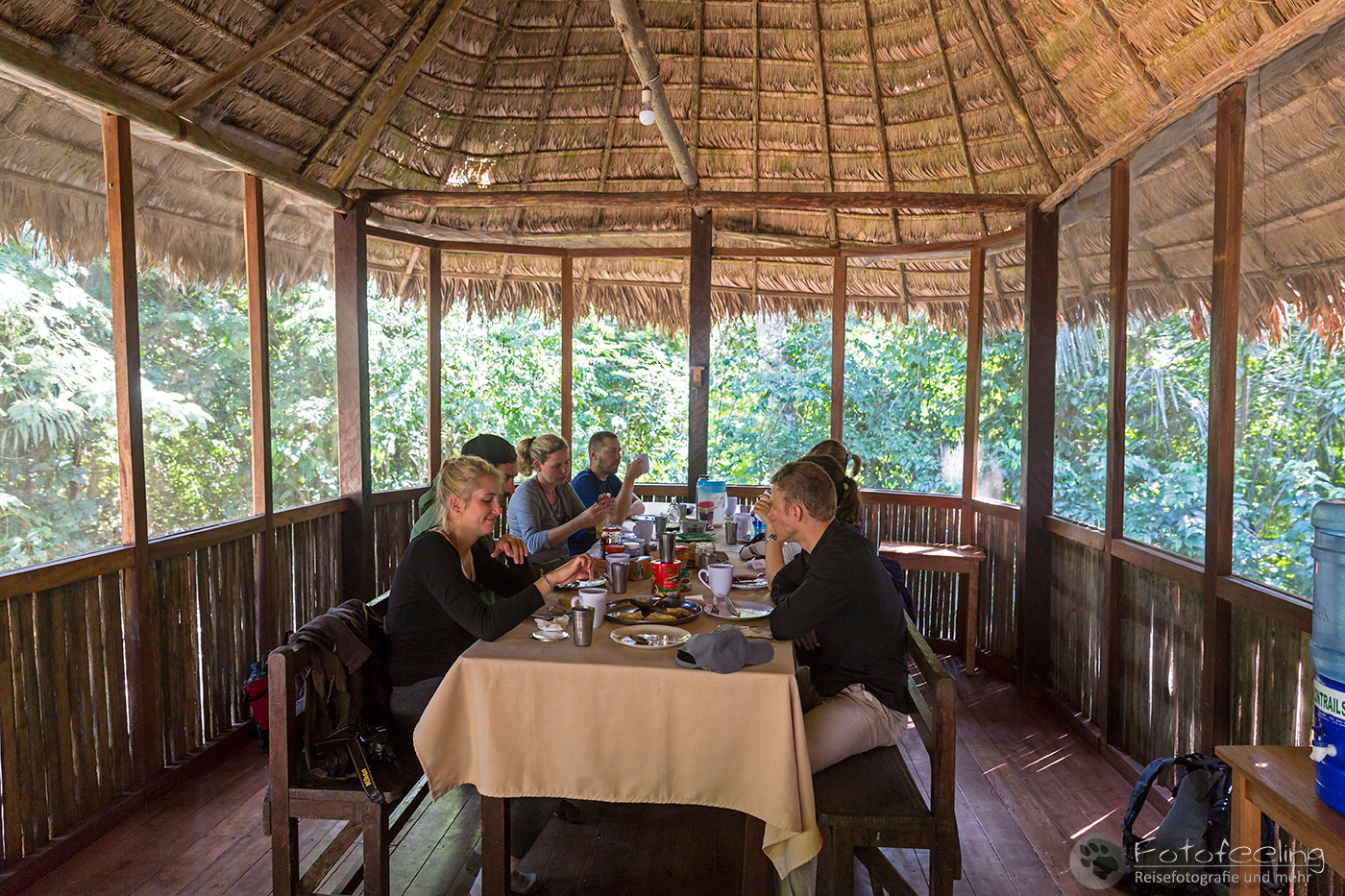Tja, das wäre schön gewesen, aber leider hatte uns niemand rechtzeitig darauf hingewiesen ,dass zu dieser Jahreszeit so gut wie keine Papageien an die Lecke kommen würden, da es viel zu viel Drumherum zu fressen gab und Samen den Job des Lehms übernahmen. Trotzdem sollte das Spaß pro Person 80 Dollar extra kosten und das war uns einfach zu viel Geld. So verzichteten die meisten von uns. Nur Max, Tschäggi und Denise machten sich mit Carlos zeitig auf den Weg, während wir anderen bis 7.00 Uhr ausschlafen durften.