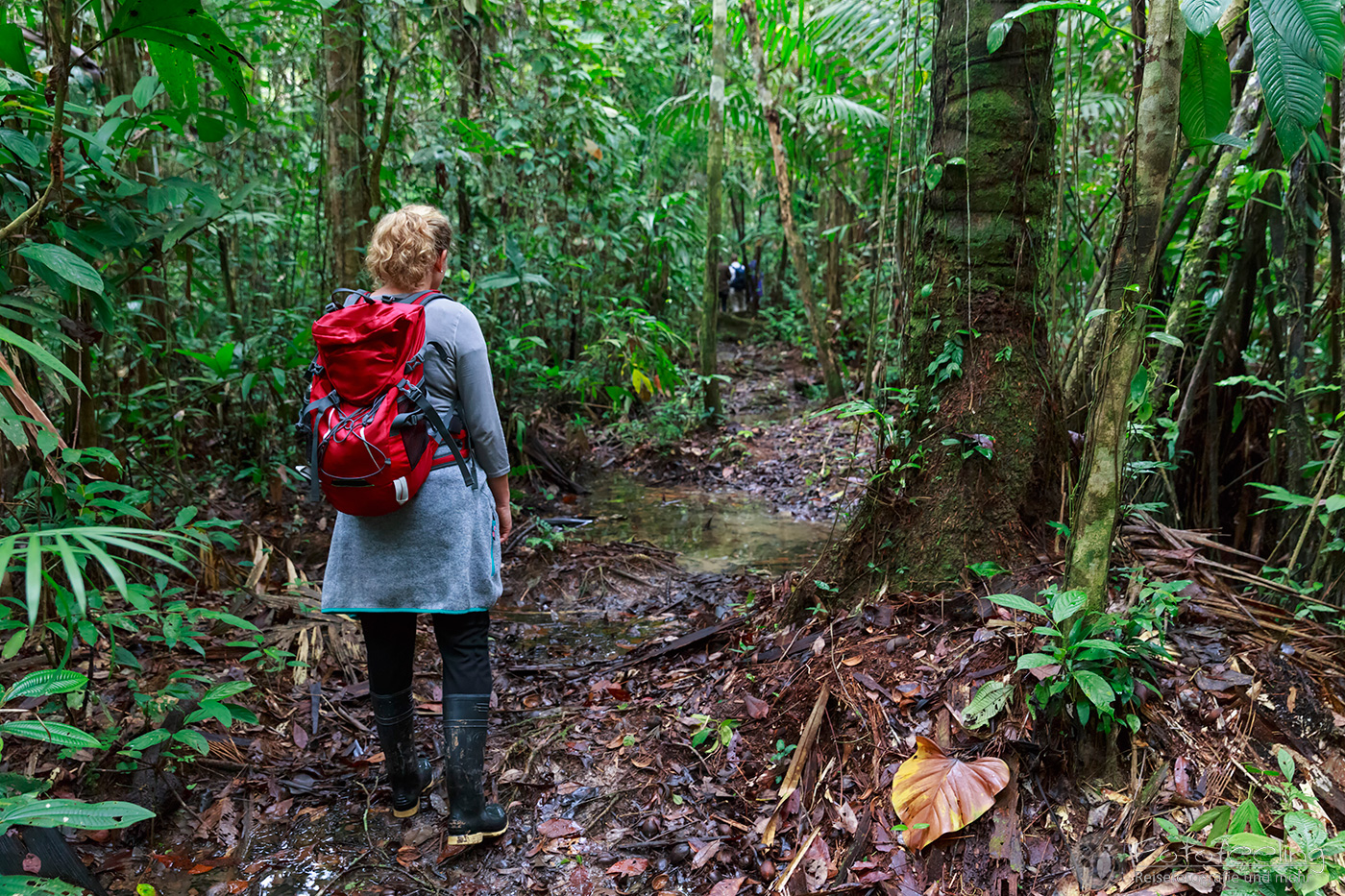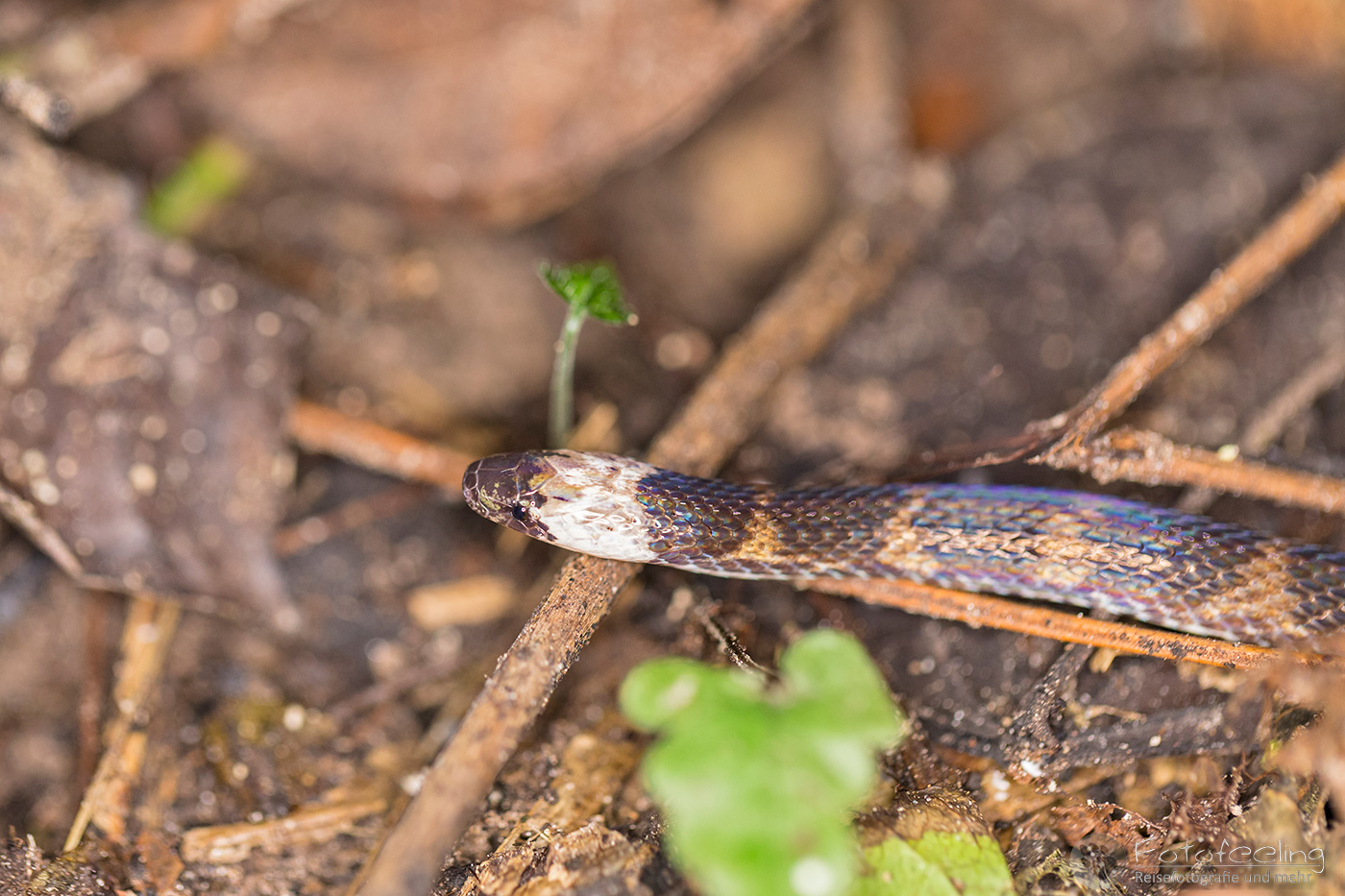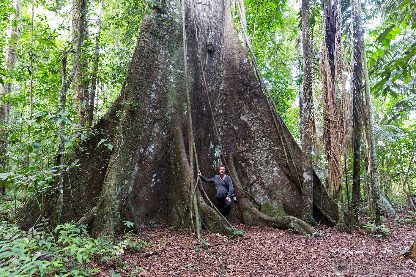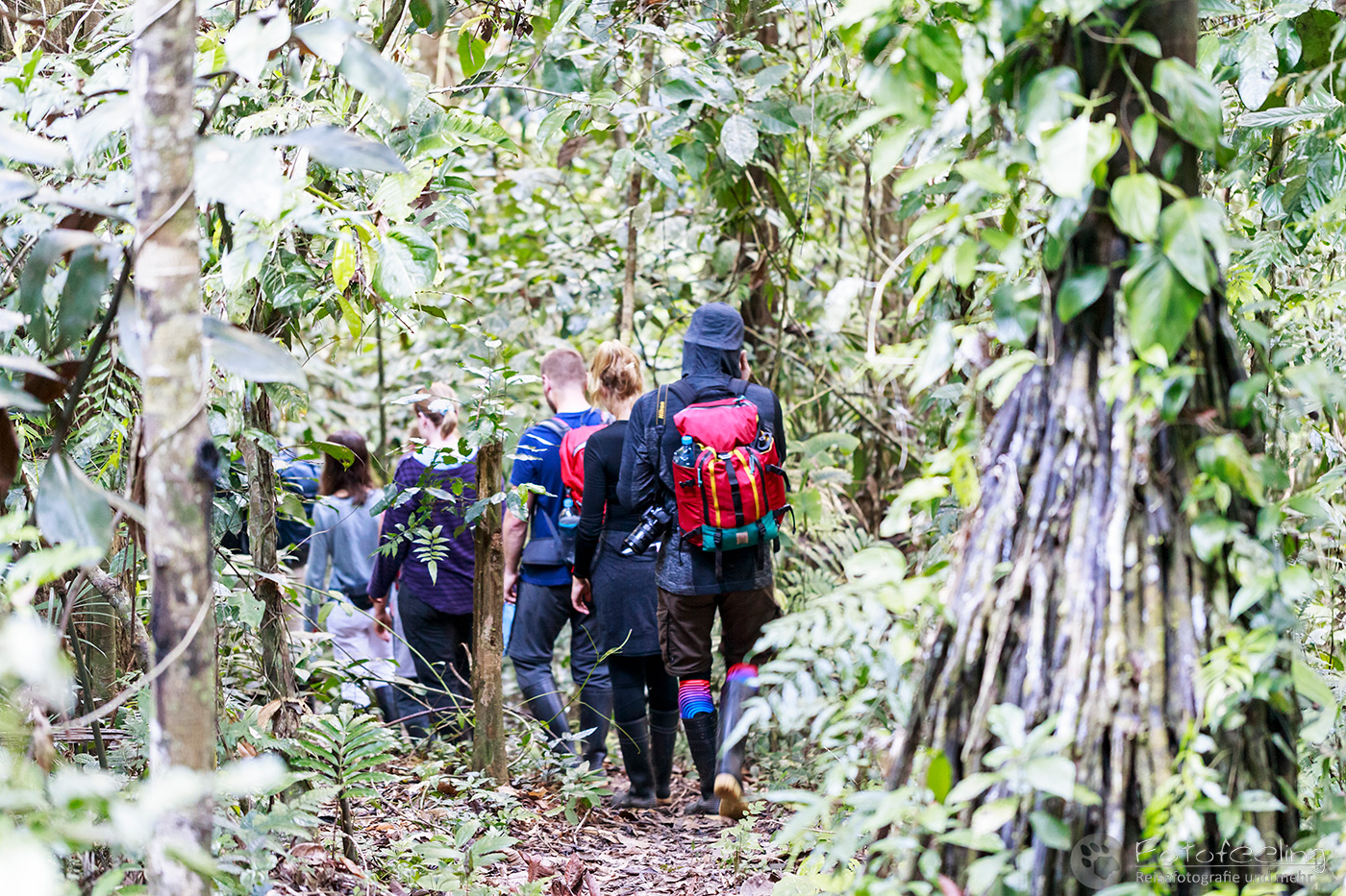 Die zwei Stunden Pause verflogen geradezu und etwas schlaftrunken versammelten sich die 8 Getreuen zum Nachmittagsdschungelspaziergang. 2,5 Stunden liefen wir durch das dichte Grün des Regenwaldes. Es war schwül an diesem Nachmittag und unzählige Mücken fielen über uns her. Wir sahen wunderschöne Urwaldbäume, wieder Klammeraffen (Ateles) und ein paar Kapuzineraffen (Cebinae) hoch oben in den Ästen. Meistens hörten wir sie eher, denn gegen den hellen Himmel waren sie meist nur als dunkle Flecken auszumachen. Ameisen liefen uns über den Weg, ein Frosch verschmolz fast mit seiner braunen Umgebung, so dass wir ihn ohne Carlos sicher nicht gesehen hätten und wir entdeckten sogar eine Schlange, die sich schnell ins schützende Unterholz verzog.