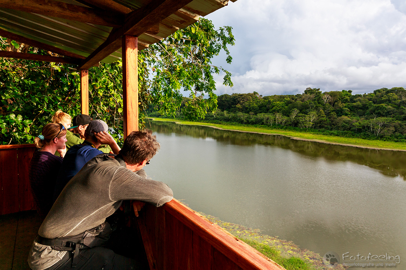 Um 12.00 Uhr waren wir zurück an der Casa Matsiguenka Lodge, wo wir eine Stunde verschnaufen konnten. Am Nachmittag fuhren wir mit dem Boot einige Kilometer flussabwärts und legten an. Diesmal war das Erklimmen des Ufers eine echte Herausforderung, denn es war extrem steil und sehr rutschig. Aber alle von uns kamen sauber und heil oben an. Wir wanderten zum Cocha Otorongo einem Altarm des Flusses, wo sich ein Beobachtungsturm befindet. 18 Meter stiegen wir den Turm hinauf. Von hier oben hatten wir eine tolle Aussicht. Kaimane schwammen im Wasser. Rot-blaue Papageien flogen laut rufend hoch über uns. Carlos stellte immer wieder sein Spektiv ein. So konnten wir die Tiere etwas näher betrachten. Klammeraffen hingen in so bizarren Posen in den Bäumen, dass jeder Jogalehrer neidisch geworden wäre. Sie fraßen sehr entspannt Blüten von Bäumen und hingen dabei ab. Auch den einen oder anderen kleinen Vogel, den wir normal nie entdeckt hätten, konnte uns Carlos durch sein Spektiv zeigen.