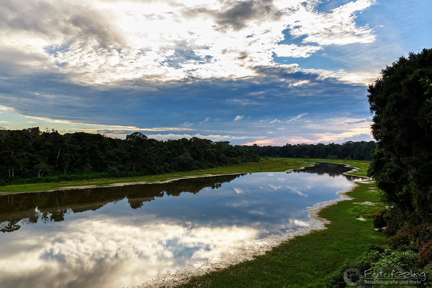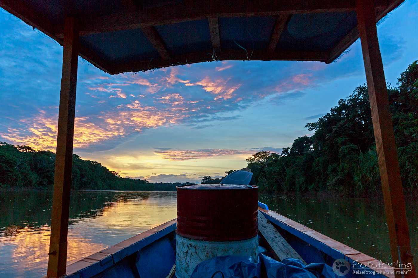 Unser Betten, Casa Matsiguenka Lodge, Manu Nationalpark über das Steilufer geht es in den Urwald Aussichtsturm an der Cocha Otorongo im Manu Nationalpark Cocha Otorongo, Manu Nationalpark Riesiger Kapokbaum (Ceiba pentandra), Manu Nationalpark Ab ins Boot, Manu Nationalpark Río Madre de Dios, Manu Nationalpark Sonnenuntergang auf dem Río Madre de Dios, Manu Nationalpark