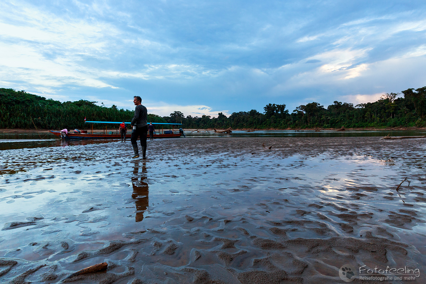 Um 6.30 Uhr frühstückten wir leckere Pfannkuchen, die mit Obst und Erdnussbutter gefüllt waren und begaben uns gut gesättigt auf unser Folterboot. Wieder ging es zwei Stunden flussaufwärts bis zur Biologischen Station Pakitza, die Grenze zur intangiblen Zone des Manu Nationalparks. Hier wollten wir eine Wanderung zu einer Lehmlecke machen, aber das schlechte Wetter der letzten Zeit hatte den Weg unpassierbar gemacht. Carlos bekam jedoch die Erlaubnis etwas weiter in die Sperrzone hinein zu fahren um nach Tieren Ausschau zu halten. Eigentlich wäre ich lieber gegangen, denn meine Beine schmerzten vom Sitzen fürchterlich, aber so eine Gelegenheit, etwas weiter in den Nationalpark hineinzufahren, bekommt man ja nicht alle Tage. So biss ich die Zähne zusammen und wir setzten die Fahrt flussaufwärts fort. Angestrengt suchten wir das Ufer ab, aber bis auf ein paar wenige Kaimane, ein paar Geier, die einen toten Kaiman fraßen, ein paar Affen, die in den Ästen tobten und eine Hand voll Vögel sahen wir nicht viel. Auf einmal verlangsamte unser Boot die Fahrt. Carlos und unser Bootsführer redeten aufgeregt und schauten noch angestrengter. Irgendwas tat sich am anderen Ufer und wirklich Carlos hatte einen Jaguar entdeckt, der gerade noch auf einer Sandbank lag und die Sonne genoss. Ich konnte sein helles Fell erkennen und die typischen schwarzen Punkte. Lässig erhob er sich und schlenderte ins Gebüsch. Dort legte er sich hin und beobachtete uns. Leider war er sehr weit weg. Unsere Bootsführer legten an einer Sandbank an und wir verließen das Boot. Carlos wollte uns durch sein Spektiv den Jaguar zeigen. Aber der Weg zu dem Spektiv erwies sich als unpassierbar, denn der Untergrund war schlammig und wir sackten immer weiter in den Schlamm ein. Besonders Chris, der dem Spektiv am nächsten war, wurde immer kleiner, bis der Schlamm fast in seine Gummistiefel sickerte. Ich versuchte erst gar nicht die kleine Anhöhe zu erklimmen, sondern betrachtete schmunzelnd das „Schlammcatchen“. Vicky half nämlich gerade Chris, der langsam in einer unangenehmen Situation steckte und das im wahrsten Sinne des Wortes. Sein Gummistiefel saß fest und nur mit viel Kraft und Mühe schaffte er es mit Hilfe von Vicky aus dieser Miesere. Ihr Stiefel saß daraufhin ebenfalls fest und Vicky stand in grünen „Leuchtesocken“ auf einem Brett, das unser Bootsführer zu unserer Rettung gebracht hatte. Max machte sich lustig über Vicky und Chris, weil sie soooo schwer waren, das sie im Schlamm versinken und wollte daraufhin elegant nach hinten weg. Dabei versank er bis zu den Knien im Matsch. Woraufhin wir anderen noch mehr lachen mussten. Denise ging es ähnlich. Sie hüpfte irgendwann auf einem Bein im Schlamm herum und drohte umzufallen, doch ihr Mann Tschäggi half ihr und stecke dabei auch fast fest. Nur unsere Leichtgewichte Manu und Marco konnten elegant über den zähen Schlamm laufen, ohne allzu sehr zu versinken. Es war urkomisch und wir konnten uns kaum halten vor Lachen. Natürlich war der Jaguar längst über alle Berge. Ich sah ihn vor mir, wie er kopfschüttelnd und sehr irritiert in den Regenwald schlenderte und musste gleich noch mehr lachen.
