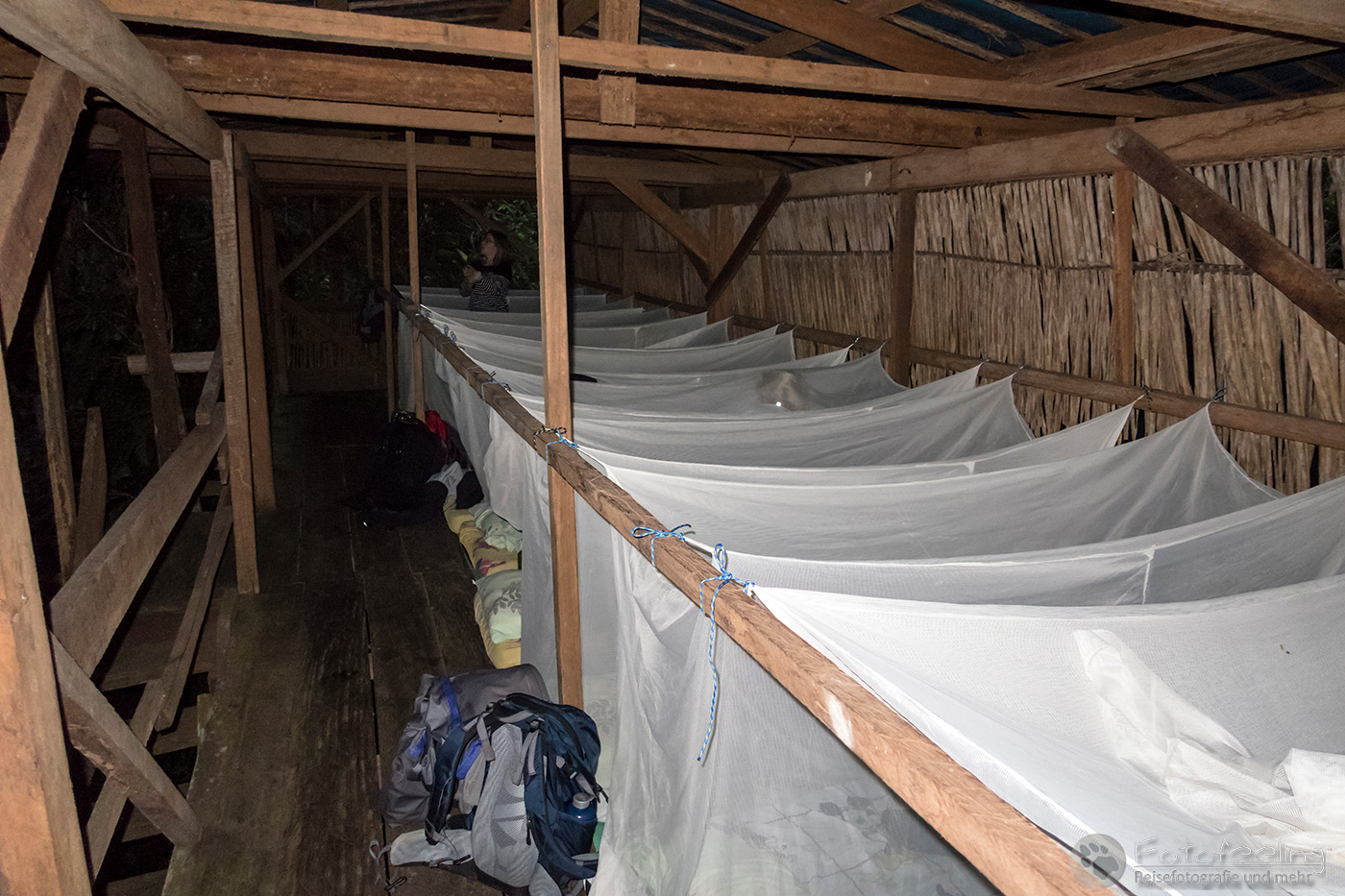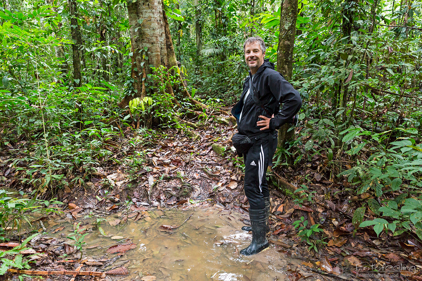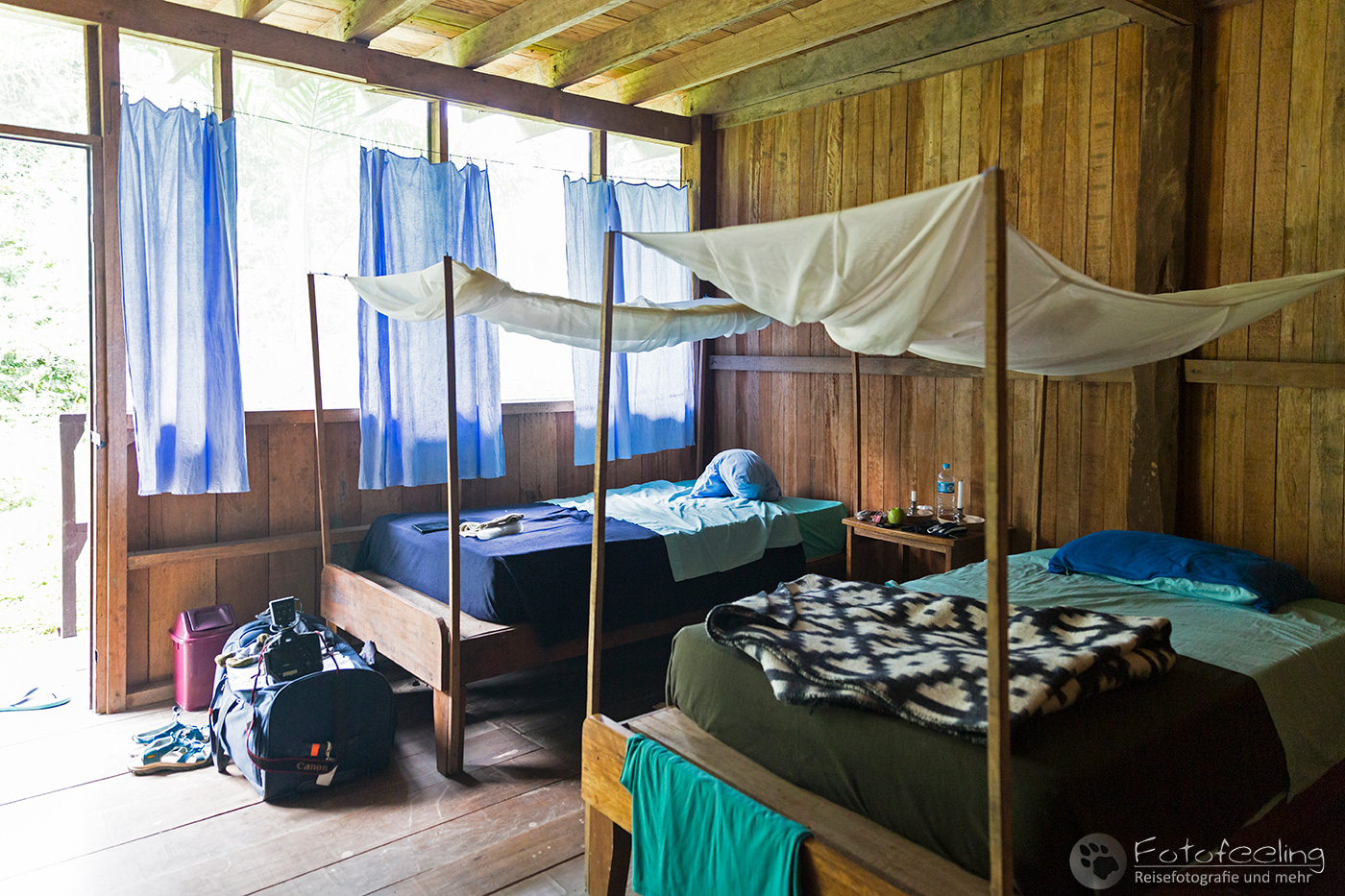 Unser Zimmer lag in einem doppelstöckigen Holzhaus, das in einem tropischen Garten lag. Hier war alles etwas komfortabler und wir hatten endlich sogar eine warme Dusche, die wir gleich ausgiebig testeten. Eine Stunde später, gab es schon um 17.00 Uhr Abendessen. Danach wanderten wir 2,5 km durch den Regenwald. Durch den aufgeweichten Boden war es eher eine Kletter-Matsch-Partie als eine Wanderung, denn immer wieder ging es über Holzplanken durch tiefe Pfützen. Nach ca. einer Stunde kamen wir an der Salzlehmlecke an. Hier stand es, ein großes Holzhaus auf Stelzen, das wir über eine Leiter erklommen. Oben gab es eine Toilette und auf dem Boden lagen Matratzen mit einem Moskitonetz darüber und sehr lustigen Kinderlaken. Da wir absolut ruhig sein mussten und es schon dunkel war, schliefen wir alle schnell ein. Leider tat sich gar nichts, denn es war viel zu kalt und feucht. So schliefen wir bis 3.00 Uhr, dann weckte uns Carlos und wir wanderten schlaftrunken wieder zurück zur Lodge, wo wir um 4.00 Uhr morgens hundemüde in unsere Betten fielen.