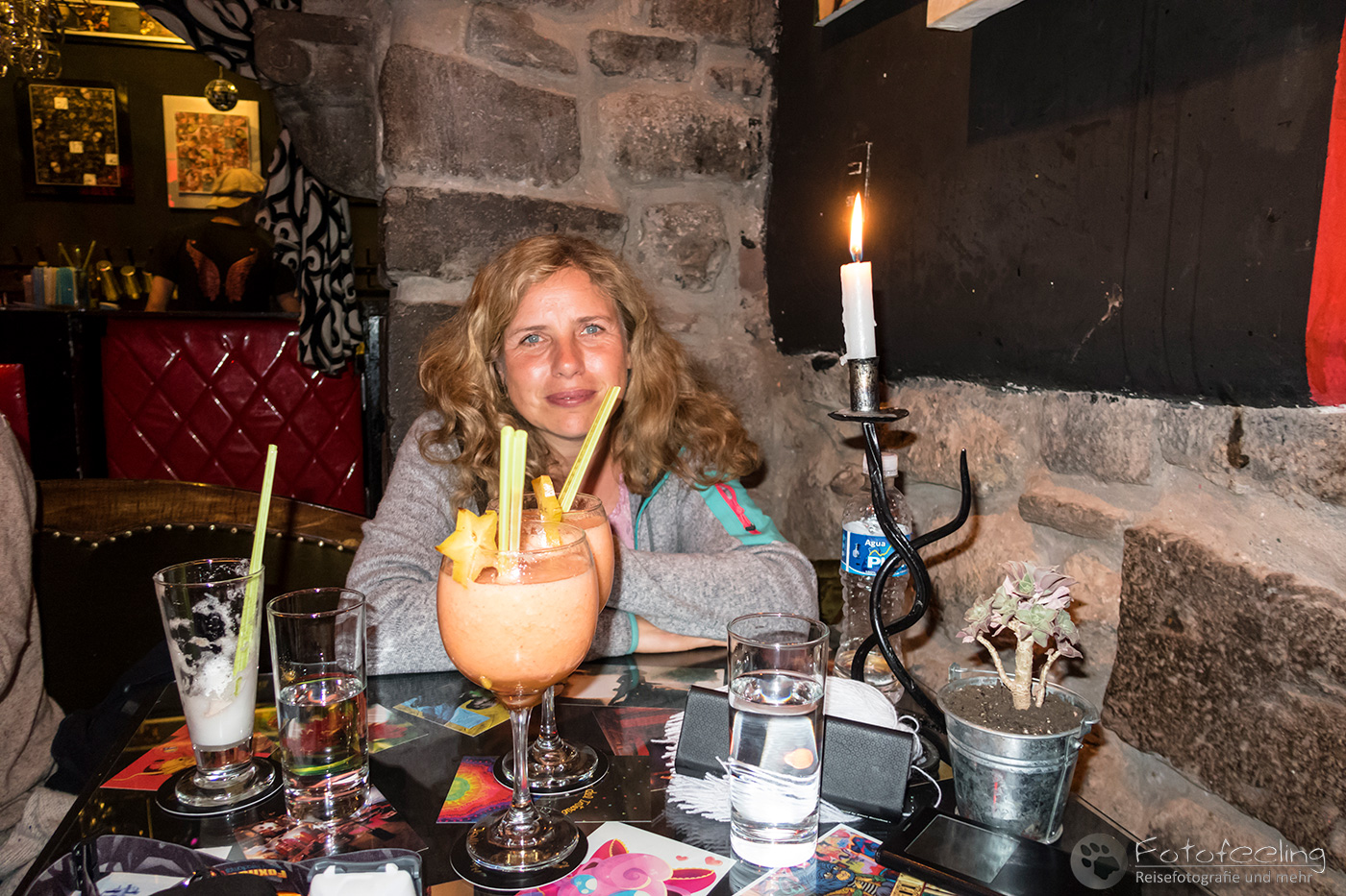 Wir schlenderten noch einmal über die Plaza und suchten das Restaurant „El Celler de Cler“, das wir nach einigem hin und her auch fanden. Wir beschlossen, auf dem schönen Balkon noch einen Pisco Sour zu trinken. Die Mädels dort waren absolut liebenswert und das Essen an den anderen Tischen sah sehr gut aus. So reservierten wir kurzerhand einen Tisch für den nächsten Abend.