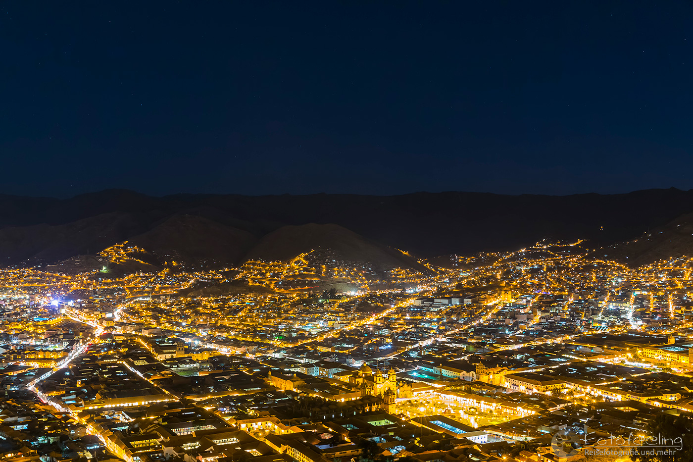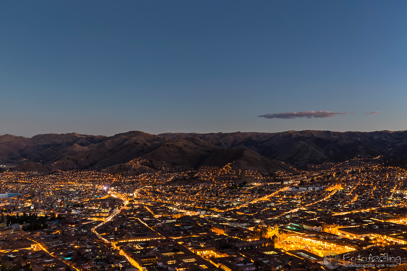 Nach einer weiteren nachmittäglichen Runde über die Plaza de Armas ließen wir uns ein Taxi kommen und uns zur Cristo Blanco Statue bringen. Von hier oben hat man wirklich eine tolle Aussicht über die Stadt und die umliegenden Berge. Auch an diesem Nachmittag kamen immer wieder Reisebusse vorbei, die ihre Insassen für einen kurzen Fotostopp ausspuckten und danach wieder in Richtung Cusco verschwanden. Wir waren froh, dass wir genug Zeit hatten und zuschauen konnten, wie sich die Farben veränderten. So wurde aus dem späten Nachmittagslicht langsam die Dämmerung bis es schließlich dunkel war. Mit der Dunkelheit wurde es auch wieder empfindlich kalt und schon bald hatten wir alles an, was wir dabei hatten. Leider war weit und breit kein Taxi zu bekommen. Da hatte Chris die geniale Idee, in einem Tourbus nachzufragen und siehe da, gegen einen kleinen Obolus nahm uns der Bus mit und setzte uns an der Plaza de Armas wieder aus. Das hatte vielleicht gut geklappt!