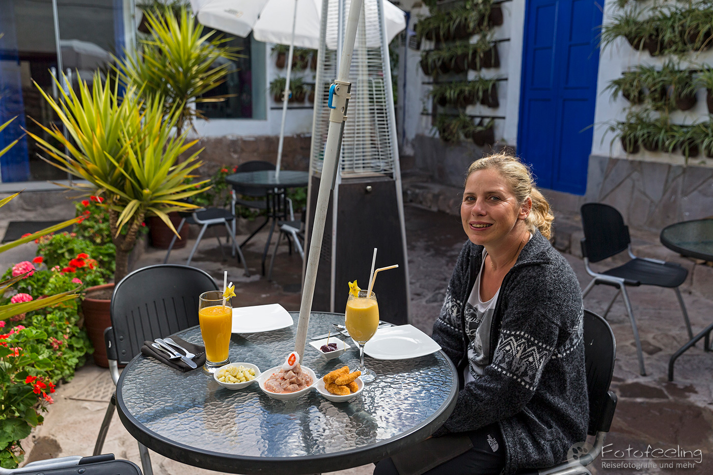 Unser neues Hotel Fallen Angel - The Small Luxury Guest House, Cusco Endlich wieder Pisco Sour und frischer Obstsaft Tolles Ambiente im Fallen Angel - The Small Luxury Guest House, Cusco Unser Tisch, eine Badewanne mit Goldfischen