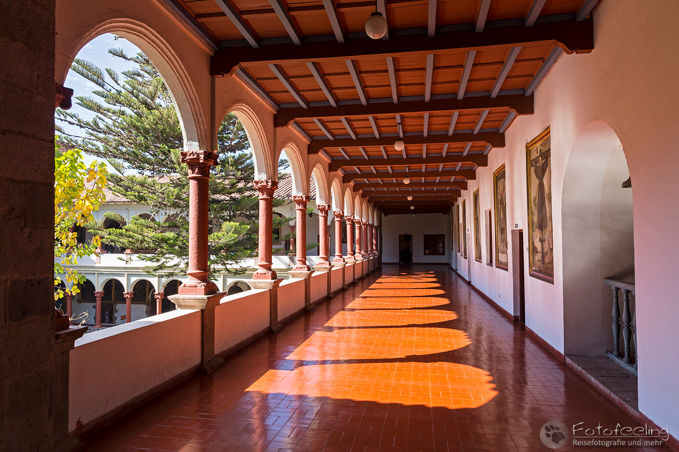 Auch die schönste und abwechslungsreichste Reise geht einmal zu Ende und da war er nun der Tag unserer Abreise. Wir genossen ein letztes gutes Frühstück in unserem tollen Zimmer und suchten noch einmal ein paar Plätze in der Stadt auf, die wir noch nicht angeschaut hatten. So landeten wir an der Kirche und dem Kloster San Francisco am gleichnamigen Platz, auf dem auch wieder viele Verkaufsstände aufgebaut waren. Nachdem wir ein wenig durch die Stände geschlendert waren, wollte Chris das Museum besichtigen. Leider durfte man es nicht alleine anschauen, sondern nur mit einem Führer. Das war aber in dem Fall auch gut so, denn so kamen wir in die Katakomben, wo noch immer Knochen aufbewahrt werden und konnten wunderschöne Gemälde bewundern. Hier befindet sich auch eines der größten Gemälde Südamerikas. Es ist 12 x 9 m groß und beinhaltet den Stammbaum der Franziskaner mit 683 Personen und 226 Familienwappen. Es wurde von dem Maler Juan Espinoza gemalt. Auch die südamerikanische Variante des Abendmahls von Leonardo Da Vinci bewunderten wir. Hier wurde Meerschweinchen zum Essen gereicht. Damit haben die Maler, indigene Elemente mit in die christlichen Bilder einfließen lassen, denn so sollte sich die indigene Bevölkerung mit der neuen Weltanschauung identifizieren können.