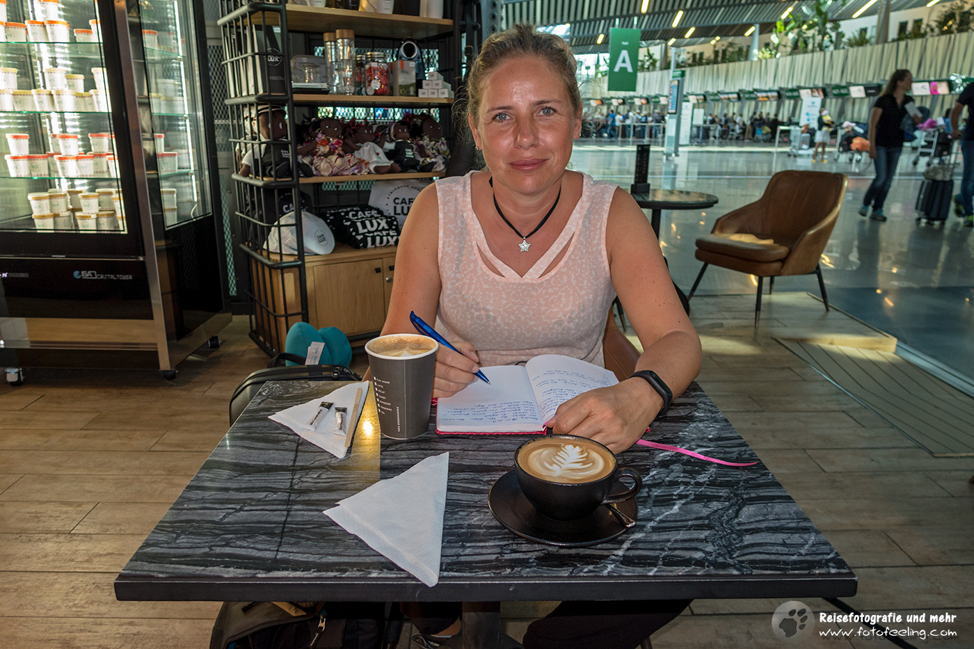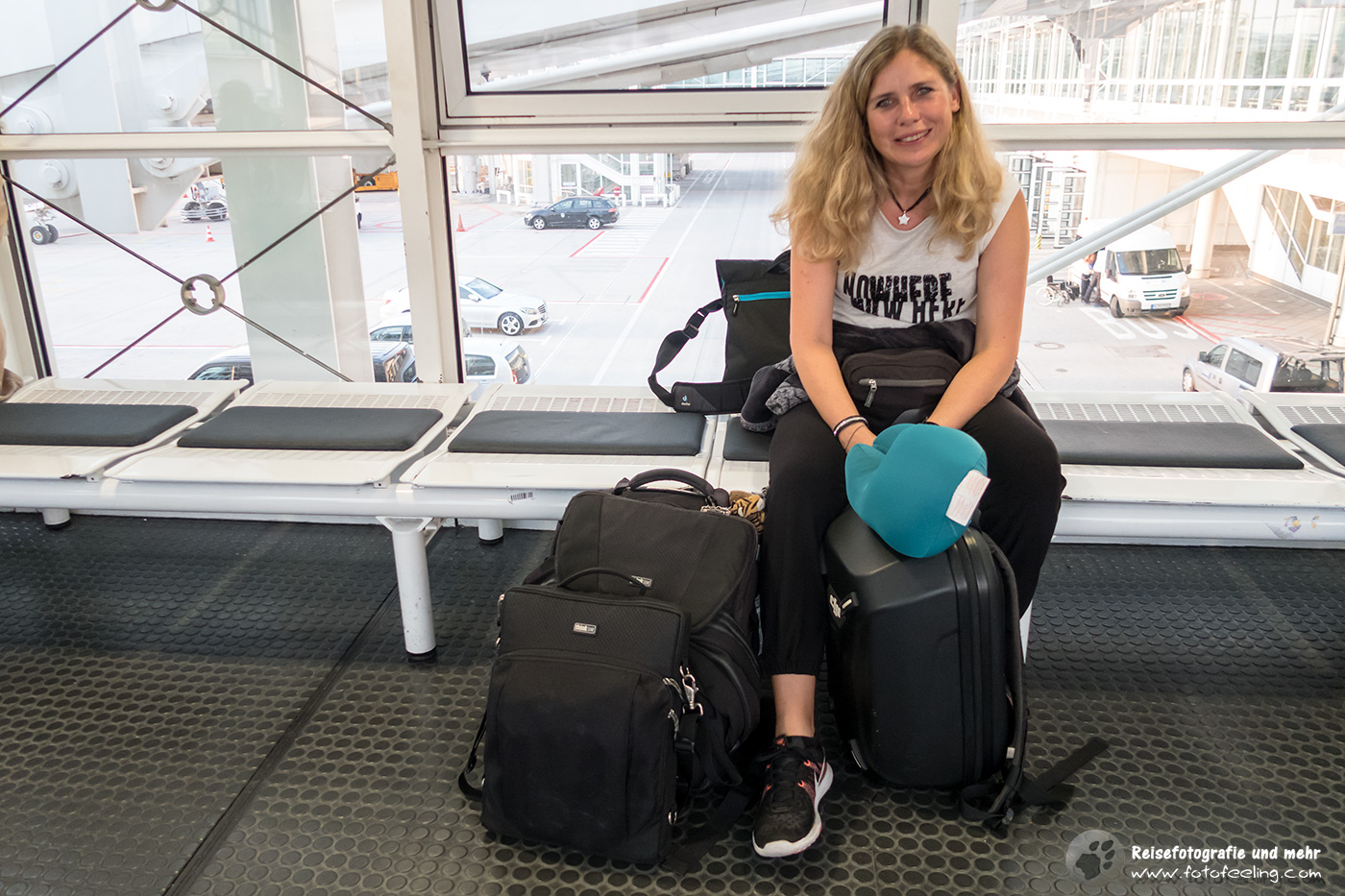 Die Taschen waren gepackt und alles Wichtige gut verstaut. Ich hatte schon ein paar Tage frei und war im Urlaubsmodus, während Chris bis mittags arbeiten ging. Wir tranken noch mit der Familie Kaffee und gegen 17.00 Uhr verabschiedeten wir uns von unseren Süßen. Chris Mutti brachte uns zum Flughafen. Wir waren fast alleine beim Einchecken und hatten schnell die Taschen abgegeben. Diesmal flogen wir mit der Condor, wo ich Plätze in der Premium Economy ergattert hatte. So konnten wir 25 kg Gepäck ohne Aufpreis mitnehmen und hatten Sitzplätze mit etwas mehr Beinfreiheit, was bei einem Nachtflug wirklich angenehm ist. Auch das komplette Entertainment- Paket war natürlich dabei – ein Muss für Chris. Wir schauten Piraten der Karibik und Alien, dann konnte ich nicht mehr und schlief bis zum Frühstück, das im Gegensatz zum Abendessen richtig gut war.
