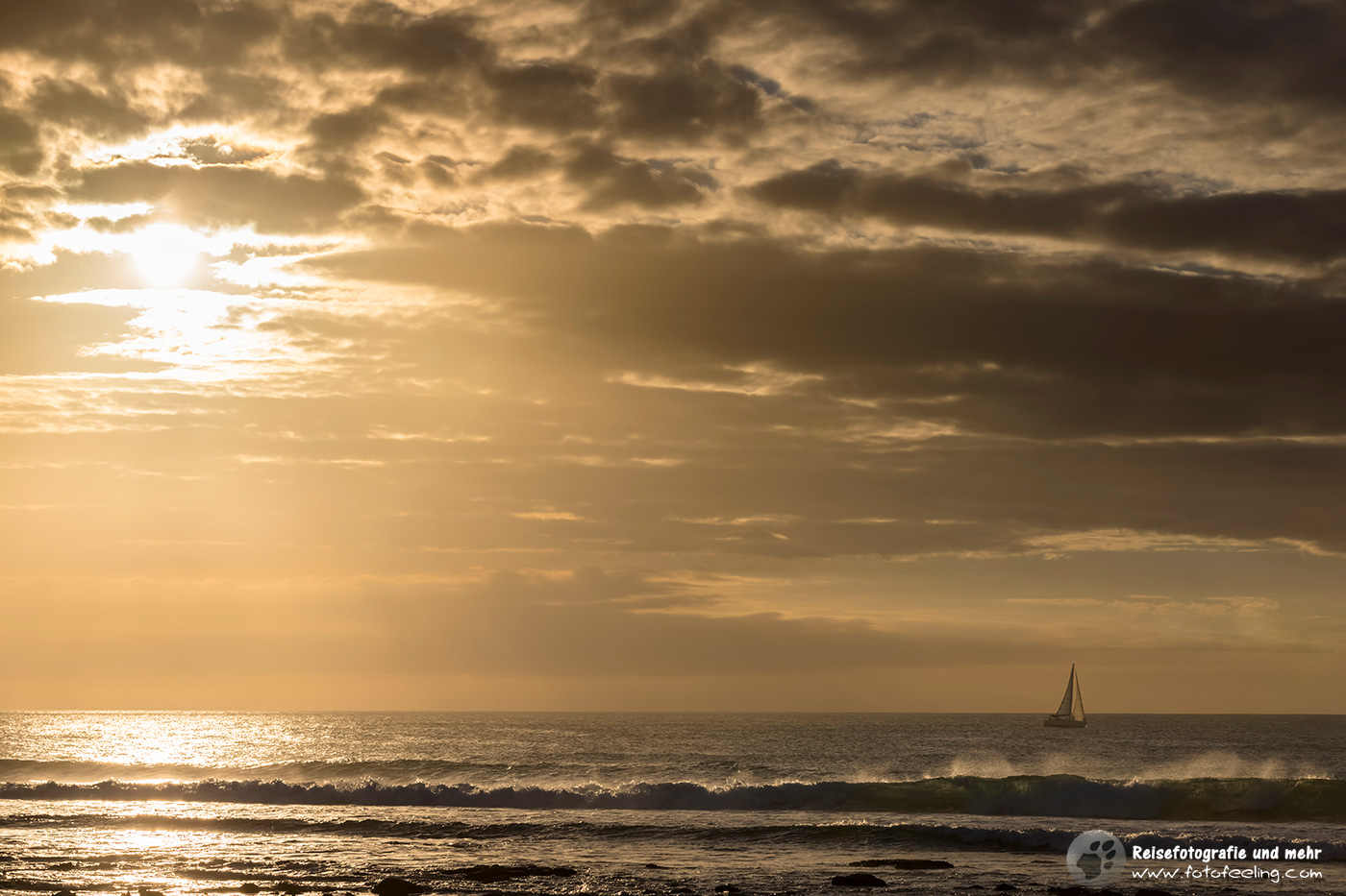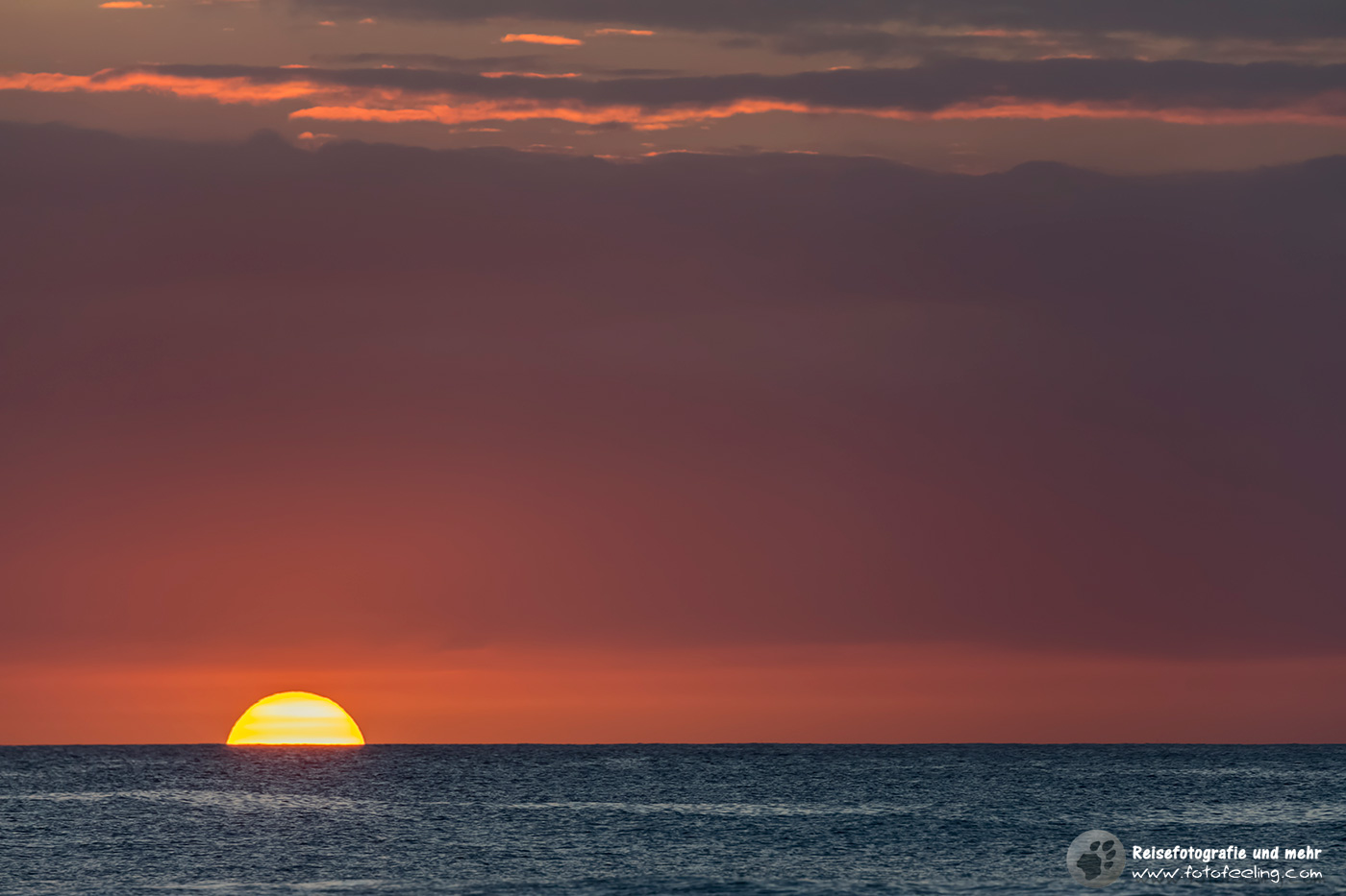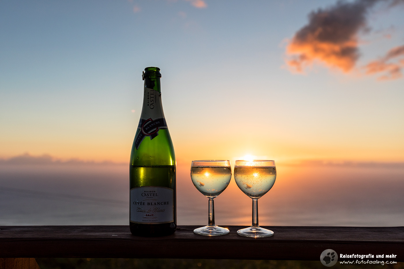 In unserem Zimmer verstauten wir alles und genossen den Sonnenuntergang mit einem Glas Sekt am Pool. Es war sommerlich warm, aber es kühlte mit Sonnenuntergang ganz schön ab. Wunderschön versank die Sonne im Meer. Wir waren angekommen.