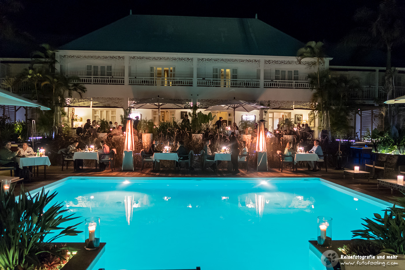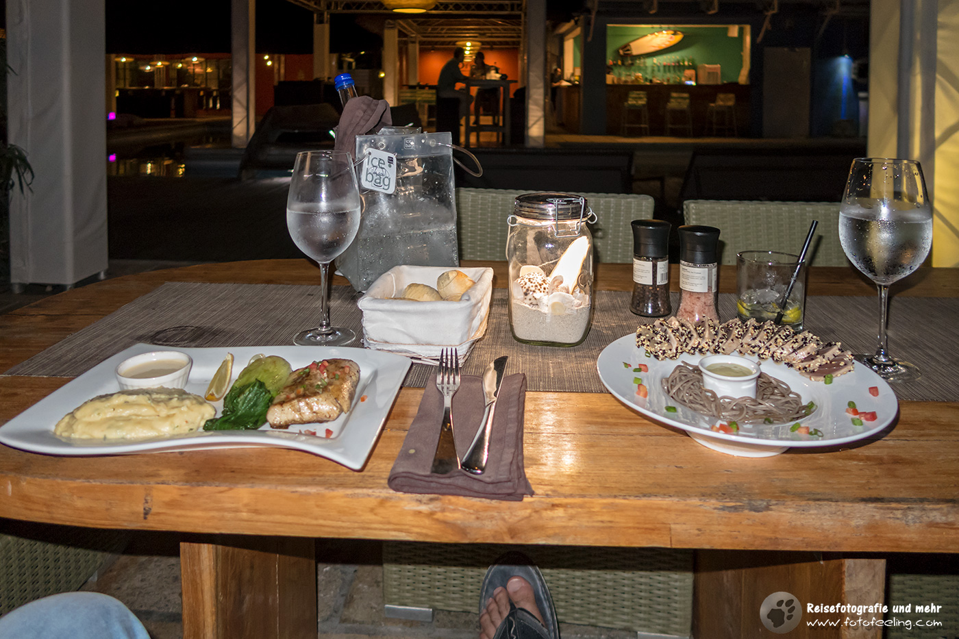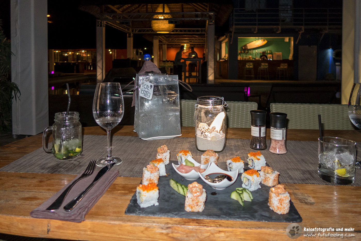 Das Essen am Abend im Le Off, war wirklich lecker. Wir saßen in einer Nische am Pool mit Blick auf die Bar und tranken erst einmal einen Cocktail. Chris nahm einen Rumtea und ich einen Passionsfrucht-Mojito. Chris „Tee mit Rum“ war wirklich gut, aber mein Mojito war der Hammer. So fruchtig und süffig – einfach nur mhhh. Als Vorspeise bestellten wir eine Sushi-Platte, die ebenfalls absolut lecker war. Chris aß dann Thunfischsteak in Wasabi-Soße und ich Dorade mit Kartoffelpüree und Gemüse. Wir waren wirklich begeistert von dem tollen Essen und dem schönen Ambiente. Anfangs waren wir noch fast alleine, aber etwas später füllte sich das Restaurant und einige Gäste ohne Reservierung mussten wieder gehen.