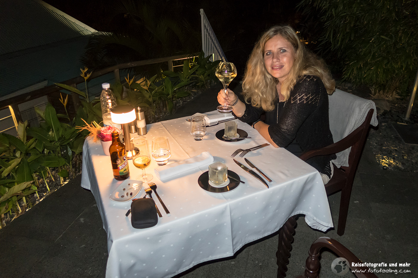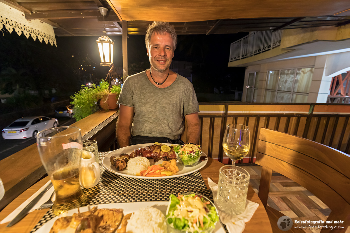 Auch an diesem Abend fuhren wir noch einmal zum Essen. Yves hatte uns ein Restaurant empfohlen, wo man typisch kreolisch essen kann. Abenteuerlich und sehr kurvig ging es hinab ans Meer, wo wir in der Nähe des Restaurants einen der letzten Parkplätze ergatterten.