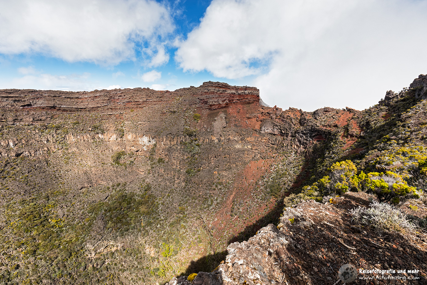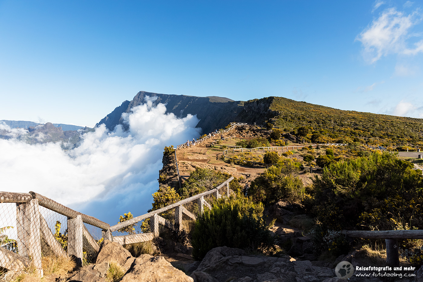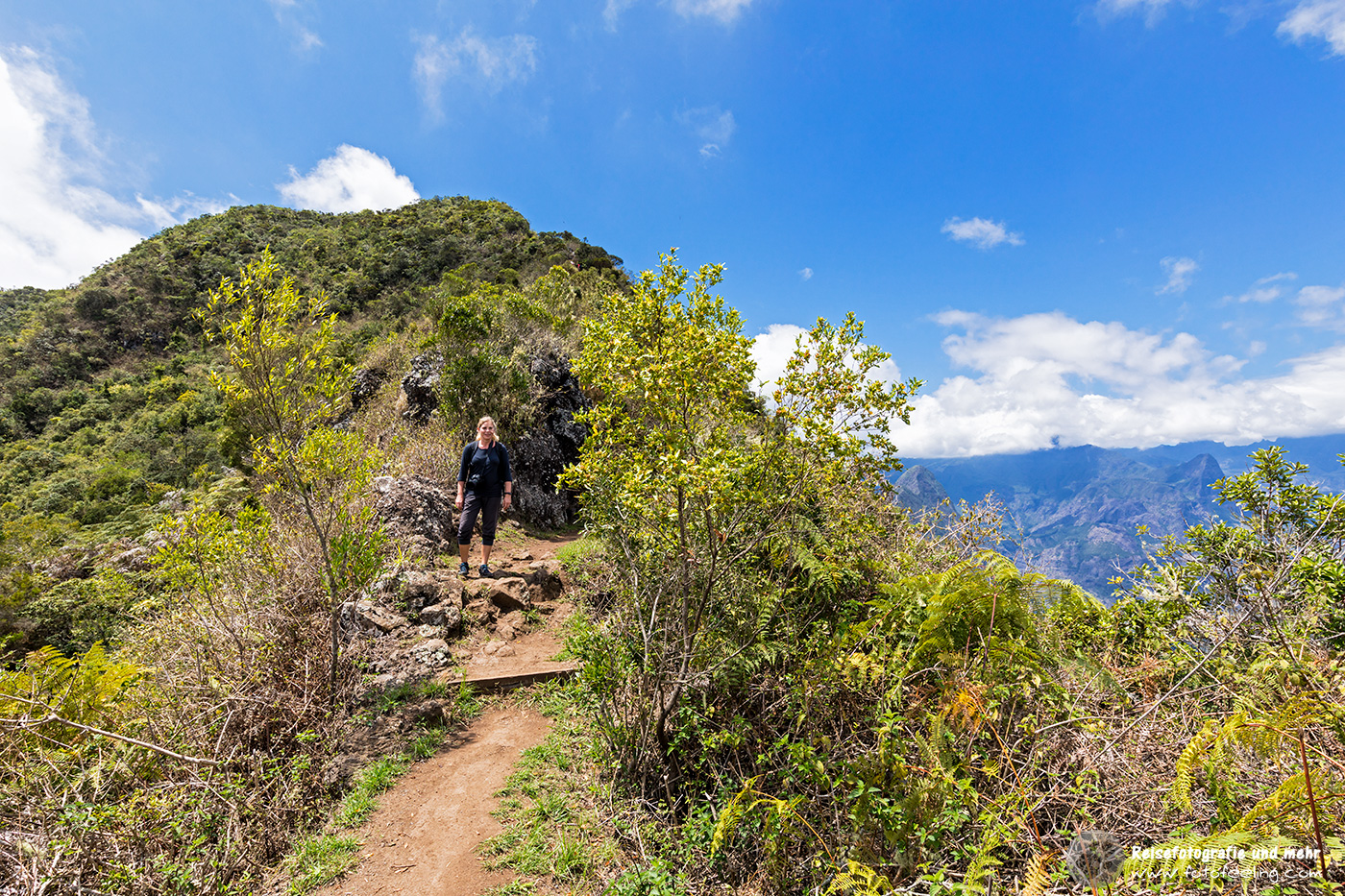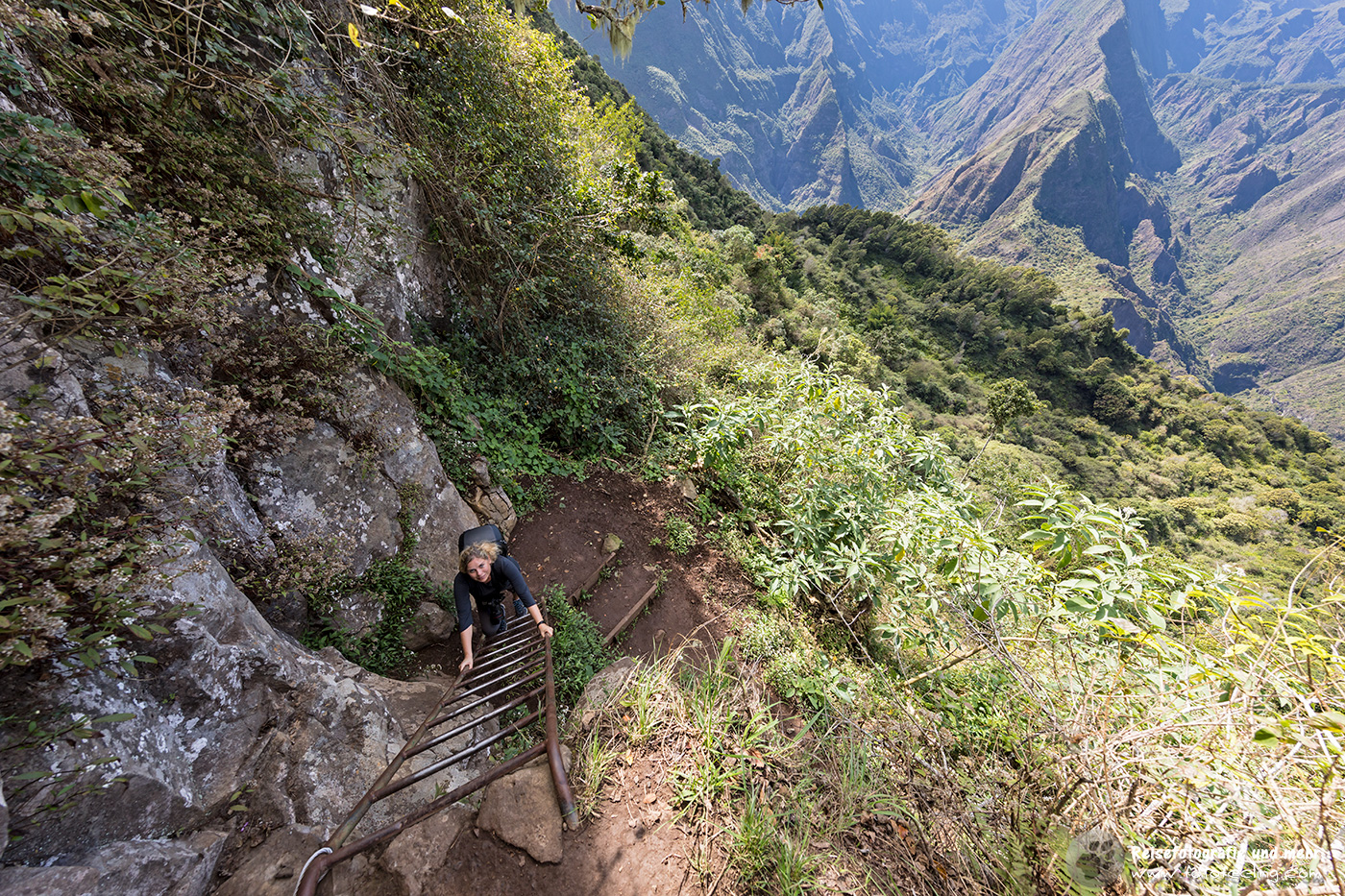Nach dem Pavillon schlängelte sich der Panoramaweg an der Abbruchkante entlang, bis wir den südlichsten Punkt erreicht hatten. Von hier aus ging es wieder bergauf an der Hangkante entlang. An einigen Stellen waren Seilsicherungen angebracht und manche Abschnitte mussten wir über kurze Leitern bewältigen. Aber wir fühlten uns sicher und es machte uns riesigen Spaß, den Hang zu erklimmen. Immer wieder hielten wir inne und bestaunten die fantastische Aussicht. Wir erreichten den Felsen »Roche Verre Bouteille«. Von hier aus könnte man seine Wanderung noch weiter ausdehnen, aber uns reichte es und wir bogen nach links ab. Der Weg führte und noch etwas weiter hinauf auf den Bergrücken. Von hier oben konnten wir eine Rundumaussicht genießen. Auf der einen Seite die tollen Berge und den Cirque de Mafate und auf der anderen Seite Siedlungen und Felder bis zum Meer.
