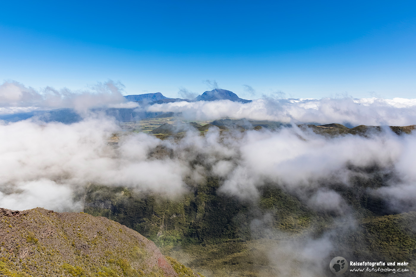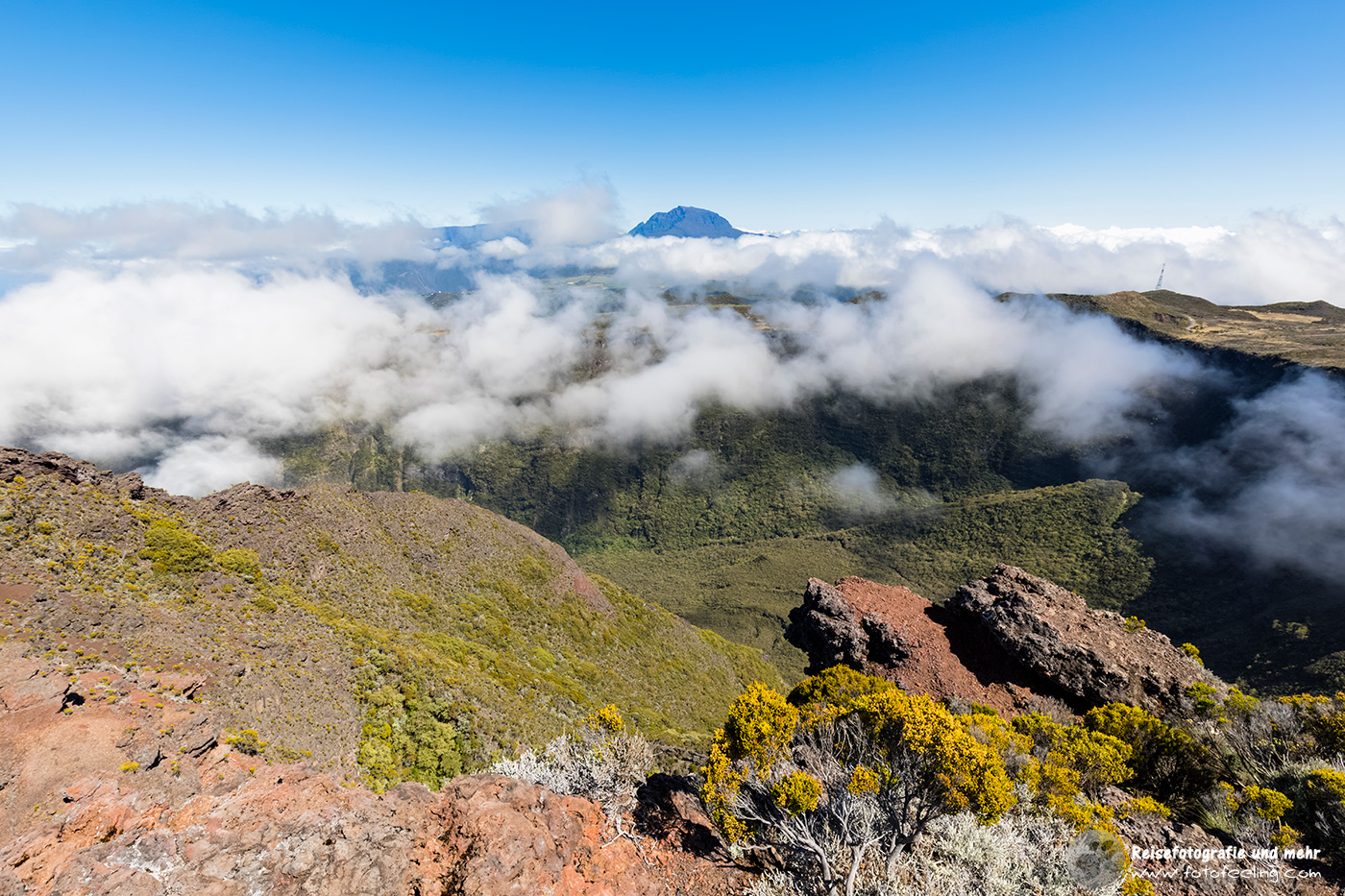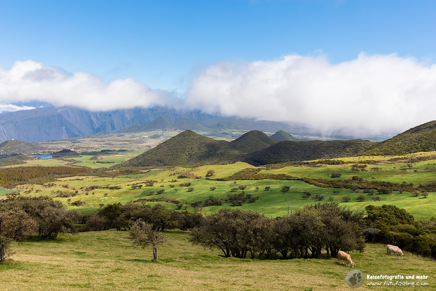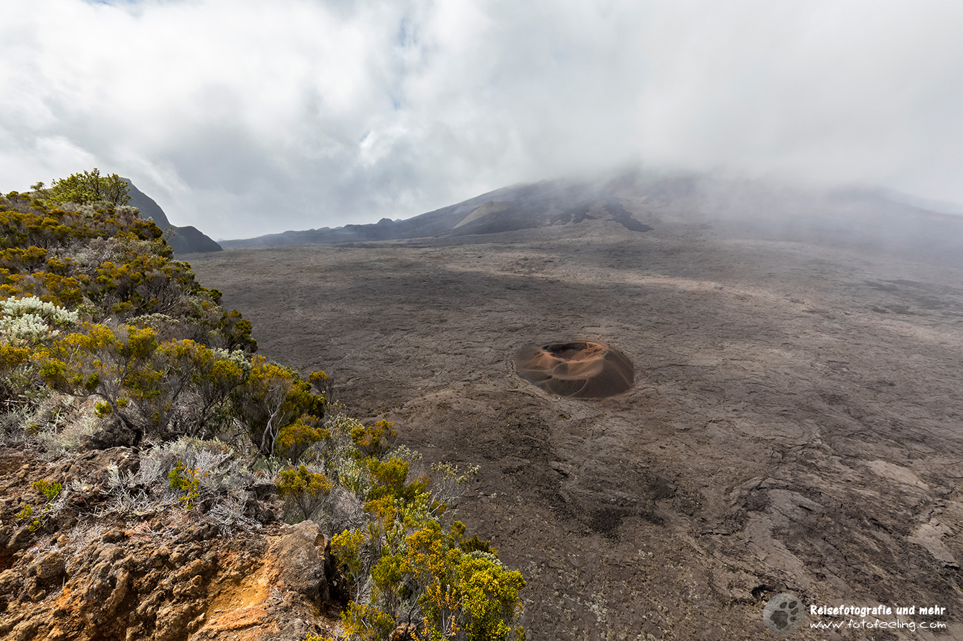Die Fahrt bis zum Vulkan zog sich ewig. Dann irgendwann kamen wir in Plaine des Cafres an, wo die 35 km lange "Route du Volcan" beginnt. Die gute Teerstraße führte uns über Bourg Mourat durch eine grüne und fast alpine Weidelandschaft, während sie sich immer höher schraubte. Den ersten Stopp machten wir am Commerson Crater, der von einem kleinen Parkplatz schnell zu erreichen war. Hier hatten wir einen tollen Einblick in den tiefen Krater, der von unzähligen Wolken umgeben war. Leider zog es immer mehr zu und so hatten wir nur bedingt Aussicht auf die wunderbare Landschaft jenseits des Kraters.