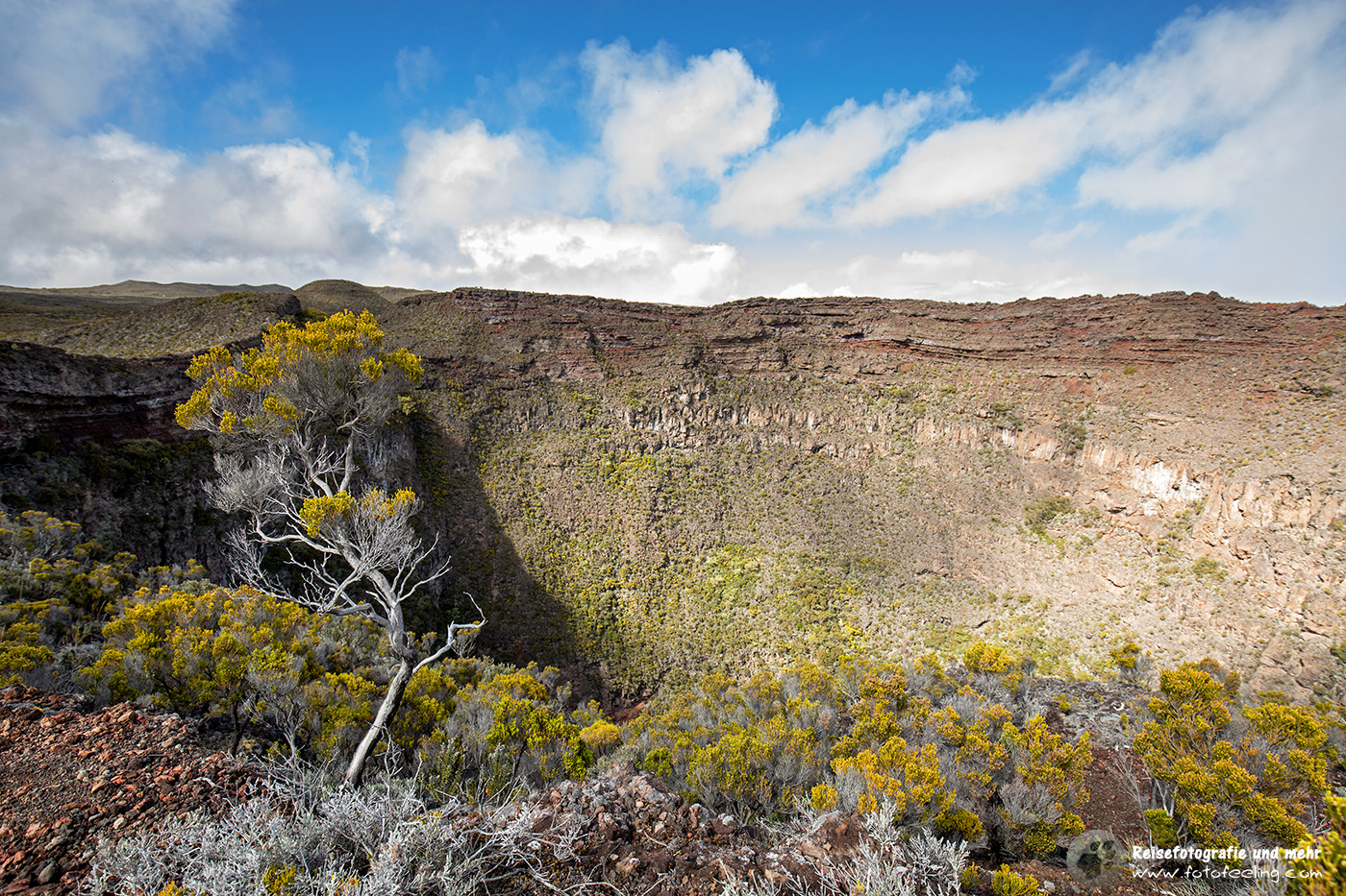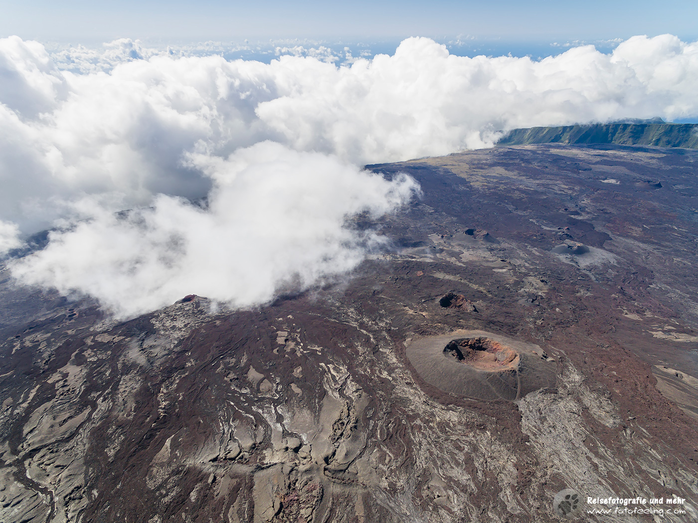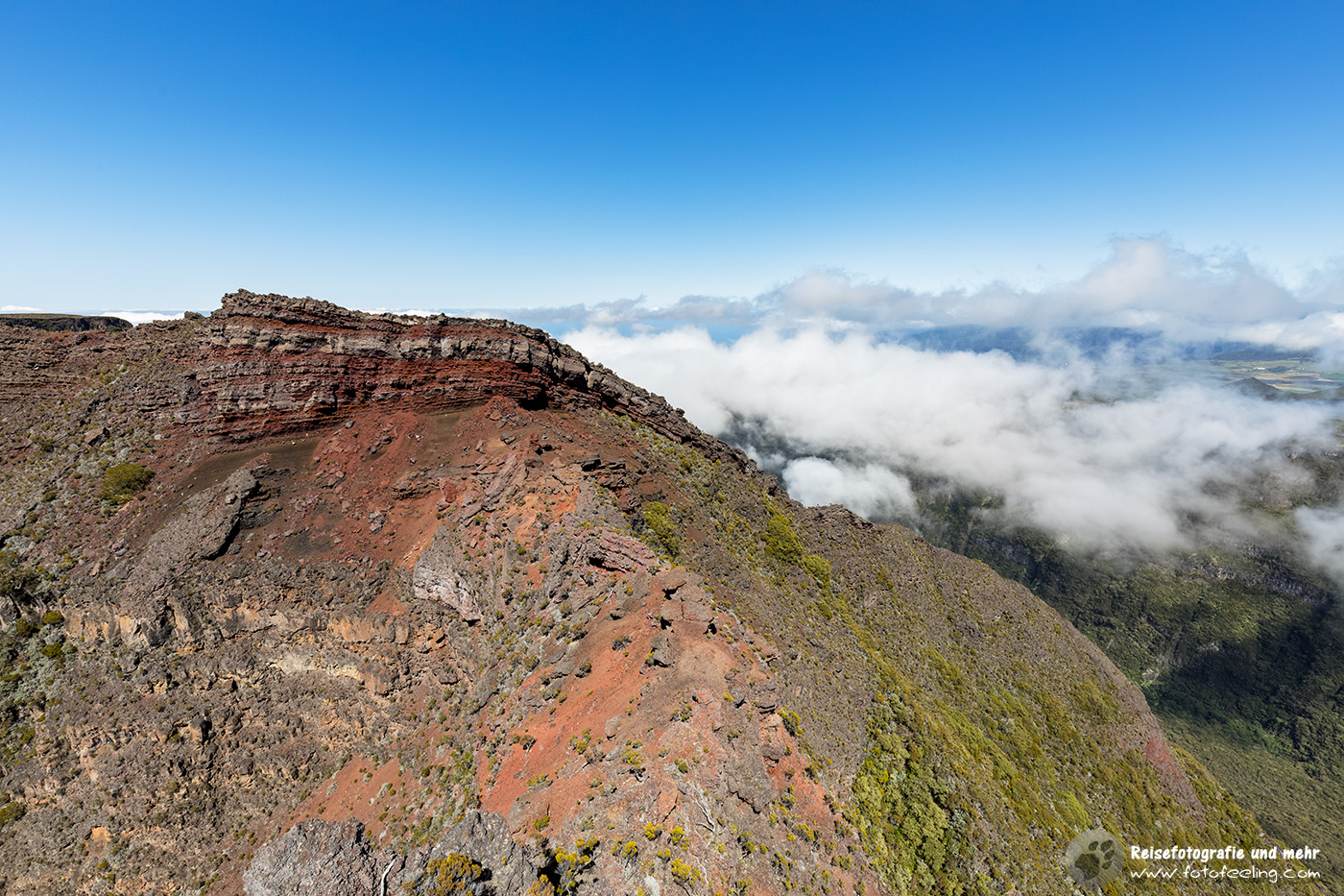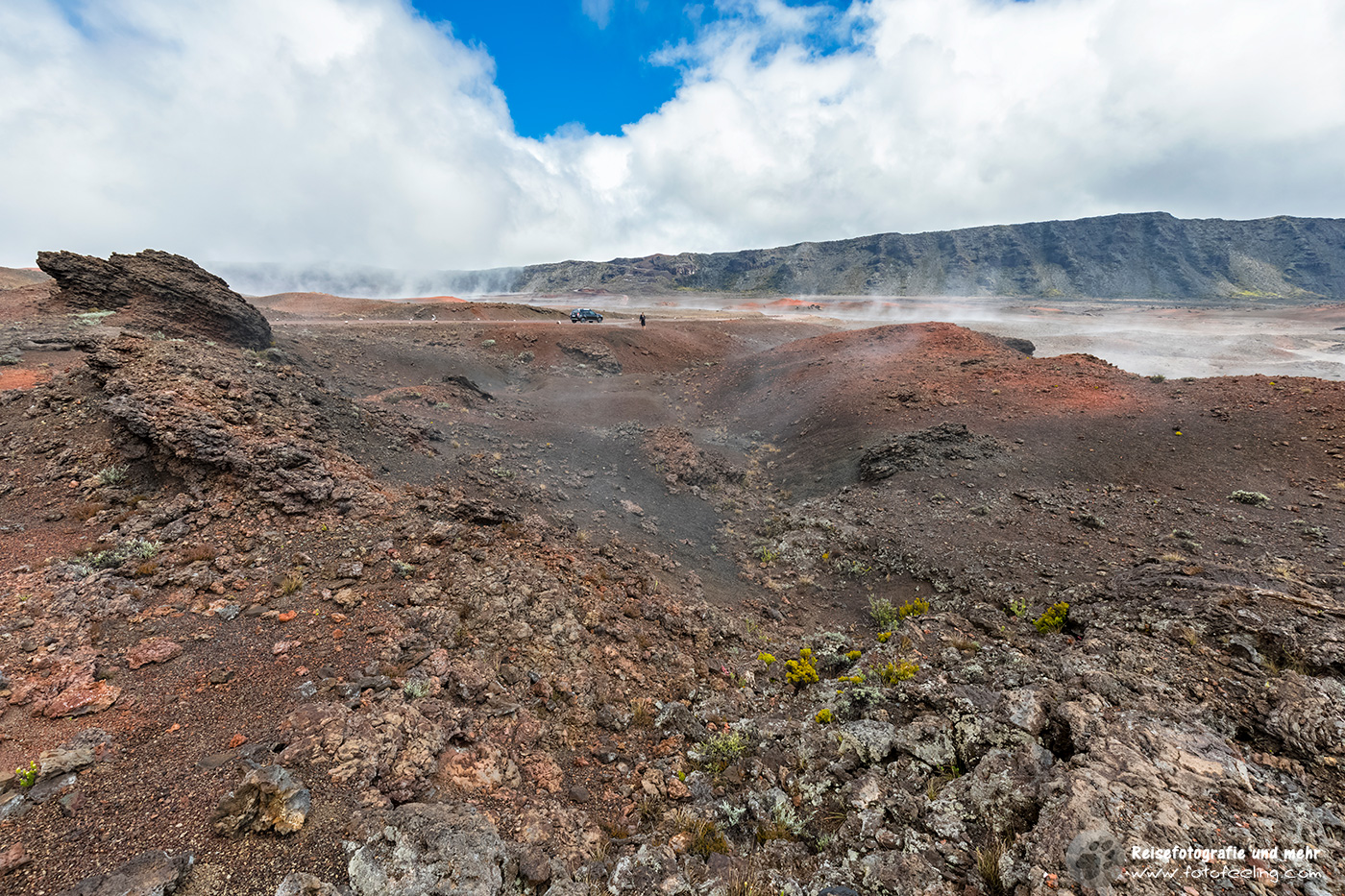 Die Fahrt bis zum Vulkan zog sich ewig. Dann irgendwann kamen wir in Plaine des Cafres an, wo die 35 km lange "Route du Volcan" beginnt. Die gute Teerstraße führte uns über Bourg Mourat durch eine grüne und fast alpine Weidelandschaft, während sie sich immer höher schraubte. Den ersten Stopp machten wir am Commerson Crater, der von einem kleinen Parkplatz schnell zu erreichen war. Hier hatten wir einen tollen Einblick in den tiefen Krater, der von unzähligen Wolken umgeben war. Leider zog es immer mehr zu und so hatten wir nur bedingt Aussicht auf die wunderbare Landschaft jenseits des Kraters.