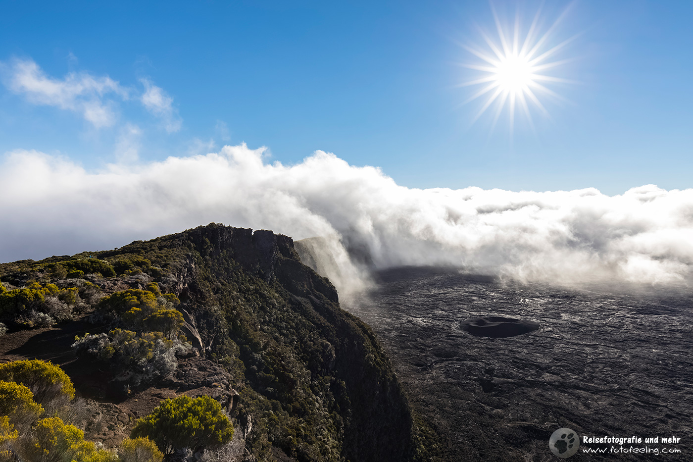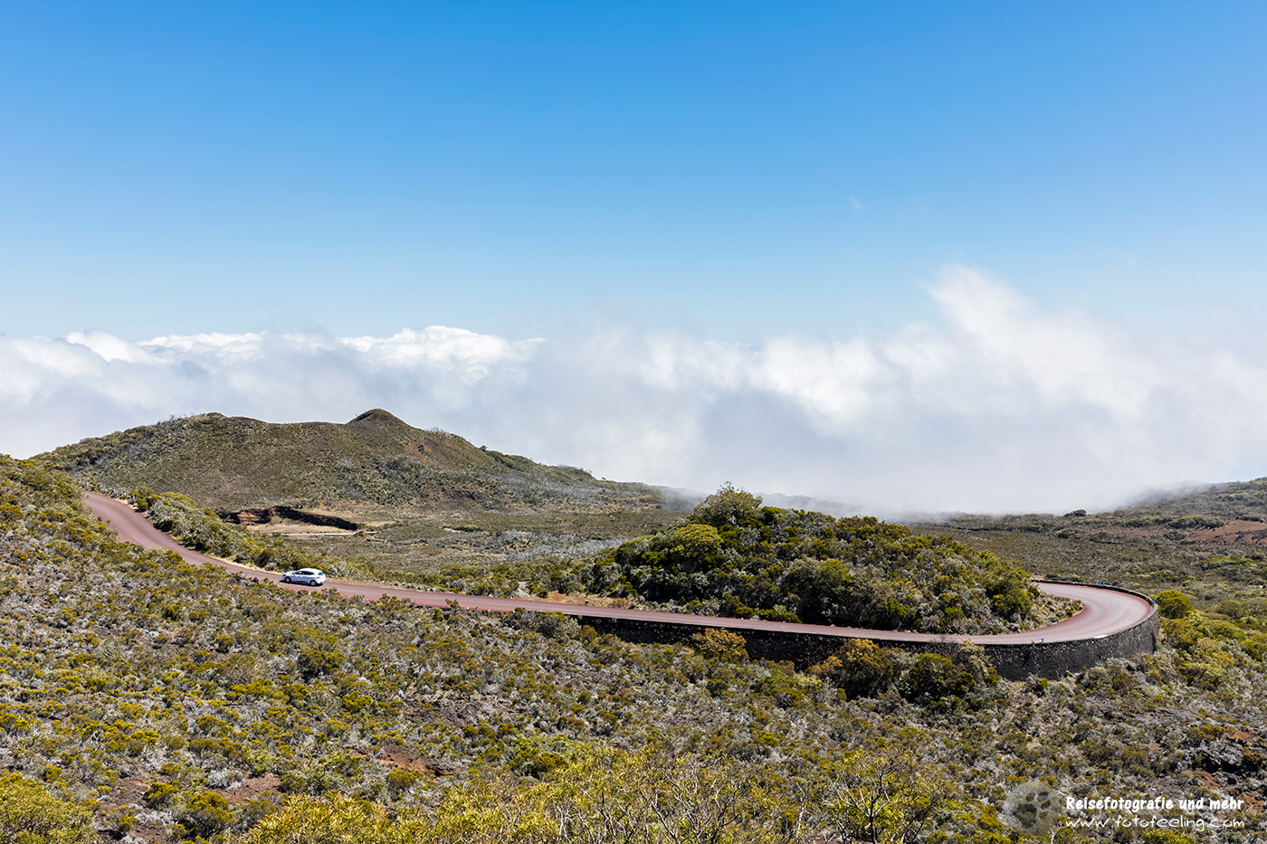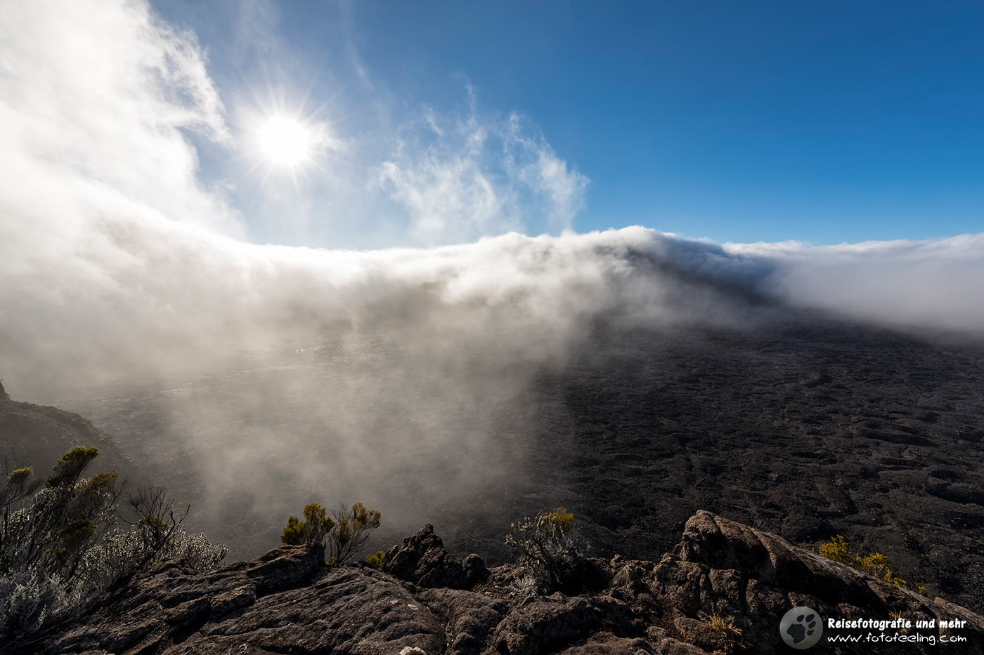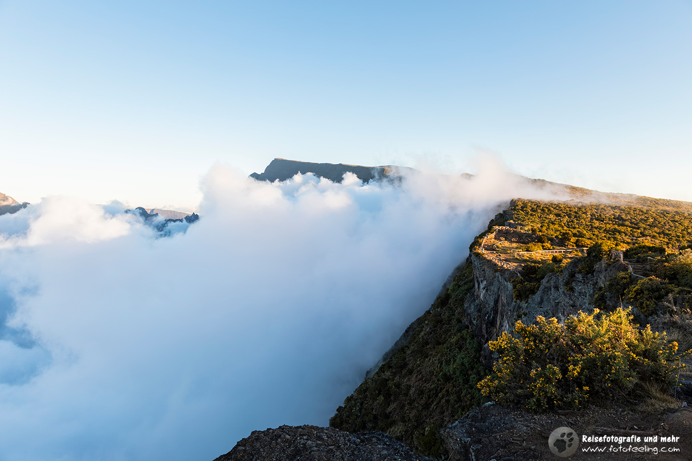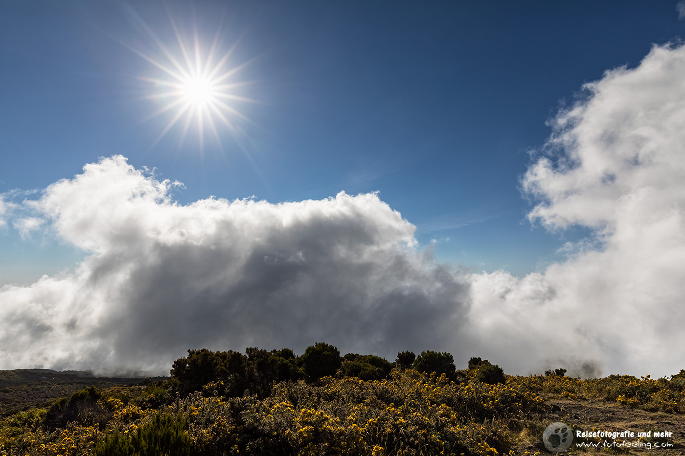 Als wir über die Ebene zum Paso de Sables fuhren, sahen wir dahinter eine Wand aus Wolken. Auch rings um uns herum war alles dicht. Nur hier oben über 2000 m Höhe schien noch die Sonne. Das sah echt cool aus. Den ganzen Weg hinab bis nach La Tampon fuhren wir in dichten Wolken. Erst am Meer wurde es wieder besser.