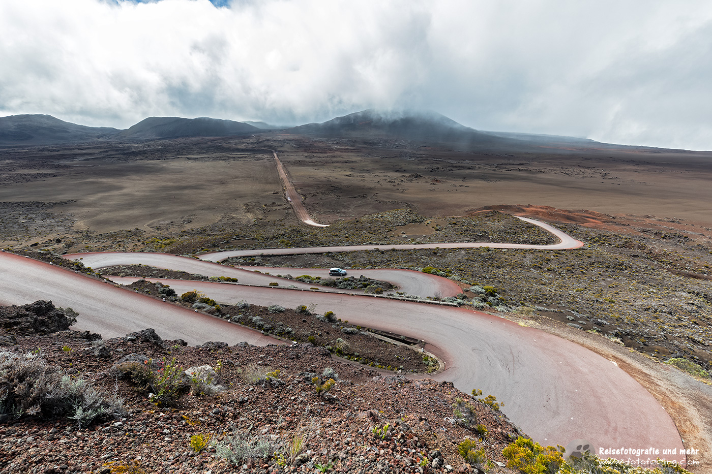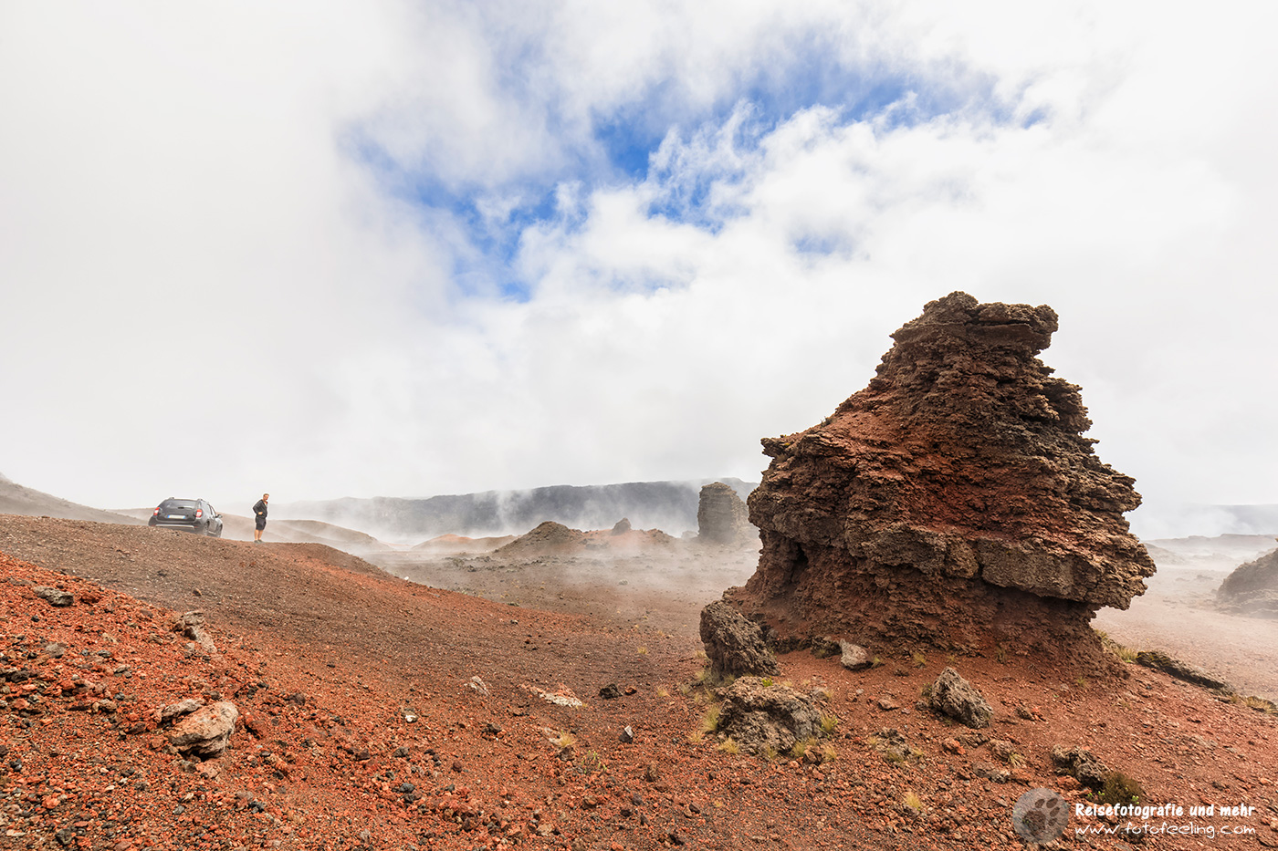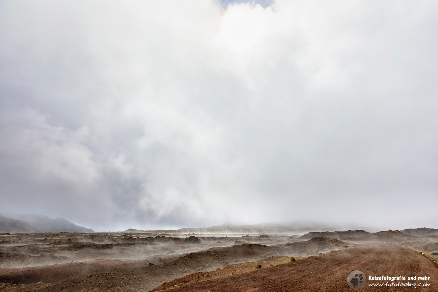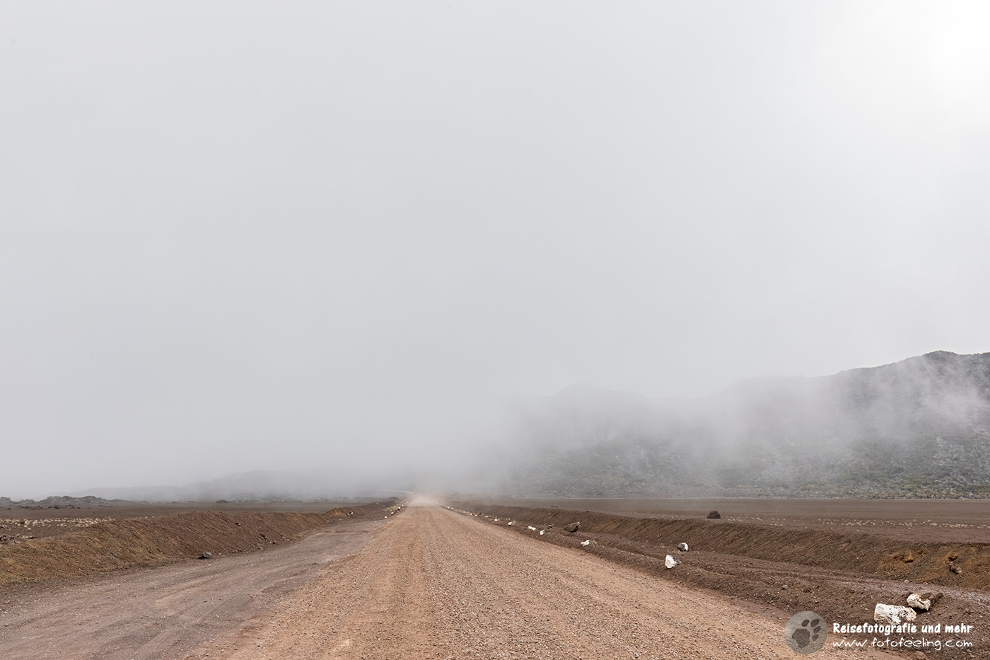 Nach einer ausgiebigen Erkundung fuhren wir weiter, bis wir die einzigartige Vulkanlandschaft der Plaine des Sables der äußeren Caldera erreichten. Was für eine Aussicht!!! In Serpentinen schlängelte sich die Straße in den Krater hinab und ab hier wurde die Straße zur Schotterpiste. Nebelschwaden und tief hängende Wolkenfetzen machten das surreale Bild dieser Landschaft perfekt, in der sich die fetzigsten Lavagebilde tummelten.