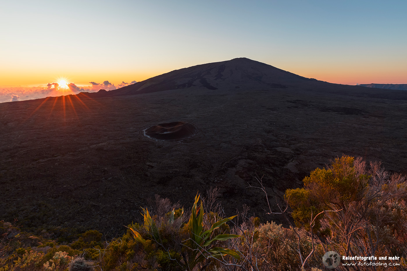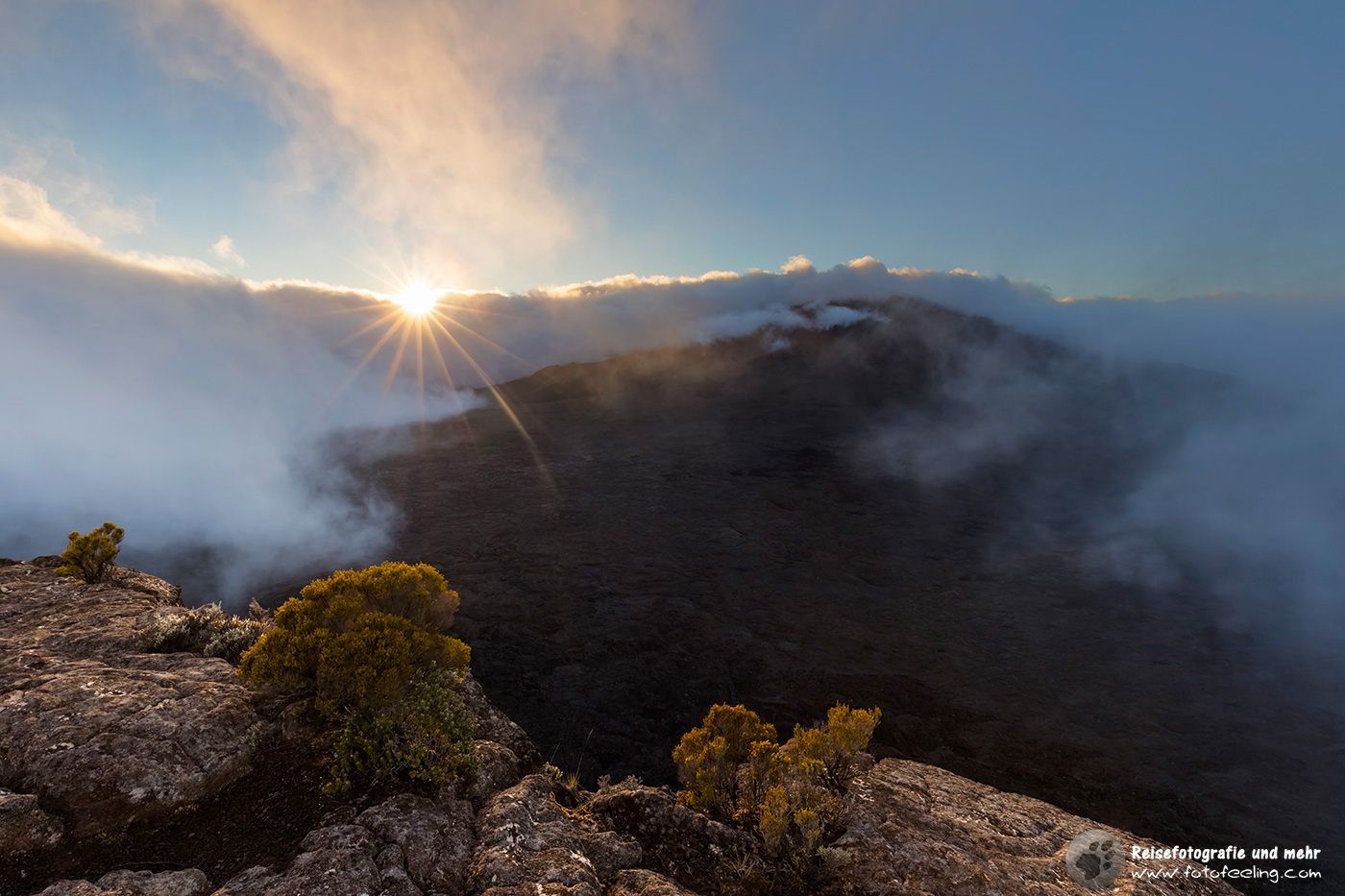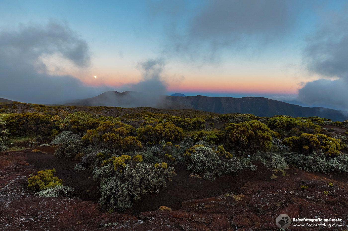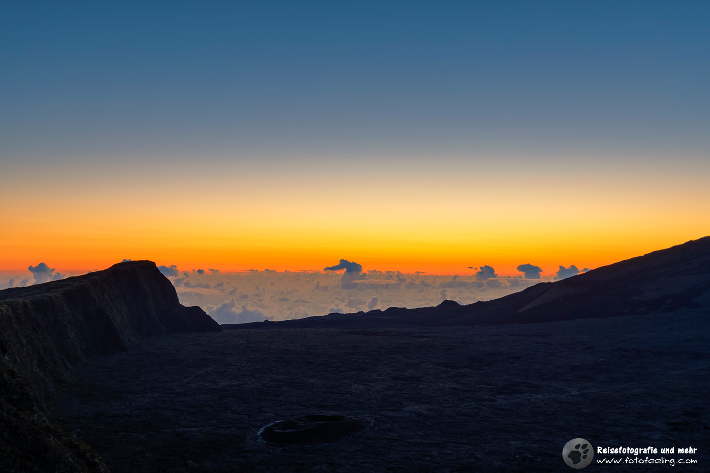 Der Wecker warf uns schon um 3.30 Uhr raus. Chris war extra um 2.00 Uhr aufgestanden und hatte nach dem Wetter geschaut. Es war sternenklar. Damit stand unser Ziel an diesem Tag fest. Wir fuhren anfangs fast alleine durch die Nacht. Der Vollmond beschien das Meer und die Sterne leuchteten über uns am Himmel. Wir fuhren hinab zum Meer und weiter auf der Autobahn zum Vulkan Piton de la Fournaise, den wir heute besteigen wollten. Mit der Dämmerung kamen wir auf dem Parkplatz an. Wieder waren wir nicht die Ersten. Wir schnappten unsere Kameras und wanderten zur Caldera vor. Die Dämmerung leuchtete orange und Wolken türmten sich schon über dem Meer auf, als ob sie auf ein geheimes Startzeichen warten würden, nur um dann mit hoher Geschwindigkeit in den Talkessel zu ziehen. Der Vulkan lag ohne ein Wölkchen vor uns. Wir machten ein paar Bilder von der Dämmerung und liefen dann los. Frost knisterte unter unseren Füßen und es war ziemlich kalt mit 1 C°. Wir wanderten bis zum einzigen Zugang zur inneren Caldera "Enclos Fouqué" vor. Gut 100 Meter ging es hinab in den Kessel durch die schöne Vegetation des Kraterrandes. Unten angekommen liefen wir bis zur Formica Léo, dem farbenfrohen kleinen Vulkankegel. Auch in ihm glitzerte der Frost im ersten Licht.