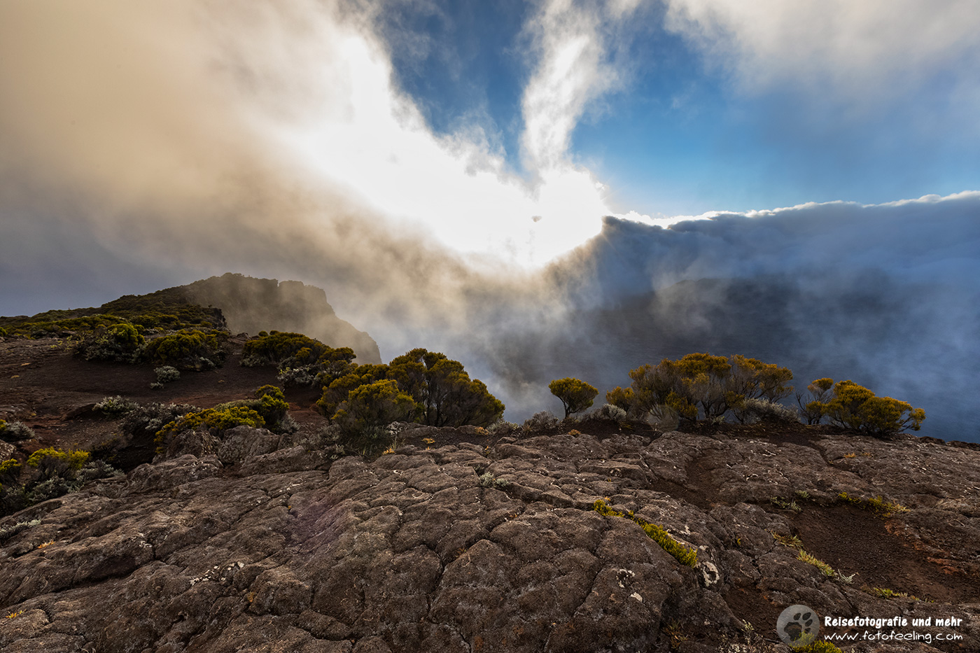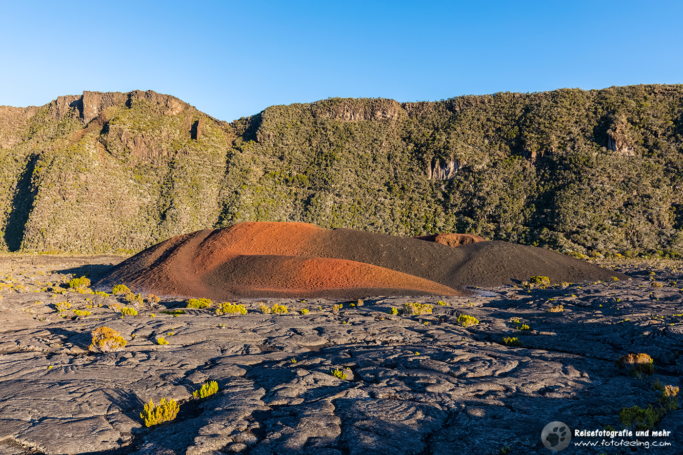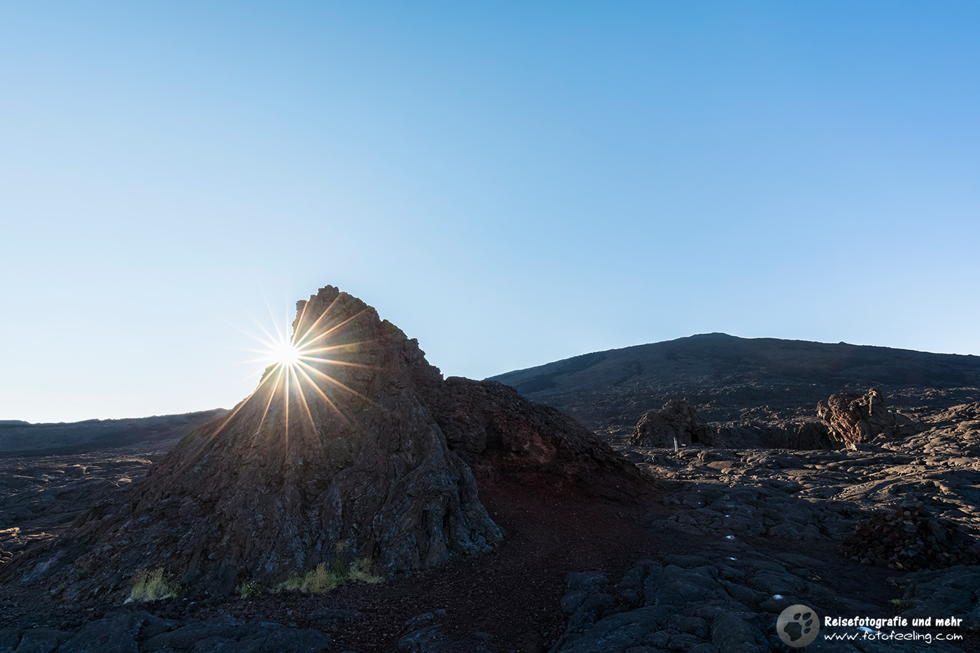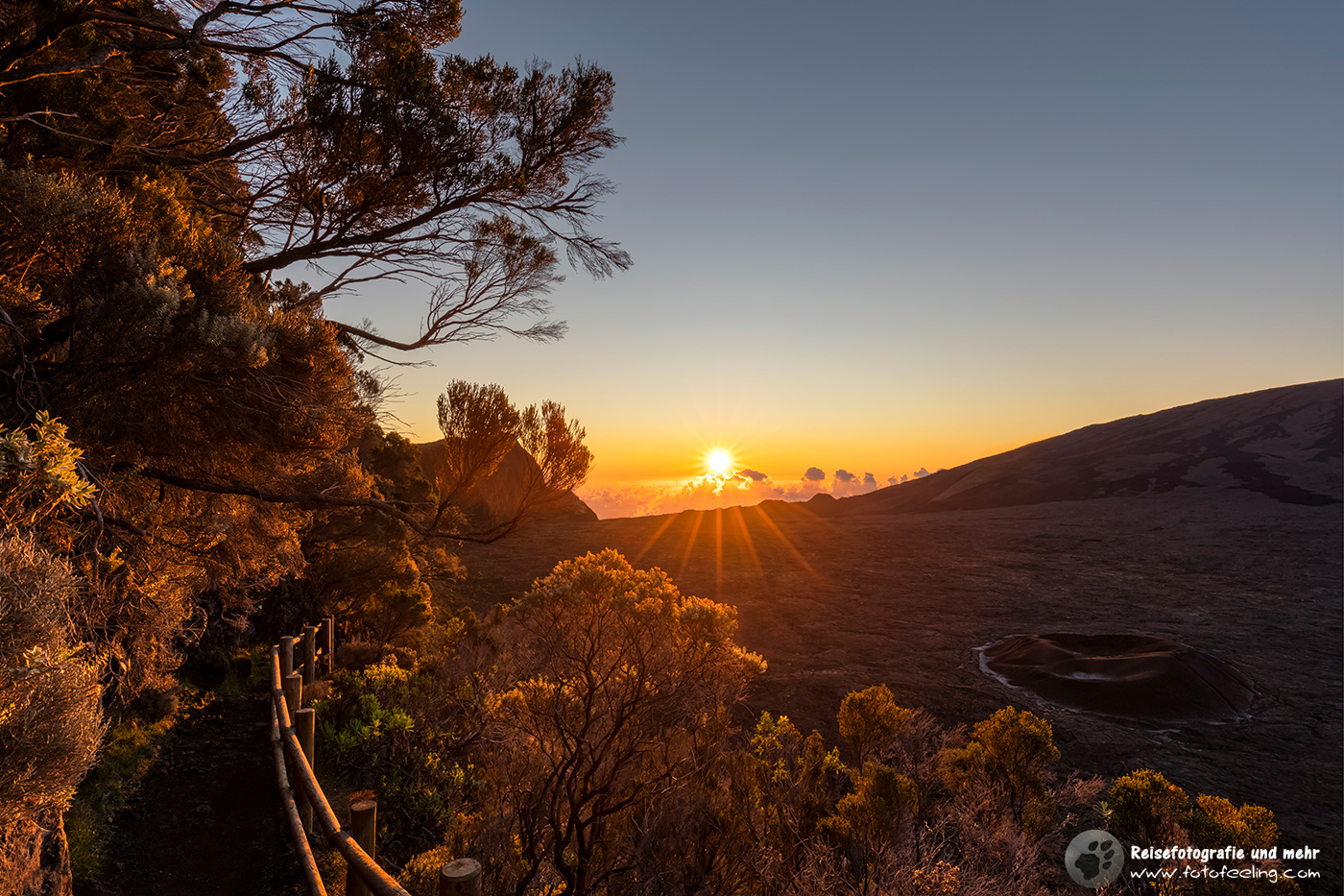Der Wecker warf uns schon um 3.30 Uhr raus. Chris war extra um 2.00 Uhr aufgestanden und hatte nach dem Wetter geschaut. Es war sternenklar. Damit stand unser Ziel an diesem Tag fest. Wir fuhren anfangs fast alleine durch die Nacht. Der Vollmond beschien das Meer und die Sterne leuchteten über uns am Himmel. Wir fuhren hinab zum Meer und weiter auf der Autobahn zum Vulkan Piton de la Fournaise, den wir heute besteigen wollten. Mit der Dämmerung kamen wir auf dem Parkplatz an. Wieder waren wir nicht die Ersten. Wir schnappten unsere Kameras und wanderten zur Caldera vor. Die Dämmerung leuchtete orange und Wolken türmten sich schon über dem Meer auf, als ob sie auf ein geheimes Startzeichen warten würden, nur um dann mit hoher Geschwindigkeit in den Talkessel zu ziehen. Der Vulkan lag ohne ein Wölkchen vor uns. Wir machten ein paar Bilder von der Dämmerung und liefen dann los. Frost knisterte unter unseren Füßen und es war ziemlich kalt mit 1 C°. Wir wanderten bis zum einzigen Zugang zur inneren Caldera "Enclos Fouqué" vor. Gut 100 Meter ging es hinab in den Kessel durch die schöne Vegetation des Kraterrandes. Unten angekommen liefen wir bis zur Formica Léo, dem farbenfrohen kleinen Vulkankegel. Auch in ihm glitzerte der Frost im ersten Licht.