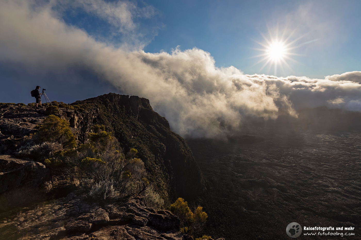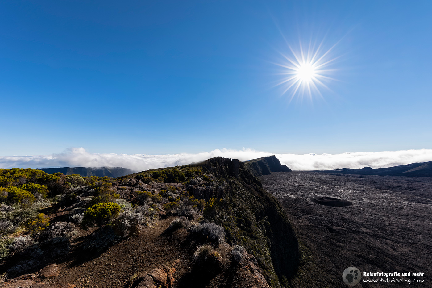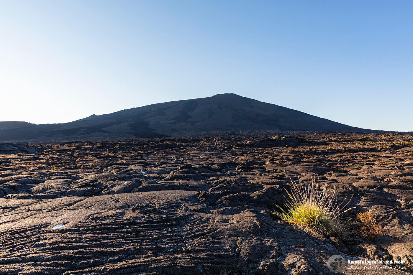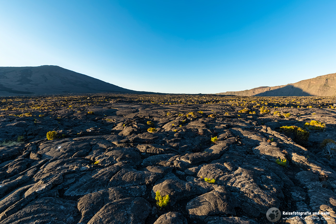 Der Wecker warf uns schon um 3.30 Uhr raus. Chris war extra um 2.00 Uhr aufgestanden und hatte nach dem Wetter geschaut. Es war sternenklar. Damit stand unser Ziel an diesem Tag fest. Wir fuhren anfangs fast alleine durch die Nacht. Der Vollmond beschien das Meer und die Sterne leuchteten über uns am Himmel. Wir fuhren hinab zum Meer und weiter auf der Autobahn zum Vulkan Piton de la Fournaise, den wir heute besteigen wollten. Mit der Dämmerung kamen wir auf dem Parkplatz an. Wieder waren wir nicht die Ersten. Wir schnappten unsere Kameras und wanderten zur Caldera vor. Die Dämmerung leuchtete orange und Wolken türmten sich schon über dem Meer auf, als ob sie auf ein geheimes Startzeichen warten würden, nur um dann mit hoher Geschwindigkeit in den Talkessel zu ziehen. Der Vulkan lag ohne ein Wölkchen vor uns. Wir machten ein paar Bilder von der Dämmerung und liefen dann los. Frost knisterte unter unseren Füßen und es war ziemlich kalt mit 1 C°. Wir wanderten bis zum einzigen Zugang zur inneren Caldera "Enclos Fouqué" vor. Gut 100 Meter ging es hinab in den Kessel durch die schöne Vegetation des Kraterrandes. Unten angekommen liefen wir bis zur Formica Léo, dem farbenfrohen kleinen Vulkankegel. Auch in ihm glitzerte der Frost im ersten Licht.