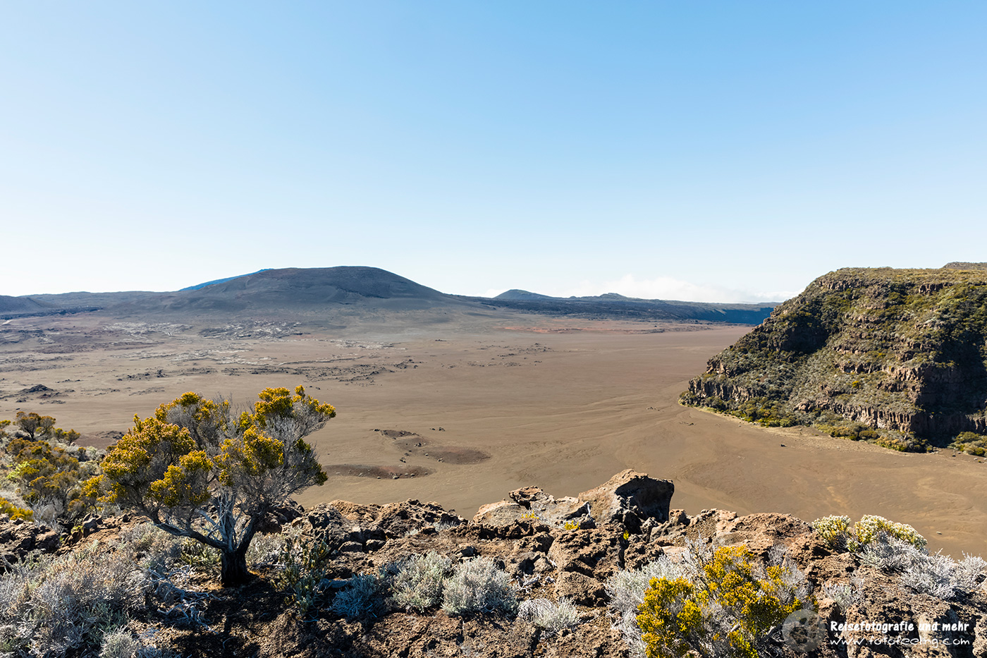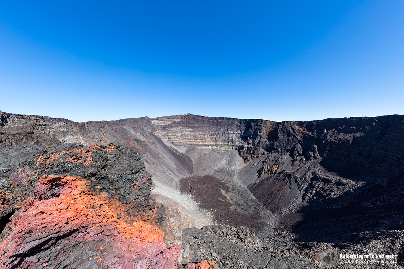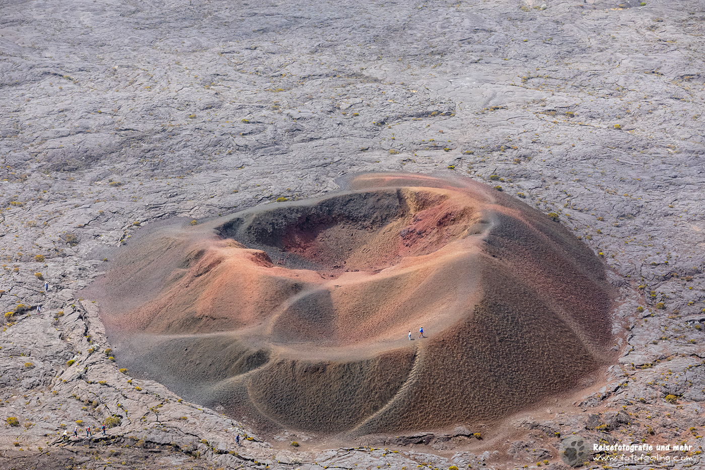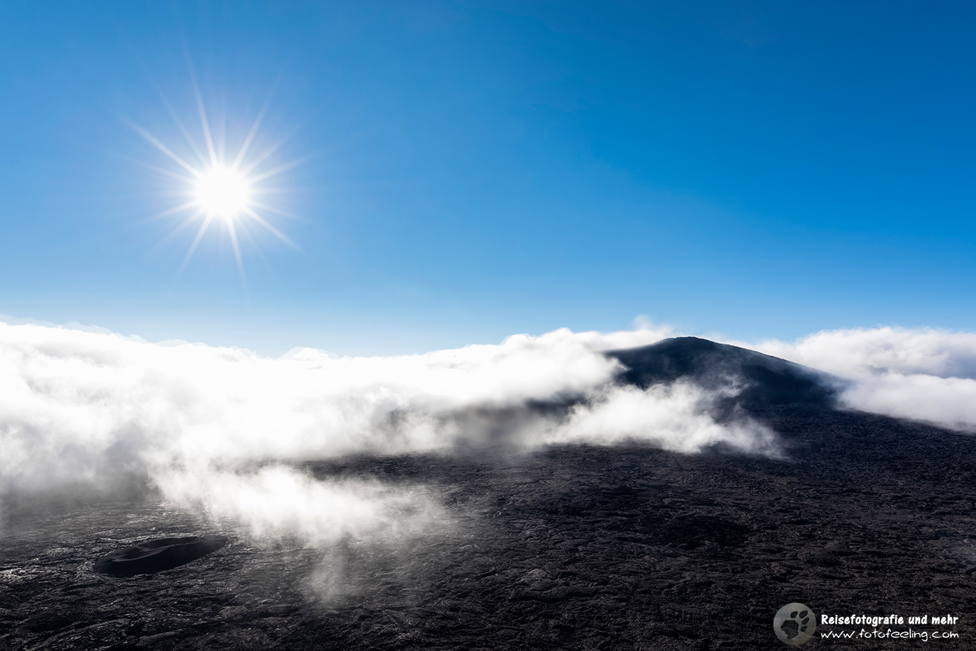 Der Wecker warf uns schon um 3.30 Uhr raus. Chris war extra um 2.00 Uhr aufgestanden und hatte nach dem Wetter geschaut. Es war sternenklar. Damit stand unser Ziel an diesem Tag fest. Wir fuhren anfangs fast alleine durch die Nacht. Der Vollmond beschien das Meer und die Sterne leuchteten über uns am Himmel. Wir fuhren hinab zum Meer und weiter auf der Autobahn zum Vulkan Piton de la Fournaise, den wir heute besteigen wollten. Mit der Dämmerung kamen wir auf dem Parkplatz an. Wieder waren wir nicht die Ersten. Wir schnappten unsere Kameras und wanderten zur Caldera vor. Die Dämmerung leuchtete orange und Wolken türmten sich schon über dem Meer auf, als ob sie auf ein geheimes Startzeichen warten würden, nur um dann mit hoher Geschwindigkeit in den Talkessel zu ziehen. Der Vulkan lag ohne ein Wölkchen vor uns. Wir machten ein paar Bilder von der Dämmerung und liefen dann los. Frost knisterte unter unseren Füßen und es war ziemlich kalt mit 1 C°. Wir wanderten bis zum einzigen Zugang zur inneren Caldera "Enclos Fouqué" vor. Gut 100 Meter ging es hinab in den Kessel durch die schöne Vegetation des Kraterrandes. Unten angekommen liefen wir bis zur Formica Léo, dem farbenfrohen kleinen Vulkankegel. Auch in ihm glitzerte der Frost im ersten Licht.