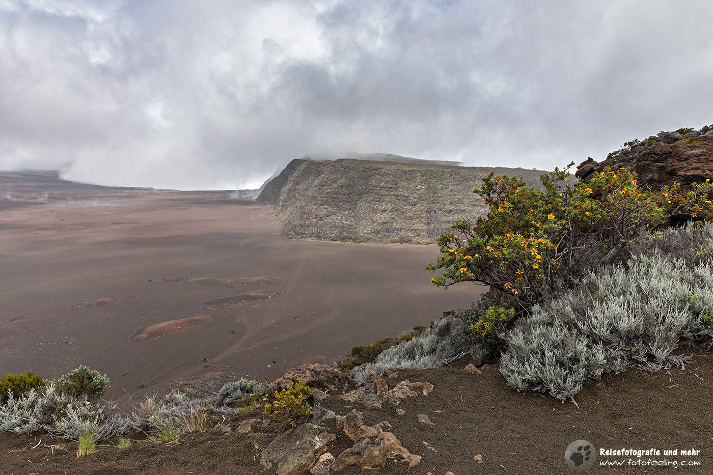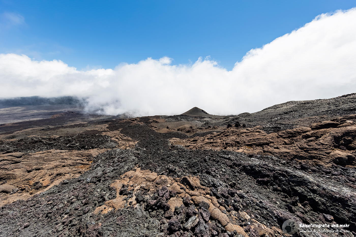 Wir folgten der Straße bis zu ihrem Ende dem Parkplatz "Pas de Bellecombe" direkt am Kraterrand. Hier stellten wir unser Auto ab und wanderten vorbei an dem kleinen Kiosk zu der Aussichtsplattform, von der aus man einen tollen Blick über die innere Caldera hat. Doch auch hier tummelten sich schon etliche Wolken und zogen über den Rand hinein in die innere Caldera. Doch an diesem Tag wollten wir nicht hinab steigen, sondern uns nur ein Bild vom Vulkan und dem Gelände machen. So wanderten wir am Kraterrand entlang und genossen die Aussicht auf den Formica Léo auch Ameisenlöwe genannt, denn sein Kegel sieht wie ein Trichter des Ameisenlöwen im Sand aus. Wir liefen am einzigen Zugang zur inneren Caldera "Enclos Fouqué" vorbei und genossen die Einblicke in den Krater. Doch die Wolken wurden immer dichter und leichter Nieselregen setzte ein. Um 11.00 Uhr war fast gar nichts mehr zu erkennen und wir gingen zu unserem Auto zurück. Hoffentlich wird das Wetter noch einmal so gut, dass wir uns die Vulkangipfel aus der Nähe anschauen können, denn leider sah die Wettervorhersage für die nächste Woche nicht allzu gut aus.