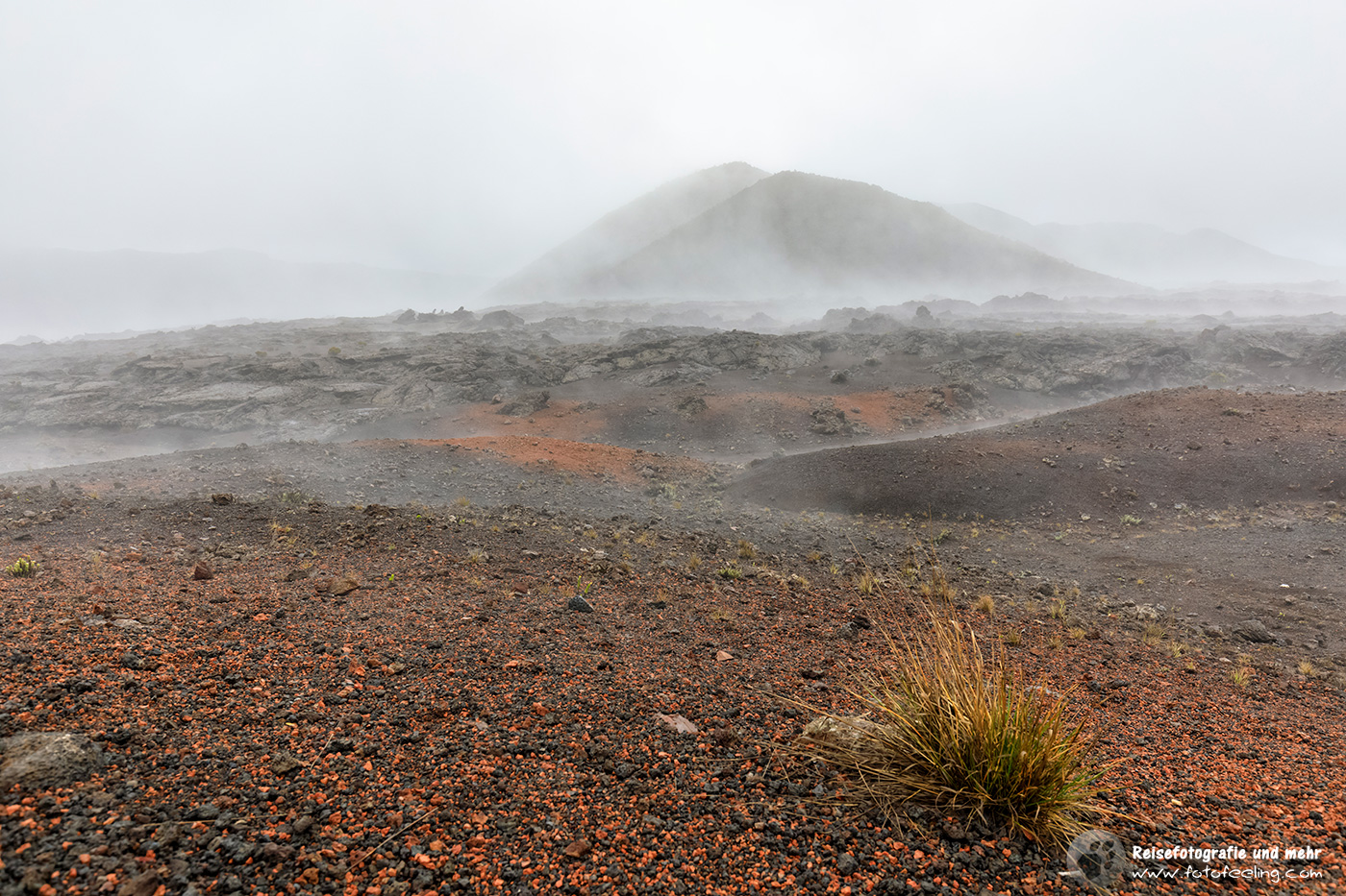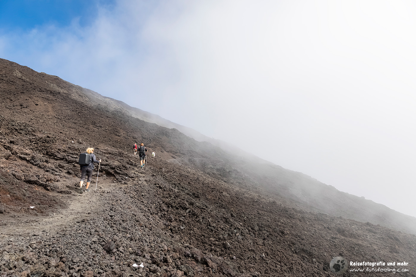 Der Rückweg war jedoch sehr beschwerlich, denn wir mussten ja den gleichen Weg zurück. Erst zum Teil steil bergab über unebene Lava, dann sehr lange über die innere Caldera bis zum letzten Aufstieg bei der Formica Leo. Hinzu kam, dass immer noch mehr Menschen rauf als runter gingen und man sich ausweichen musste. Stellenweise war es etwas neblig, da die Wolken schon einen Teil des Weges erobert hatten. Erschwerend kam hinzu, dass Chris total erkältet und bedingt durch den Fotorucksack und das schwere Stativ völlig durchgeschwitzt war. Aber helfen wollte er sich von mir auch nicht lassen. Doch auch den letzten Gegenanstieg zum oberen Kraterrand des "Enclos Fouqué" von ca. 100 Metern schafften wir und gingen zufrieden zum Parkplatz vor. Was für ein Tag und was für ein Erlebnis!