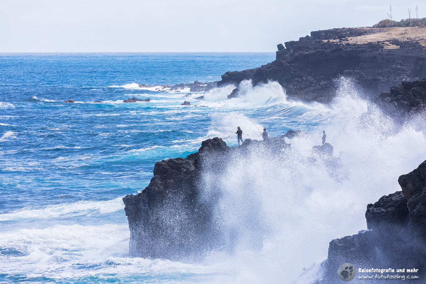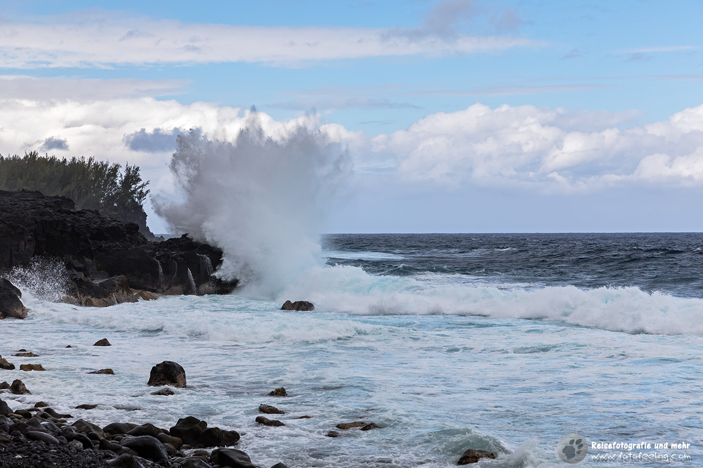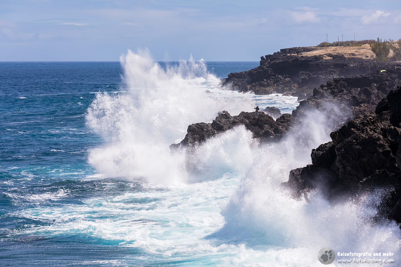 Frohen Mutes kämpften wir uns durch die Wolken, hoch und immer höher ging es in zahlreichen Kurven. Hatten wir anfangs noch für ca. 90 Kilometer Sprit im Tank, konnten wir nun zuschauen, wie er mit jeder Kurve und jedem Meter weniger wurde. So fiel er von 90 Kilometer Reichweite spontan auf 30 Kilometer, um gleich darauf in Reserve überzugehen. Das konnte doch nicht wahr sein!!! So brachen wir auch hier ab und suchten nach einer Tankstelle. Was hier oben in den Bergen leider gar nicht einfach war, denn unser Navi wollte uns immer runter auf die Ringstraße leiten. Doch wir wussten nicht, ob wir das schaffen würden. Nun ja, es ging ja zum Glück bergab. Die ganze Strecke saßen wir zwar wie auf Kohlen, denn auf den kurvenreichen, engen Straßen möchte niemand liegen bleiben. Doch wir hatten Glück und erreichten die Tankstelle mit dem letzten Tropfen Benzin. Dort befüllten wir unser Auto und hatten nun keine Lust mehr auf ein weiteres Abenteuer, denn mittlerweile war es mittags und ab Mittag soll der Maido immer in den Wolken sein. Wahrscheinlich hätten wir an diesem Tag eh kein Glück gehabt – jedenfalls trösteten wir uns mit diesem Gedanken und fuhren einfach hinab ans Meer. Hier war das schönste Wetter und wir erkundeten die Strände um Saint Leu herum. Dank starkem Wind waren die Wellen meterhoch und prallten ungebremst auf die Küste. Was für ein Anblick. Wir entdeckten an einem Aussichtspunkt ein Blow Hole, wo das Wasser meterhoch und mit lautem Getöse durch eine Öffnung in den Felsen gedrückt wurde, so dass es fast wie ein Geysir wirkte. Doch fast genauso faszinierend wie das Blow Hole, waren die Fischer an der Steilküste, die auf den Klippen standen und den Wellen und der Gischt trotzten. Manchmal, wenn die Welle besonders hoch war und mit voller Wucht auf die Klippen traf, sah man keinen Menschen mehr sondern nur noch Wasser. Das sah wirklich atemberaubend aus und wir hofften, dass die Männer wussten was sie taten und es von unserer Perspektive gefährlicher aussah als es war.