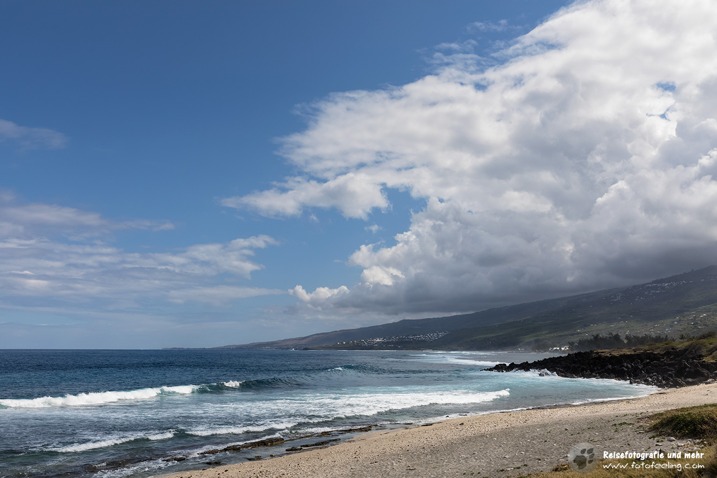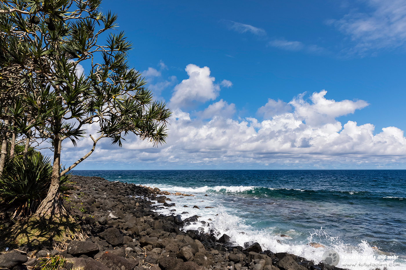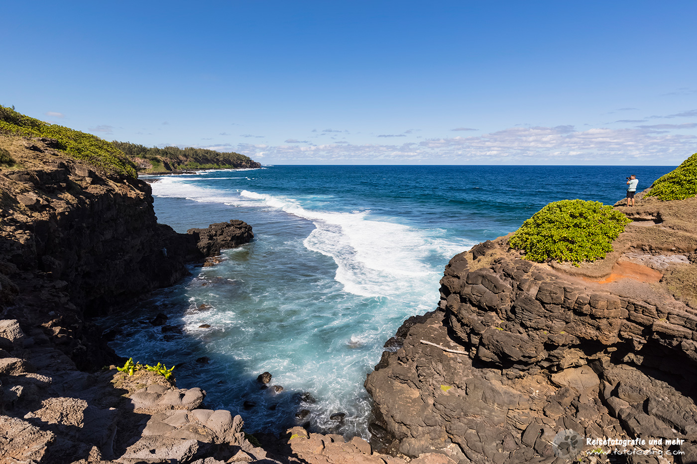 Frohen Mutes kämpften wir uns durch die Wolken, hoch und immer höher ging es in zahlreichen Kurven. Hatten wir anfangs noch für ca. 90 Kilometer Sprit im Tank, konnten wir nun zuschauen, wie er mit jeder Kurve und jedem Meter weniger wurde. So fiel er von 90 Kilometer Reichweite spontan auf 30 Kilometer, um gleich darauf in Reserve überzugehen. Das konnte doch nicht wahr sein!!! So brachen wir auch hier ab und suchten nach einer Tankstelle. Was hier oben in den Bergen leider gar nicht einfach war, denn unser Navi wollte uns immer runter auf die Ringstraße leiten. Doch wir wussten nicht, ob wir das schaffen würden. Nun ja, es ging ja zum Glück bergab. Die ganze Strecke saßen wir zwar wie auf Kohlen, denn auf den kurvenreichen, engen Straßen möchte niemand liegen bleiben. Doch wir hatten Glück und erreichten die Tankstelle mit dem letzten Tropfen Benzin. Dort befüllten wir unser Auto und hatten nun keine Lust mehr auf ein weiteres Abenteuer, denn mittlerweile war es mittags und ab Mittag soll der Maido immer in den Wolken sein. Wahrscheinlich hätten wir an diesem Tag eh kein Glück gehabt – jedenfalls trösteten wir uns mit diesem Gedanken und fuhren einfach hinab ans Meer. Hier war das schönste Wetter und wir erkundeten die Strände um Saint Leu herum. Dank starkem Wind waren die Wellen meterhoch und prallten ungebremst auf die Küste. Was für ein Anblick. Wir entdeckten an einem Aussichtspunkt ein Blow Hole, wo das Wasser meterhoch und mit lautem Getöse durch eine Öffnung in den Felsen gedrückt wurde, so dass es fast wie ein Geysir wirkte. Doch fast genauso faszinierend wie das Blow Hole, waren die Fischer an der Steilküste, die auf den Klippen standen und den Wellen und der Gischt trotzten. Manchmal, wenn die Welle besonders hoch war und mit voller Wucht auf die Klippen traf, sah man keinen Menschen mehr sondern nur noch Wasser. Das sah wirklich atemberaubend aus und wir hofften, dass die Männer wussten was sie taten und es von unserer Perspektive gefährlicher aussah als es war.