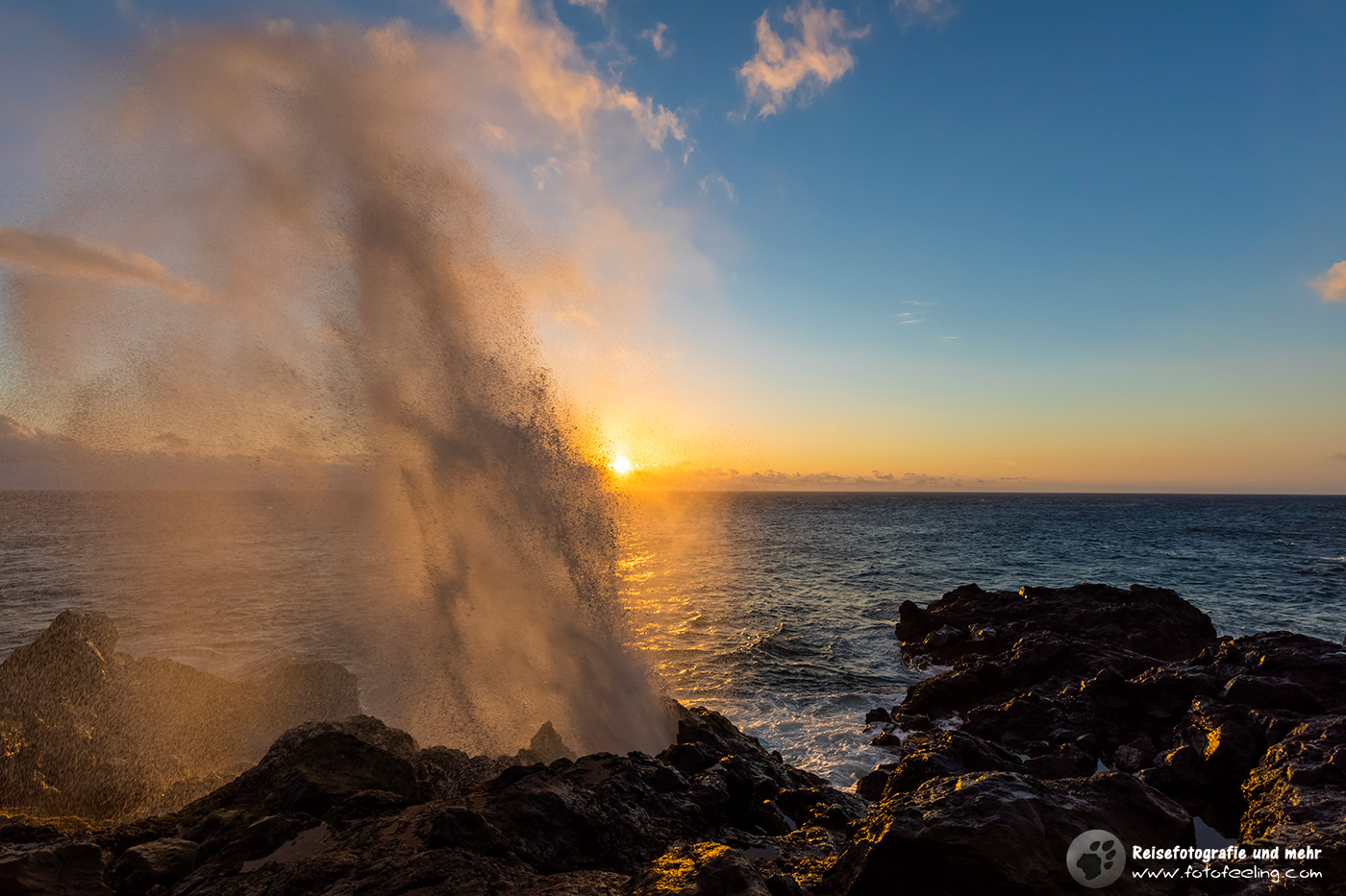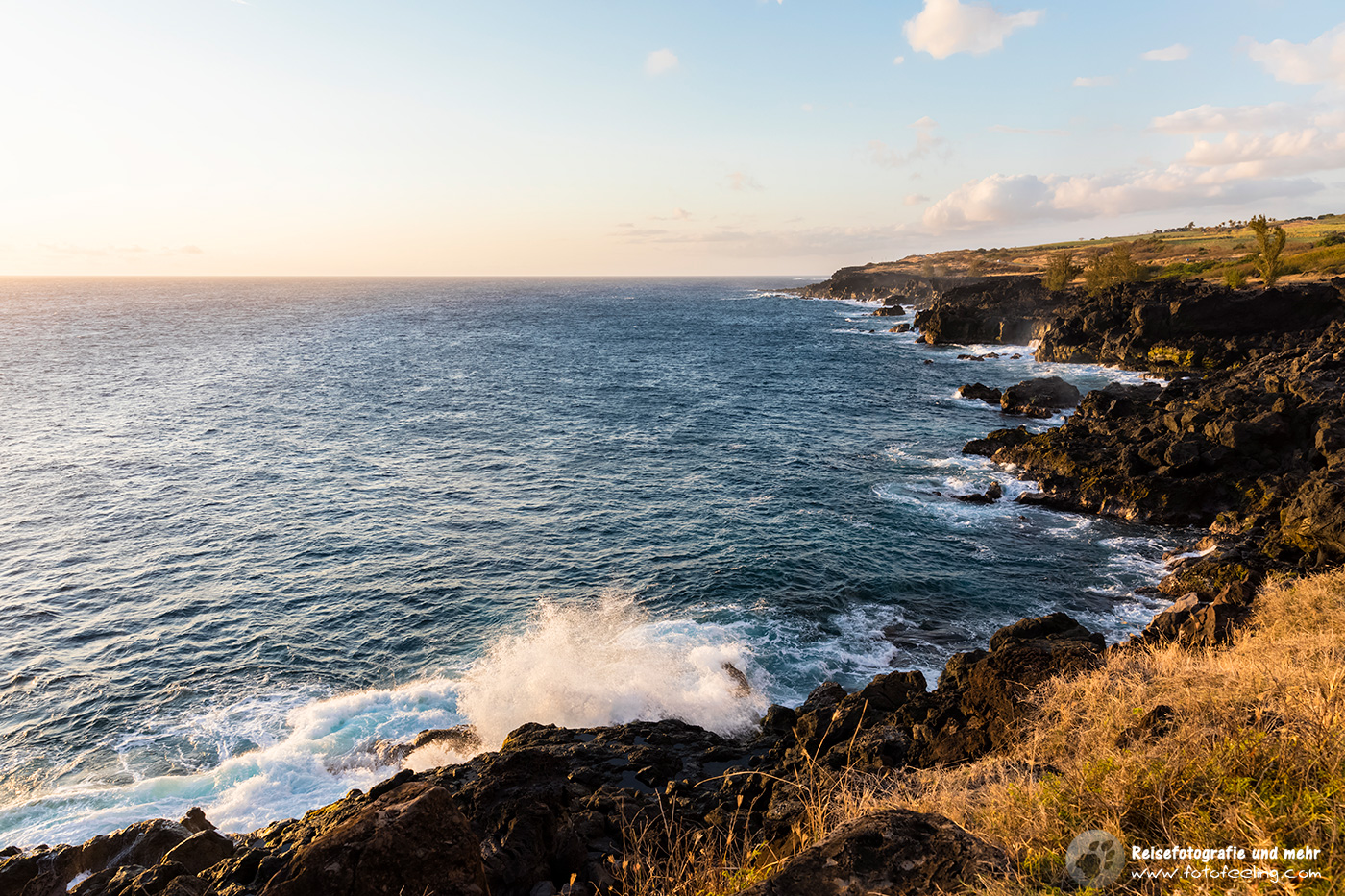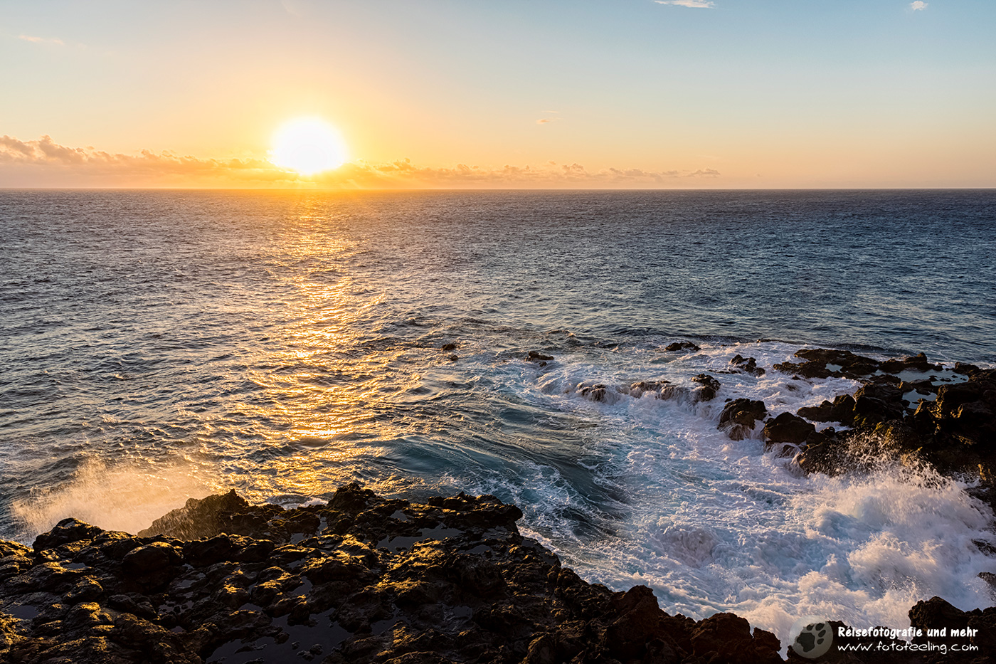 Dann wurde es aber Zeit, denn wir wollten den Sonnenuntergang am Strand von Saint-Leu verbringen. Gerade noch rechtzeitig kamen wir am Blowhole etwas außerhalb von Saint-Leu an. Chris lief zum Blowhole, aus dem auch an diesem Tag meterhoch die Gischt aufstieg und ich ging nach links an der rauen Küste entlang, um ein paar andere Aufnahmen zu machen. An einigen Stellen krachten die Wellen voller Kraft meterhoch an die Küste, aber leider war es zu weit entfernt, als dass ich es noch schaffen könnte, denn die Sonne war nur noch wenig vom Horizont entfernt. Darum setzte ich mich an einer kleinen Bucht auf die Felsen und beobachtete die Wellen, die kraftvoll gegen die steinige Küste schlugen, während die Sonne unaufhaltsam dem Horizont entgegen sank. Weiter vorne sah ich immer wieder die Gischt aus dem Loch hochspritzen. Die Wellen leuchteten schon richtig orange im Gegenlicht. Aus einem Mini Blow Hole zischte es gewaltig und Mini-Fontänen schossen in die Höhe. Viel zu schnell verschwand die Sonne in den Wolken und ich machte mich auf dem Rückweg und schaute noch etwas dem Blowhole zu.