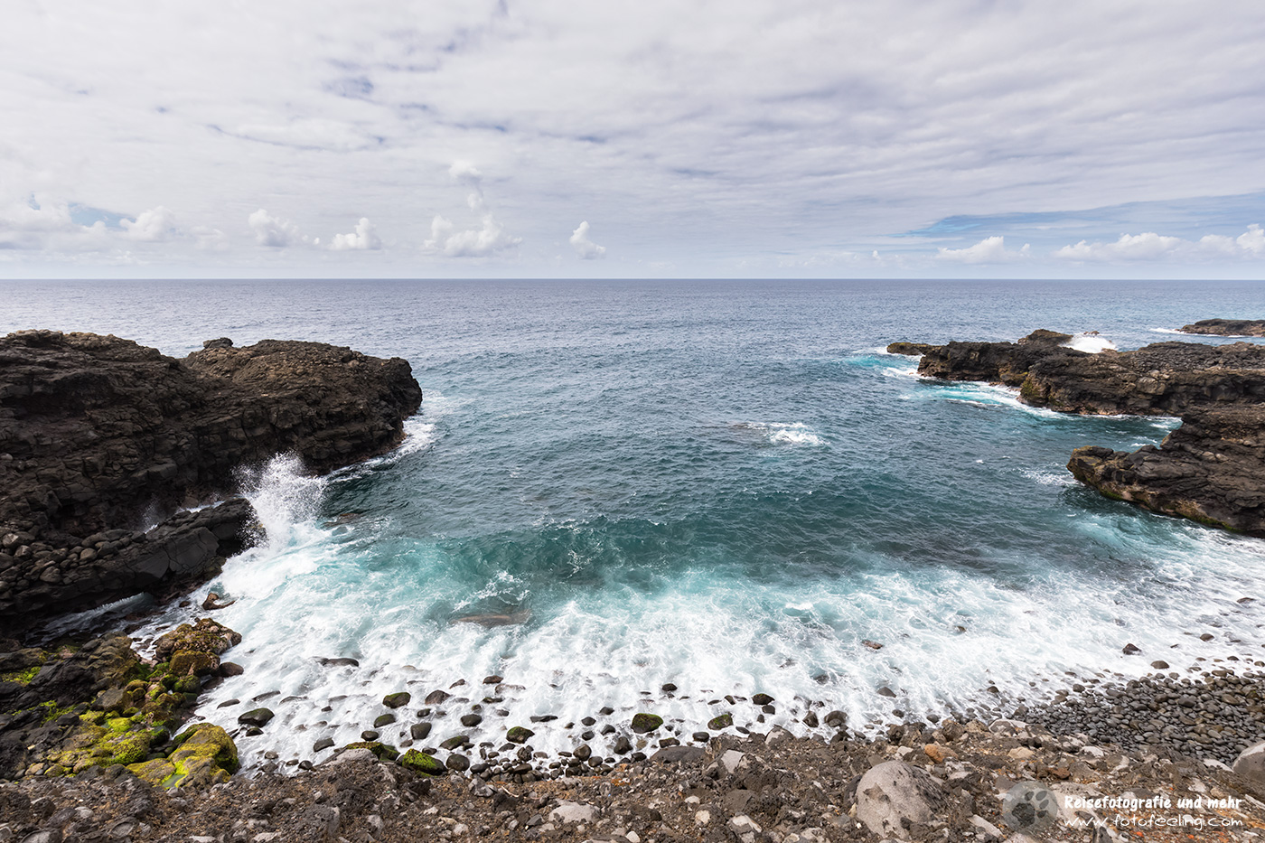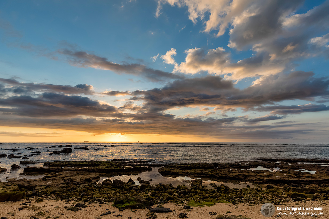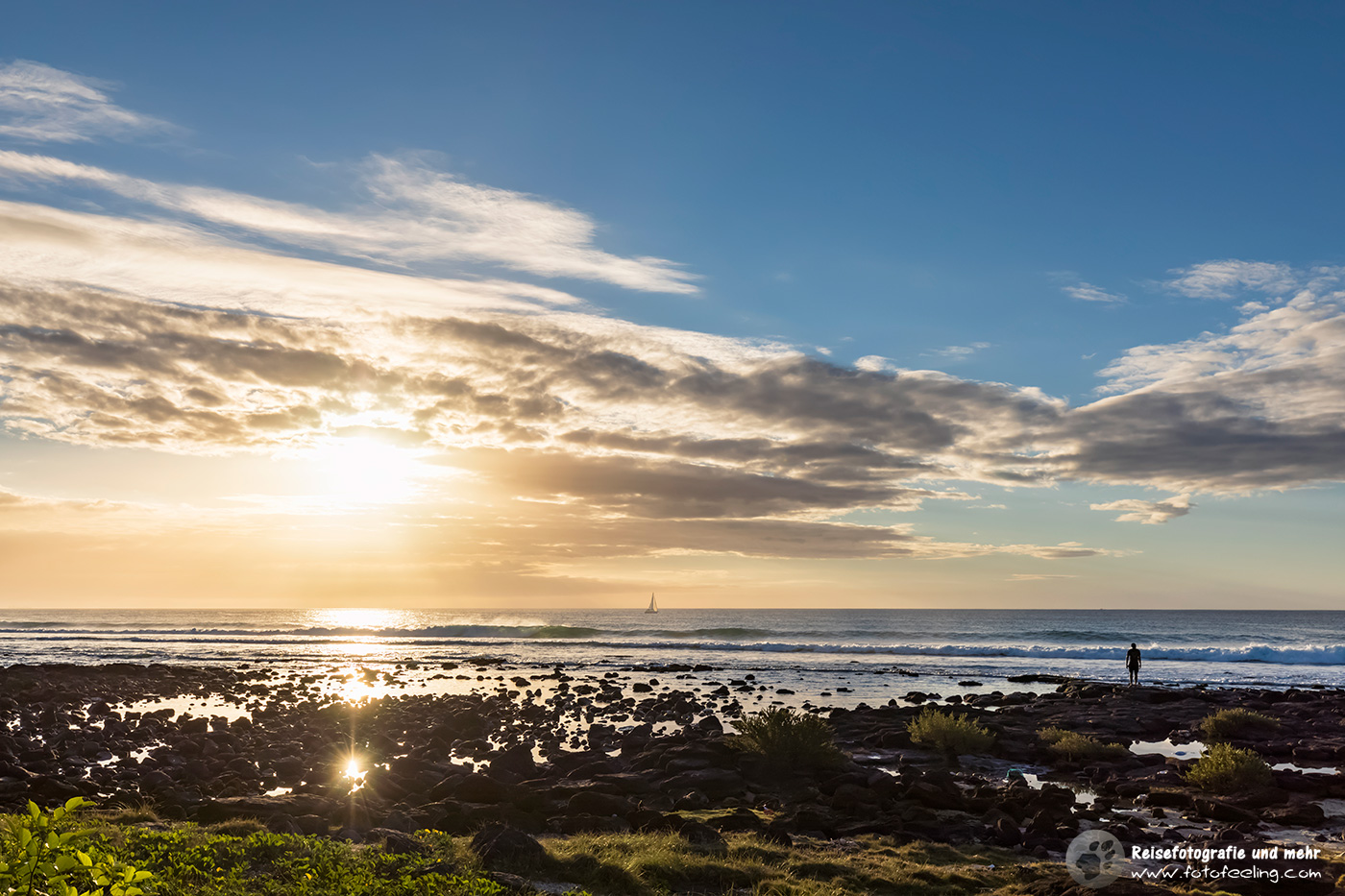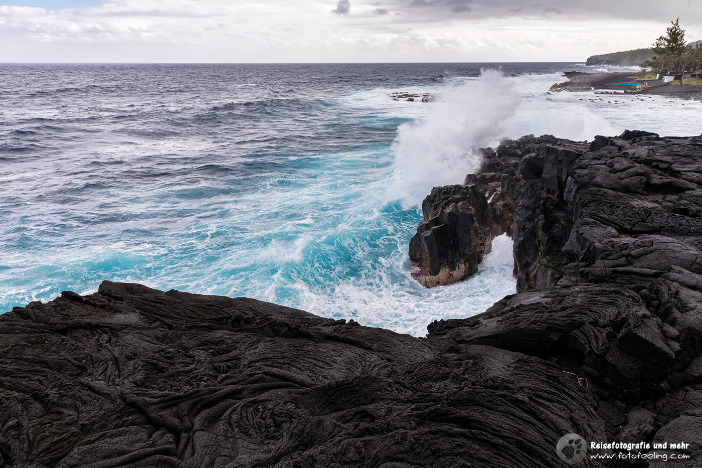 Dann wurde es aber Zeit, denn wir wollten den Sonnenuntergang am Strand von Saint-Leu verbringen. Gerade noch rechtzeitig kamen wir am Blowhole etwas außerhalb von Saint-Leu an. Chris lief zum Blowhole, aus dem auch an diesem Tag meterhoch die Gischt aufstieg und ich ging nach links an der rauen Küste entlang, um ein paar andere Aufnahmen zu machen. An einigen Stellen krachten die Wellen voller Kraft meterhoch an die Küste, aber leider war es zu weit entfernt, als dass ich es noch schaffen könnte, denn die Sonne war nur noch wenig vom Horizont entfernt. Darum setzte ich mich an einer kleinen Bucht auf die Felsen und beobachtete die Wellen, die kraftvoll gegen die steinige Küste schlugen, während die Sonne unaufhaltsam dem Horizont entgegen sank. Weiter vorne sah ich immer wieder die Gischt aus dem Loch hochspritzen. Die Wellen leuchteten schon richtig orange im Gegenlicht. Aus einem Mini Blow Hole zischte es gewaltig und Mini-Fontänen schossen in die Höhe. Viel zu schnell verschwand die Sonne in den Wolken und ich machte mich auf dem Rückweg und schaute noch etwas dem Blowhole zu.