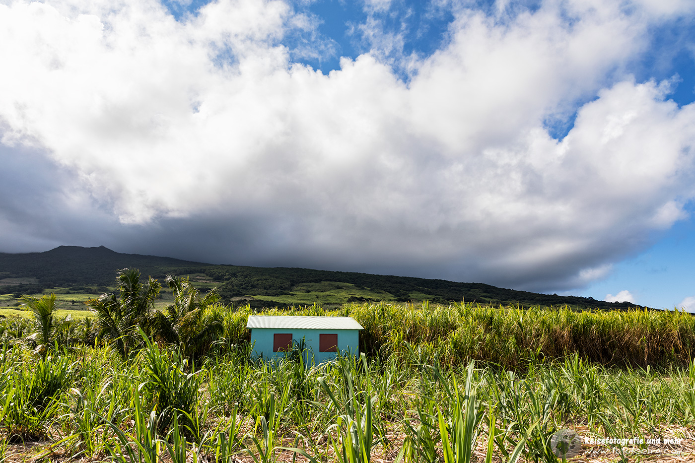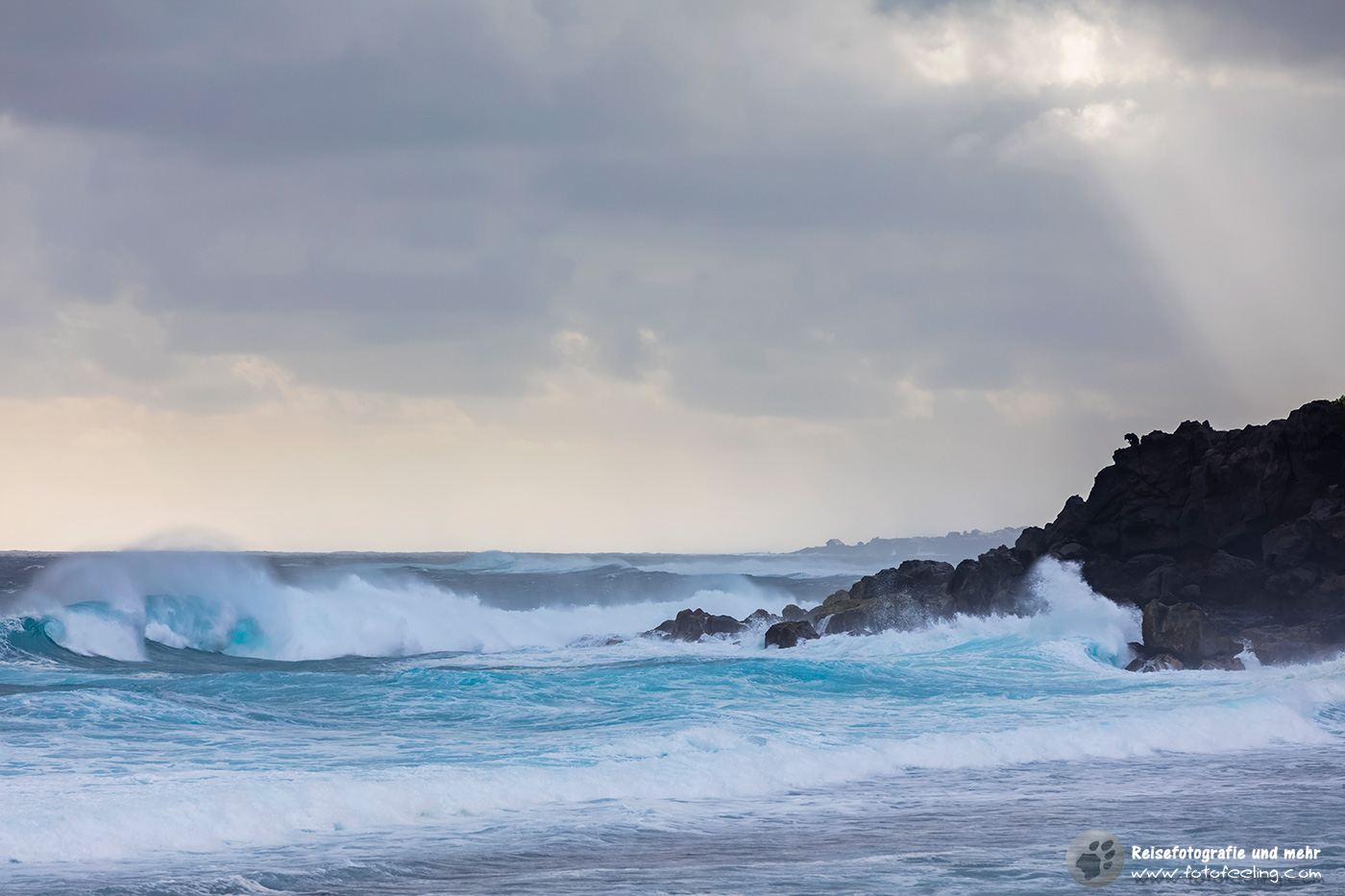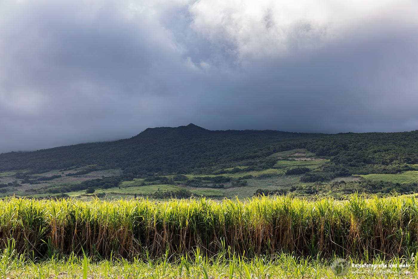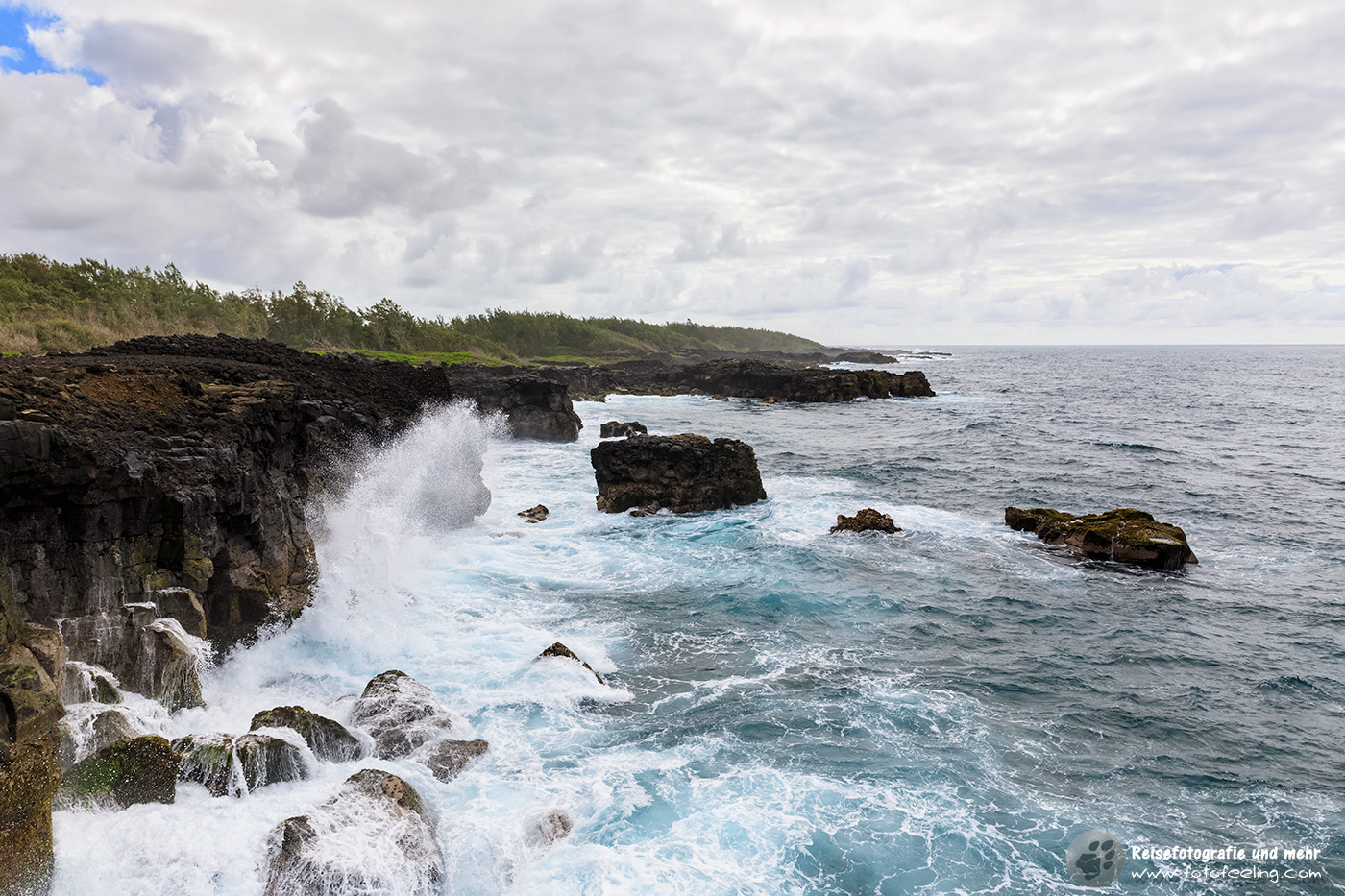 Weiter führte uns unser Weg vorbei an unendlichen Zuckerrohrfeldern. Über der Insel hatten sich wieder dicke Wolken aufgetürmt. Wir machten noch einen Stopp an der Südküste, wo wieder riesige Wellen ungebremst an die Küste prallten. Manchmal war die Gischt so stark, dass auf den Wellen ein Regenbogen erschien.