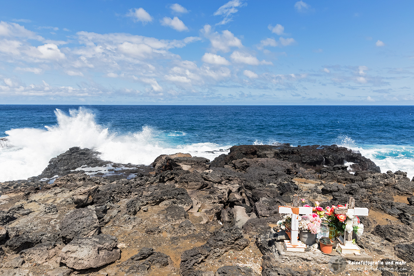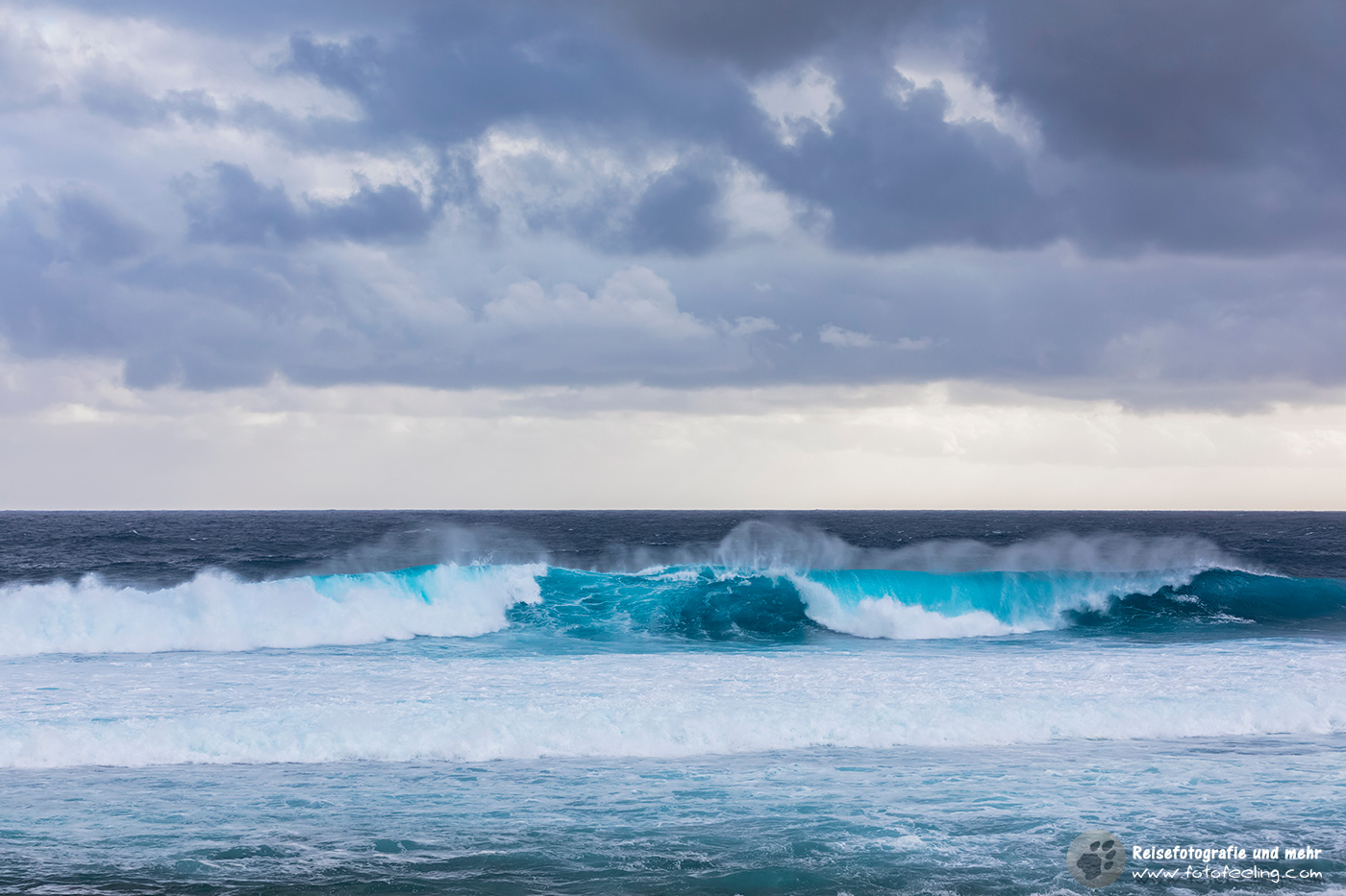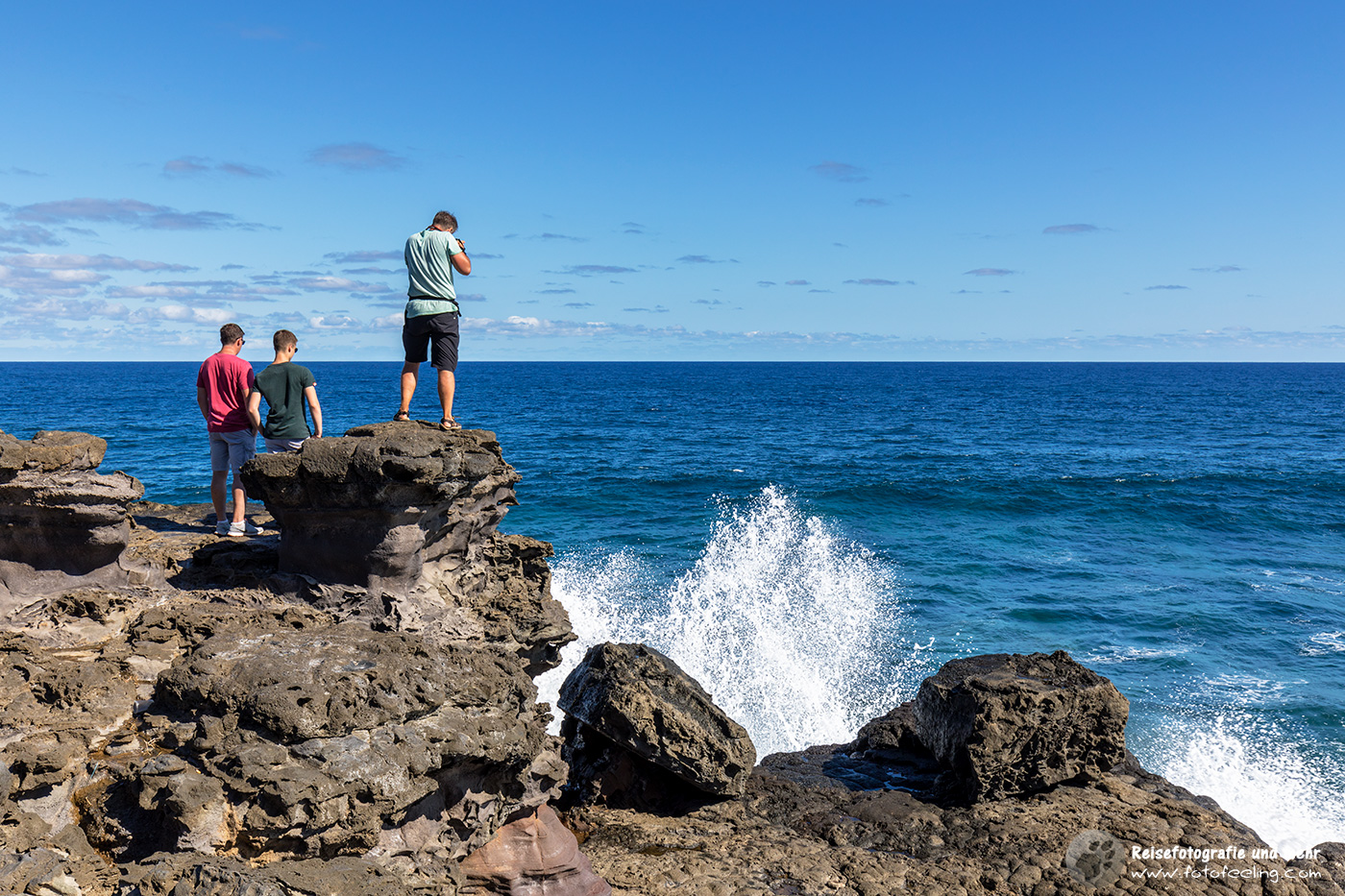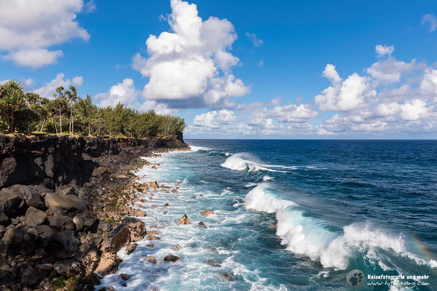 Weiter führte uns unser Weg vorbei an unendlichen Zuckerrohrfeldern. Über der Insel hatten sich wieder dicke Wolken aufgetürmt. Wir machten noch einen Stopp an der Südküste, wo wieder riesige Wellen ungebremst an die Küste prallten. Manchmal war die Gischt so stark, dass auf den Wellen ein Regenbogen erschien.